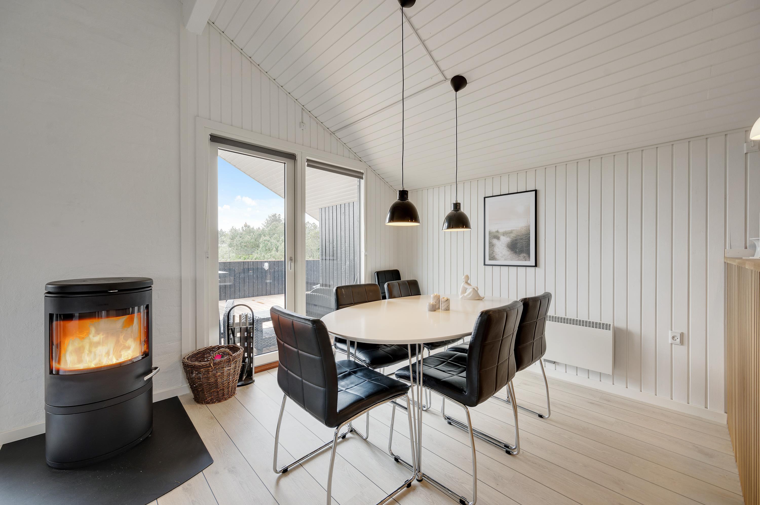 Køkkenet er udstyret med opvaskemaskine, mikroovn og køleskab med lille fryser. Køkkenet står i åben forbindelse med den hyggelige stue, som bl.a. er udstyret med en god brændeovn og fladskærm. I stuen er der en stor alkove, hvor du kan slappe af og hygge dig, f.eks. med en god bog. Her er desuden gratis trådløst internet.