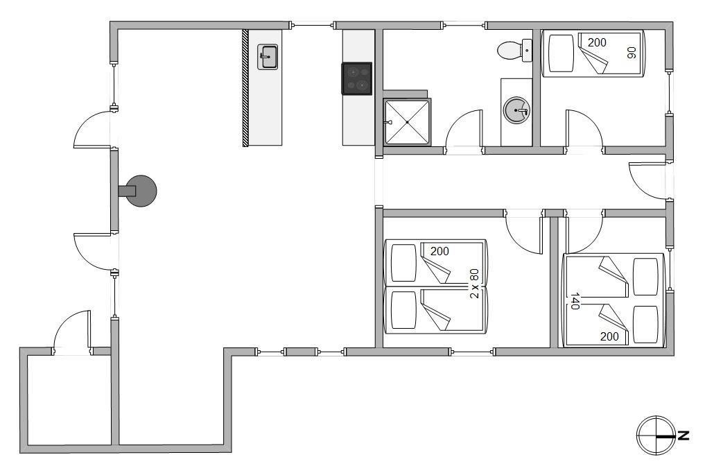 Sommerhuset har plads til i alt 4 personer i de 3 soverum. Her er to soveværelser med en dobbeltseng, et soveværelse med 1 enkeltseng.