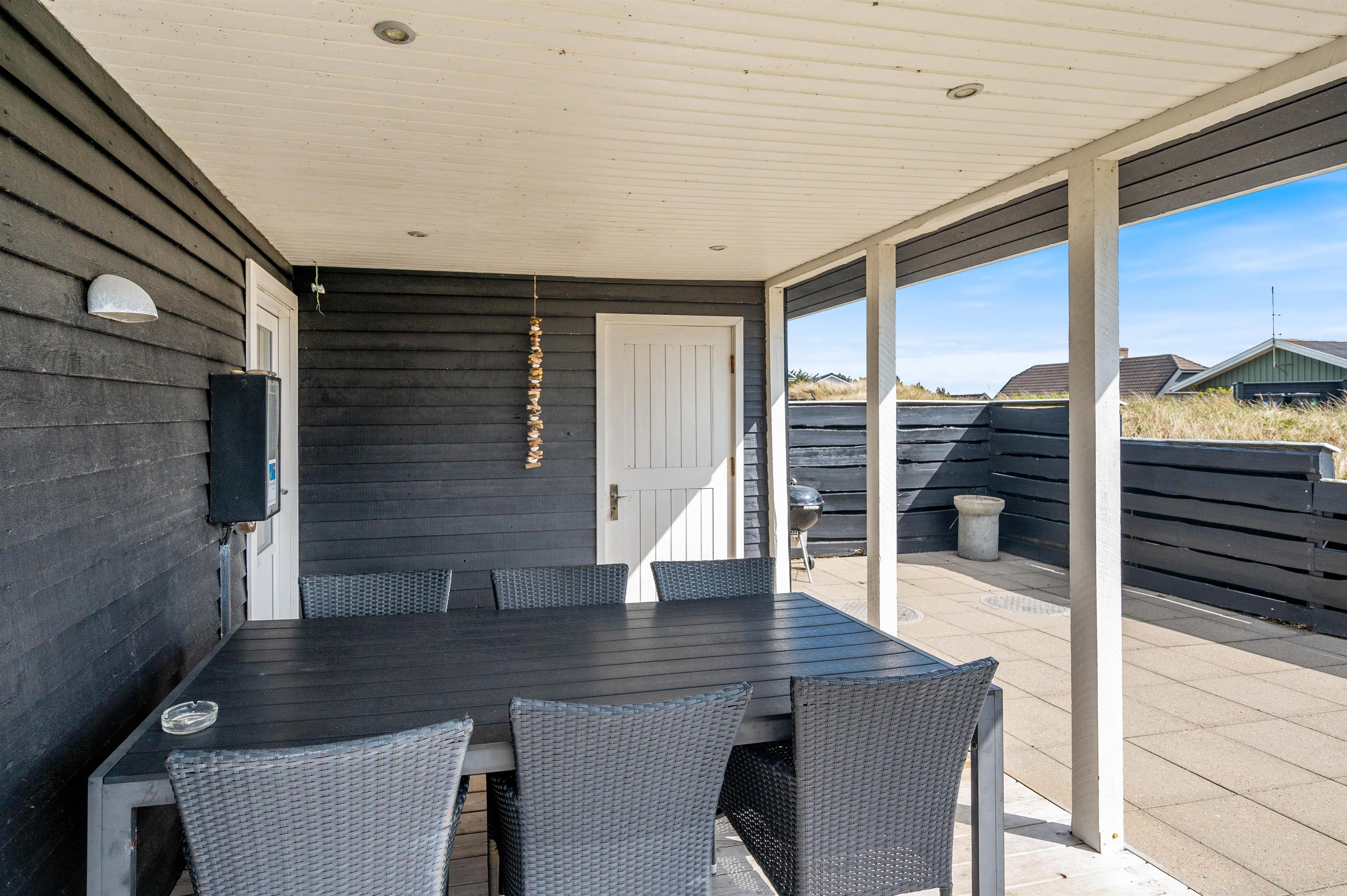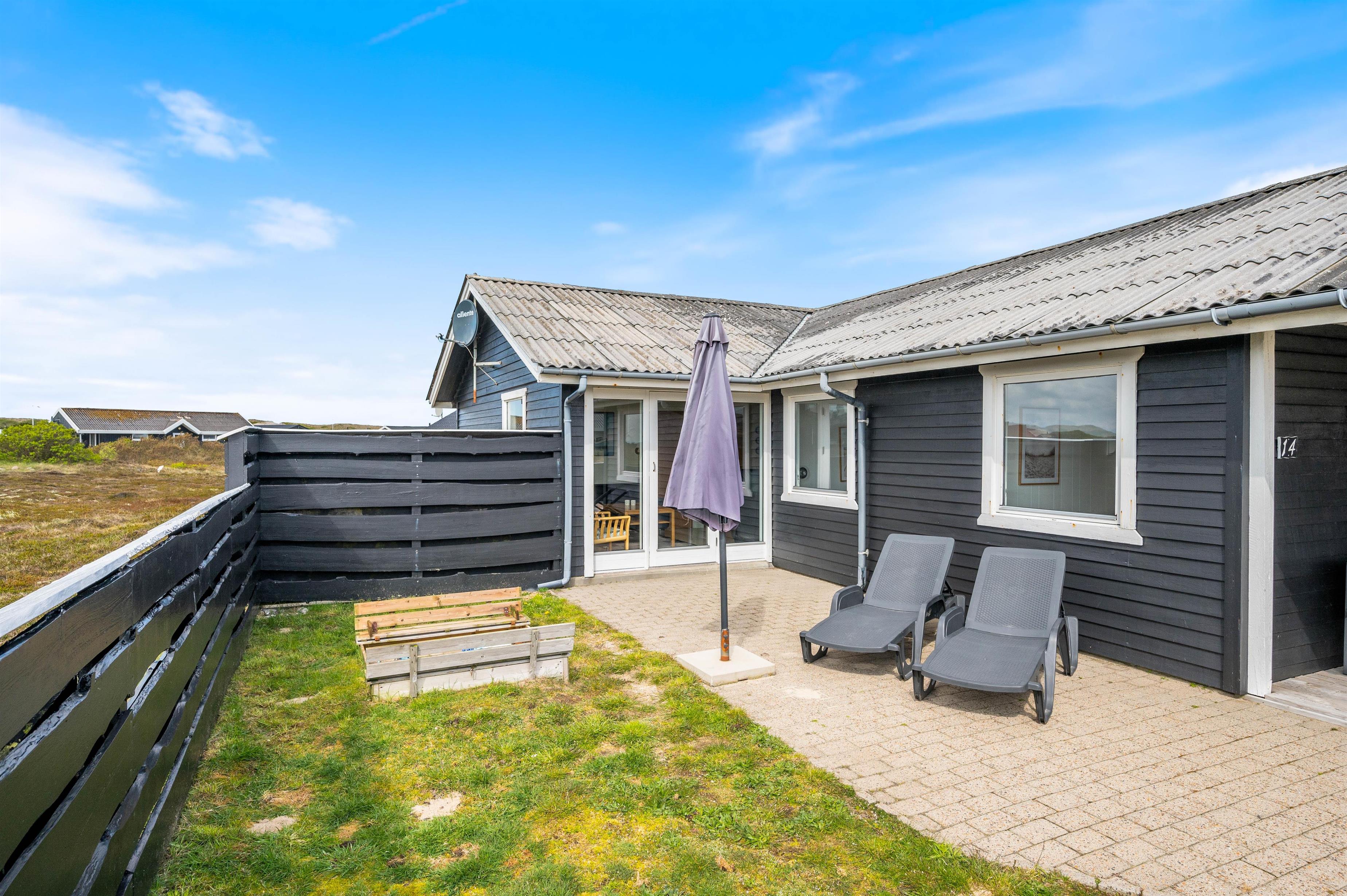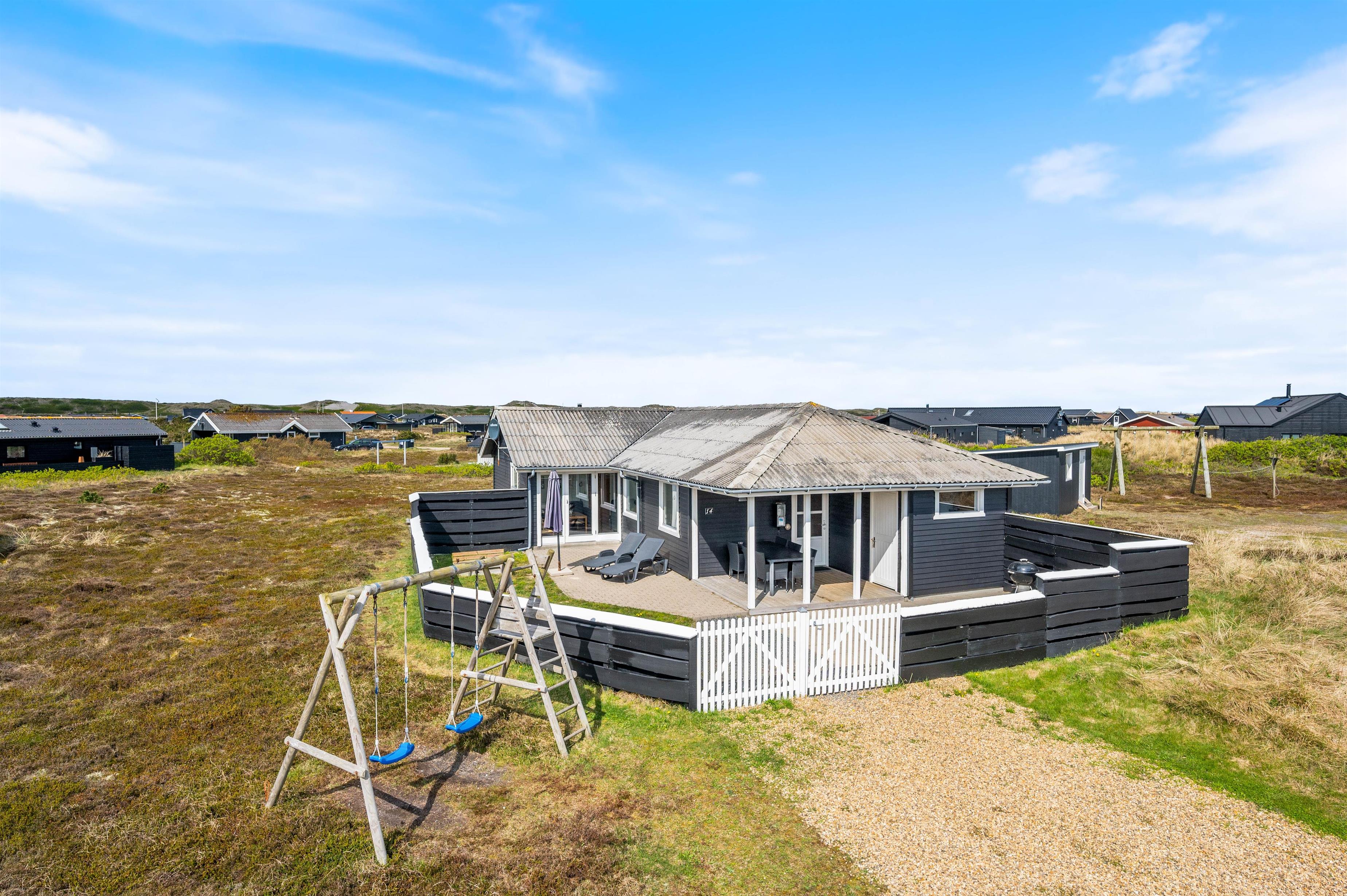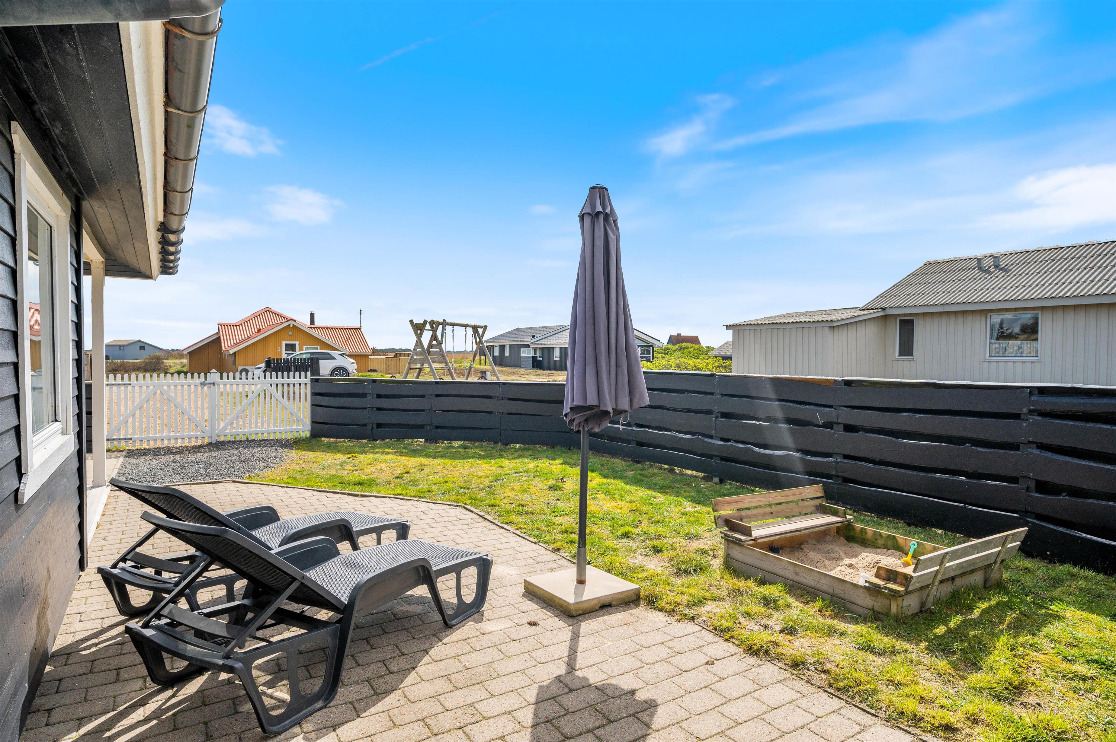 Med til huset hører en stor, lukket terrasse, som er rigtig praktisk, hvis I har små børn eller hunde med. Her kan de få lov til at løbe frit, mens I daser i solsengene eller tænder op i grillen og gør klar til en lækker middag. Til børnene er der også sørget for et gyngestativ og en sandkasse.