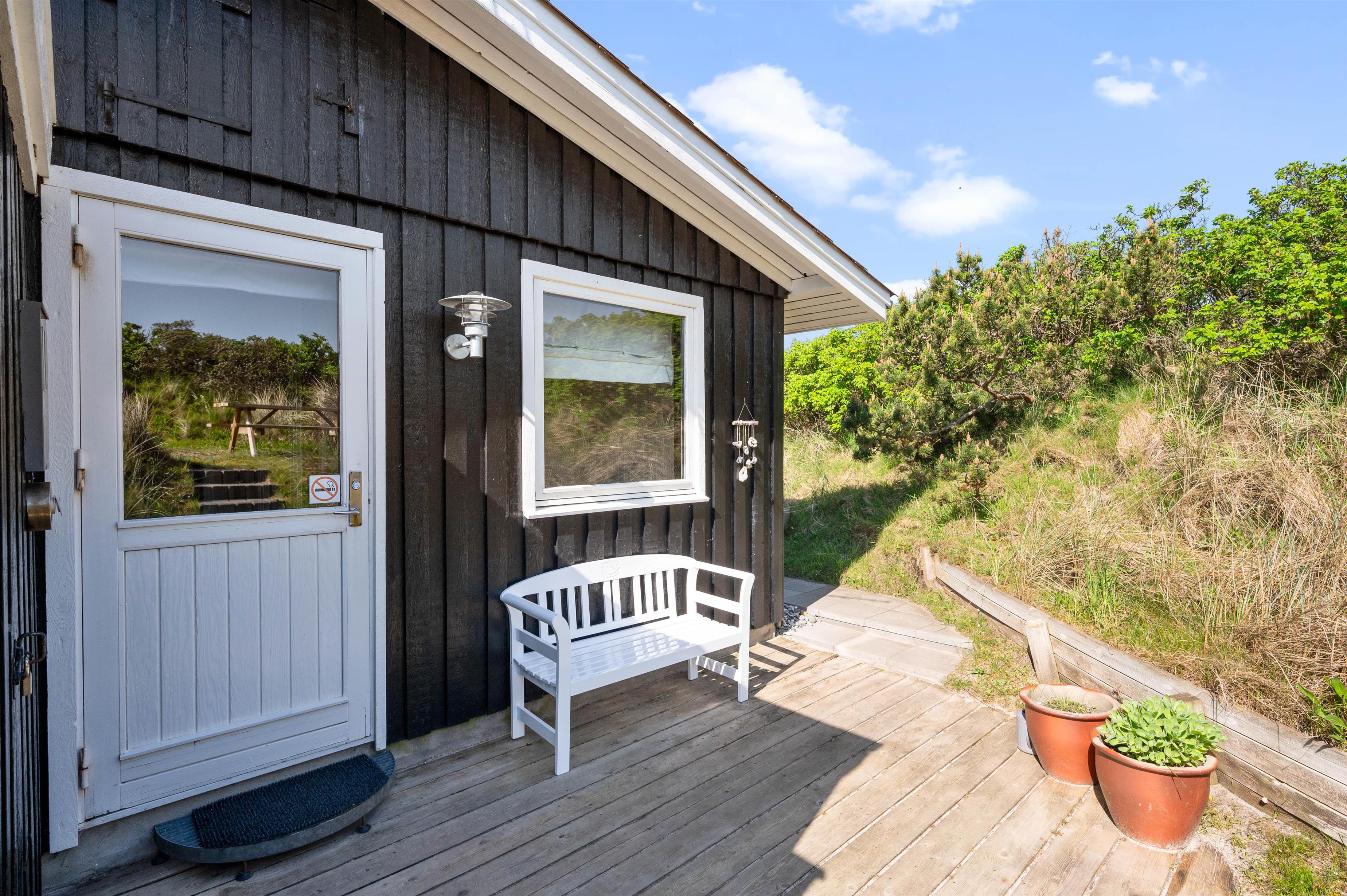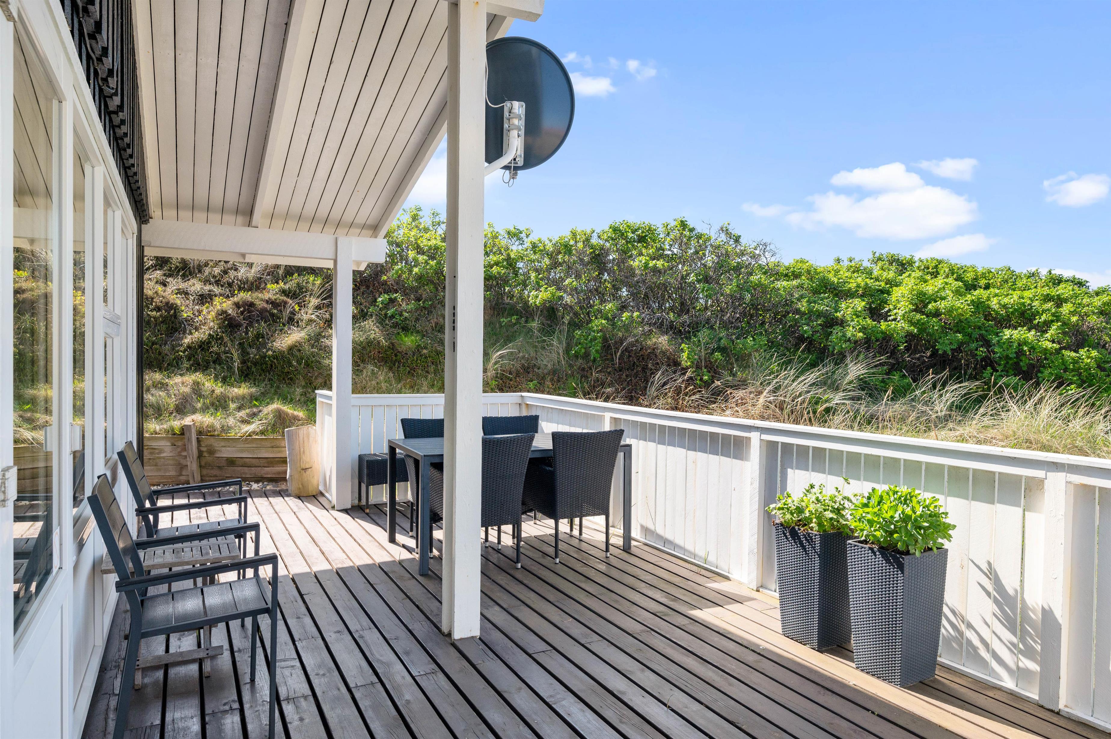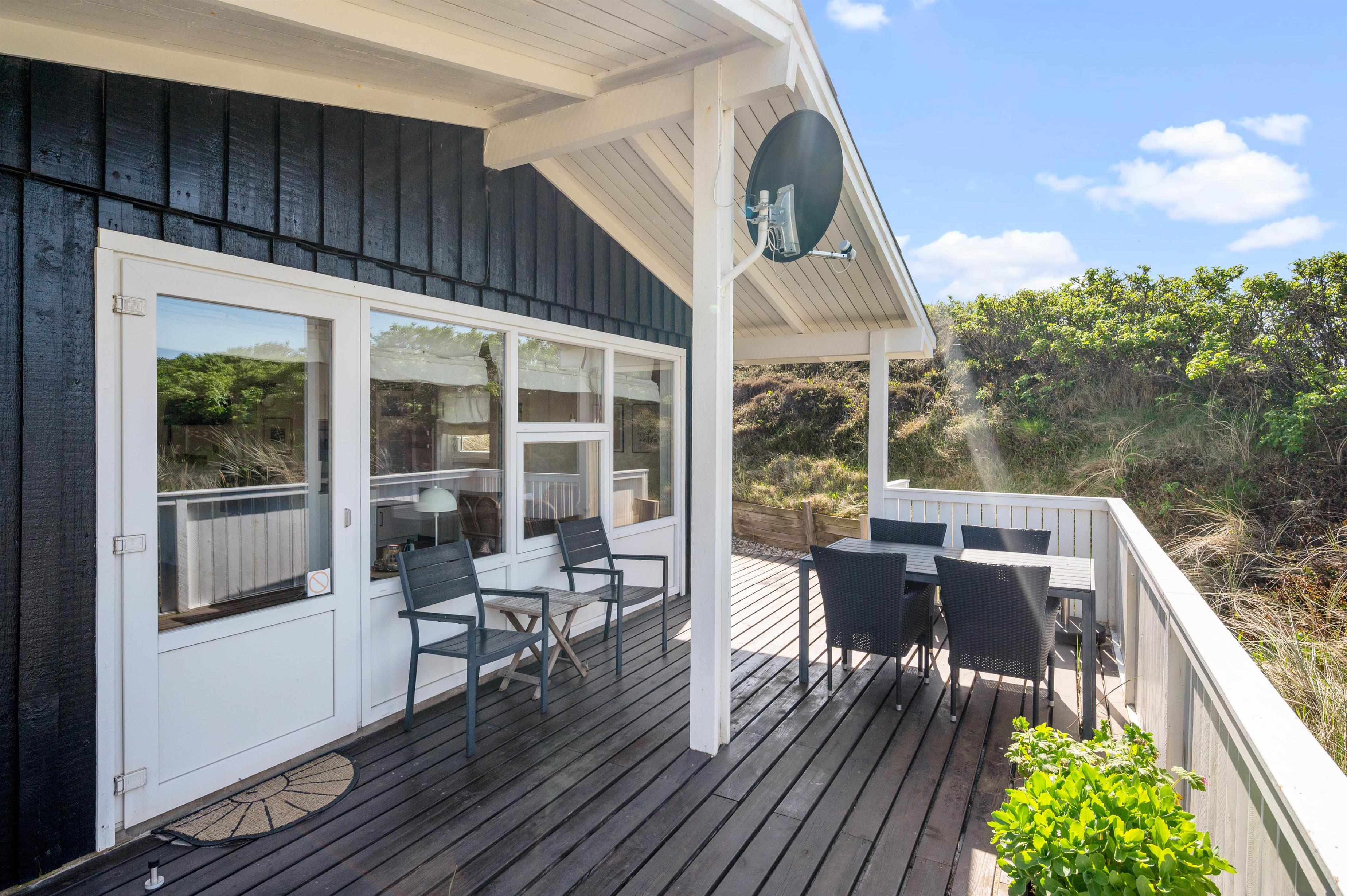 Og da feriehuset er placeret i en fordybning på en god naturgrund, kan I her holde en udforstyrret ferie med læ på de to dejlige terrasser, hvor I rigtig kan nyde solskinsdagene og de lune sommeraftener.