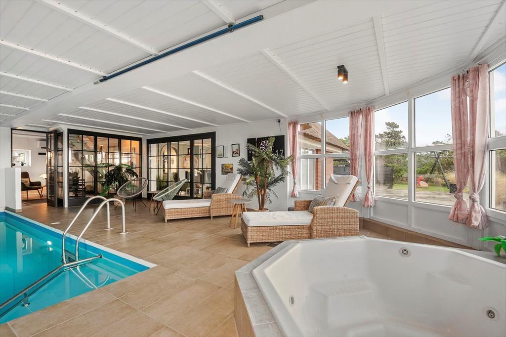 Der er virkelig lagt op til en førsteklasses livsnyderferie på Ingridsvej 12. Dette flotte sommerhus er nemlig udstyret med et stort aktivitetsrum, en lækker poolafdeling og et herligt terrassemiljø med spa og sauna, og så er der ovenikøbet blot 350 meter til Blåvands dejlige badestrand.