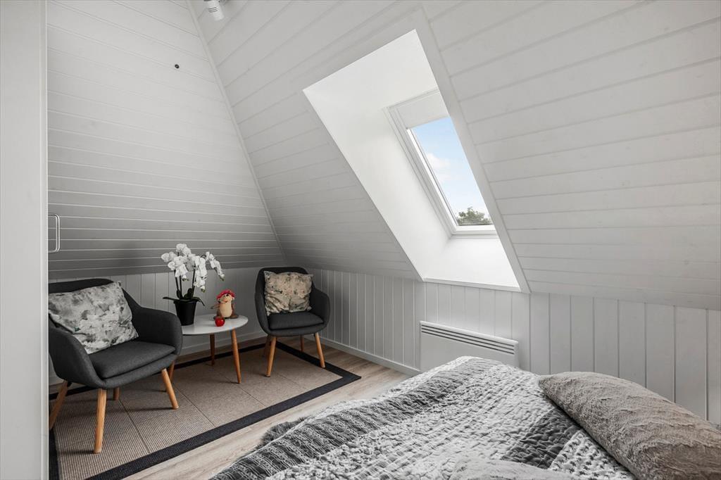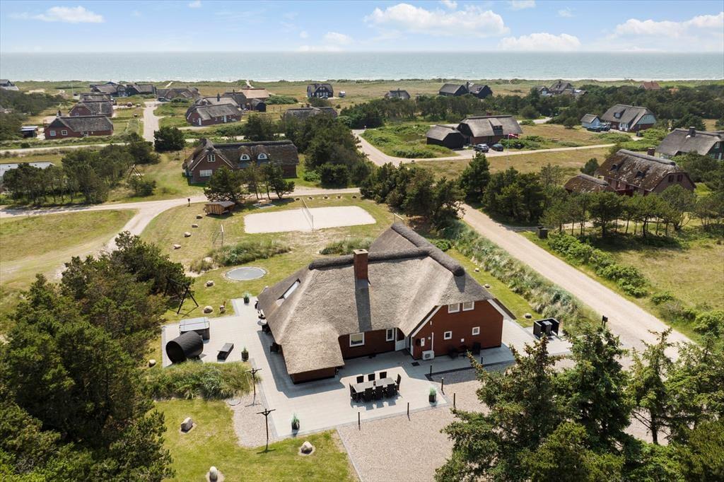 Inde i det stråtækte og særdeles velholdte sommerhus er atmosfæren lys og venlig – ikke bare i stueplan, men også på førstesalen. I alt på de to etager har I 250 m2 at brede jer på, og det betyder også, at 10 personer sagtens kan holde ferie sammen. Fire af sommerhusets fem soveværelser er placeret på førstesalen, der derudover byder på en skøn opholdsstue og et hyggeligt aktivitetsrum. Hvis I ikke bruger tiden heroppe på at spille bordfodbold og airhockey eller slappe af i sofaafdelingen, kan I samles i stueetagen – for eksempel til et lækkert måltid mad i spisestuen, der ligger i åben forbindelse med et veludstyret køkken. Et soveværelse og to badeværelser ligger også her i stueplan foruden poolafdelingen, hvor I kan benytte jer af saunaen, dampkabinen, spabadet og selve poolen.