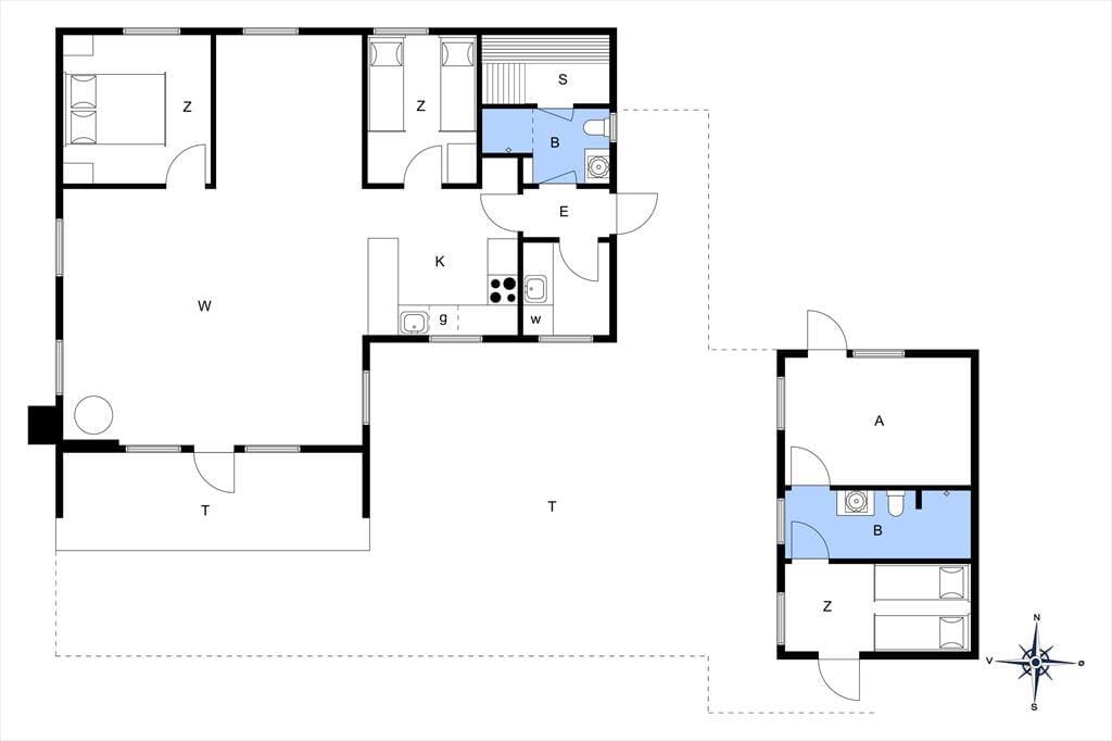 I huset er der et soveværelse med en god dobbeltseng, samt dertil et værelse med 2 enkeltsenge. Badeværelset er veludnyttet, og herfra er der indgang til saunaen. Det sidste rum i huset er et praktisk bryggers med skabsplads og vaskemaskine. Lige ud af døren og henover terrassen, og I træder ind i det hyggelige tilstødende anneks, som har et fint lille værelse med to enkeltsenge og et rummeligt, lyst badeværelse.