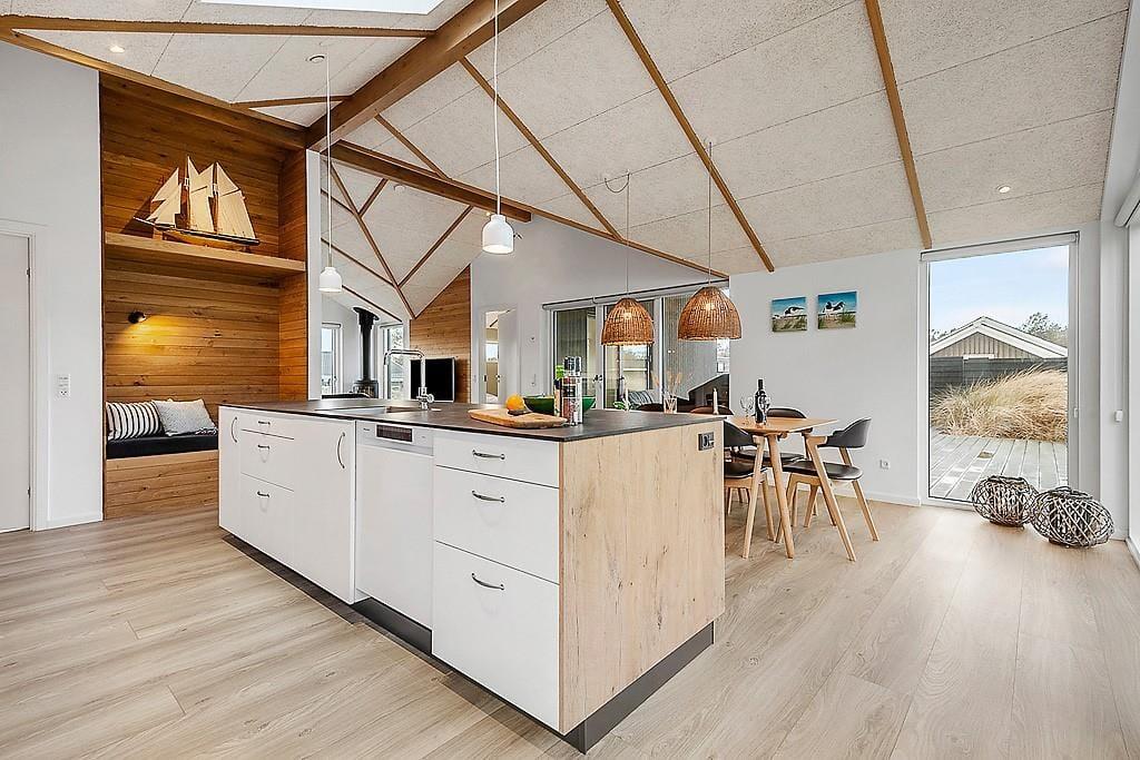 Sommerhus i Blåvand Strand og By, Vestjylland, med plads til 8 voksne. Der er en hyggelig indretning med bl.a. brændeovn, og du finder desuden vaskemaskine, opvaskemaskine og tørretumbler i boligen.