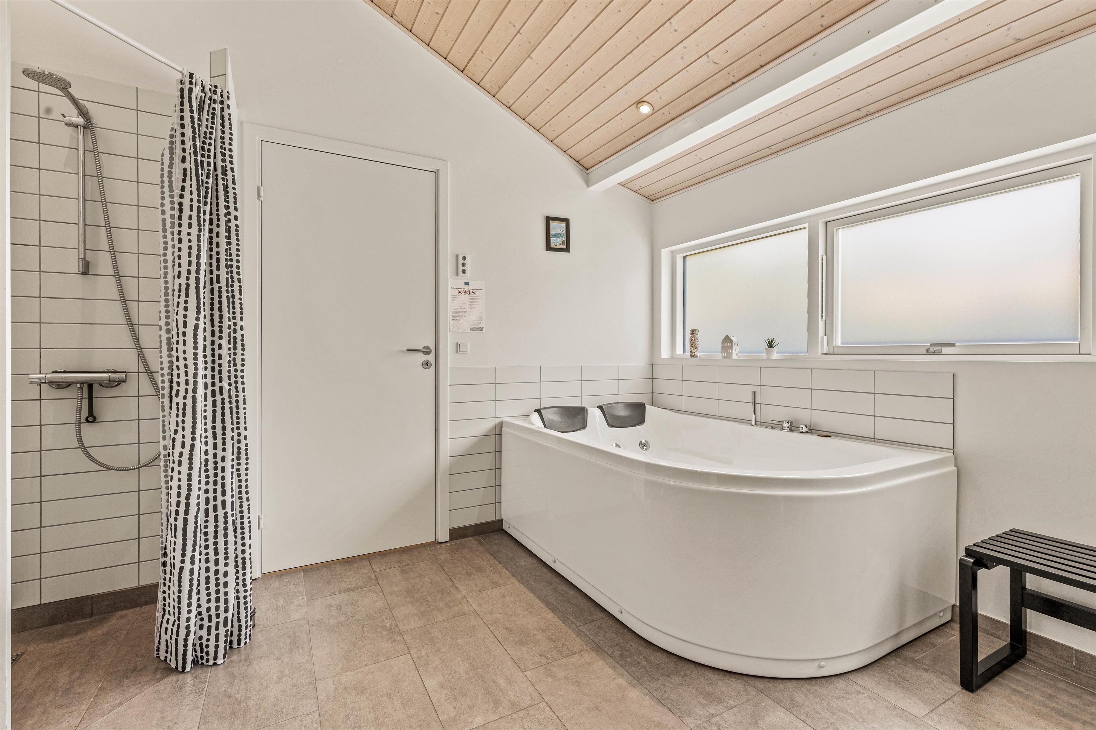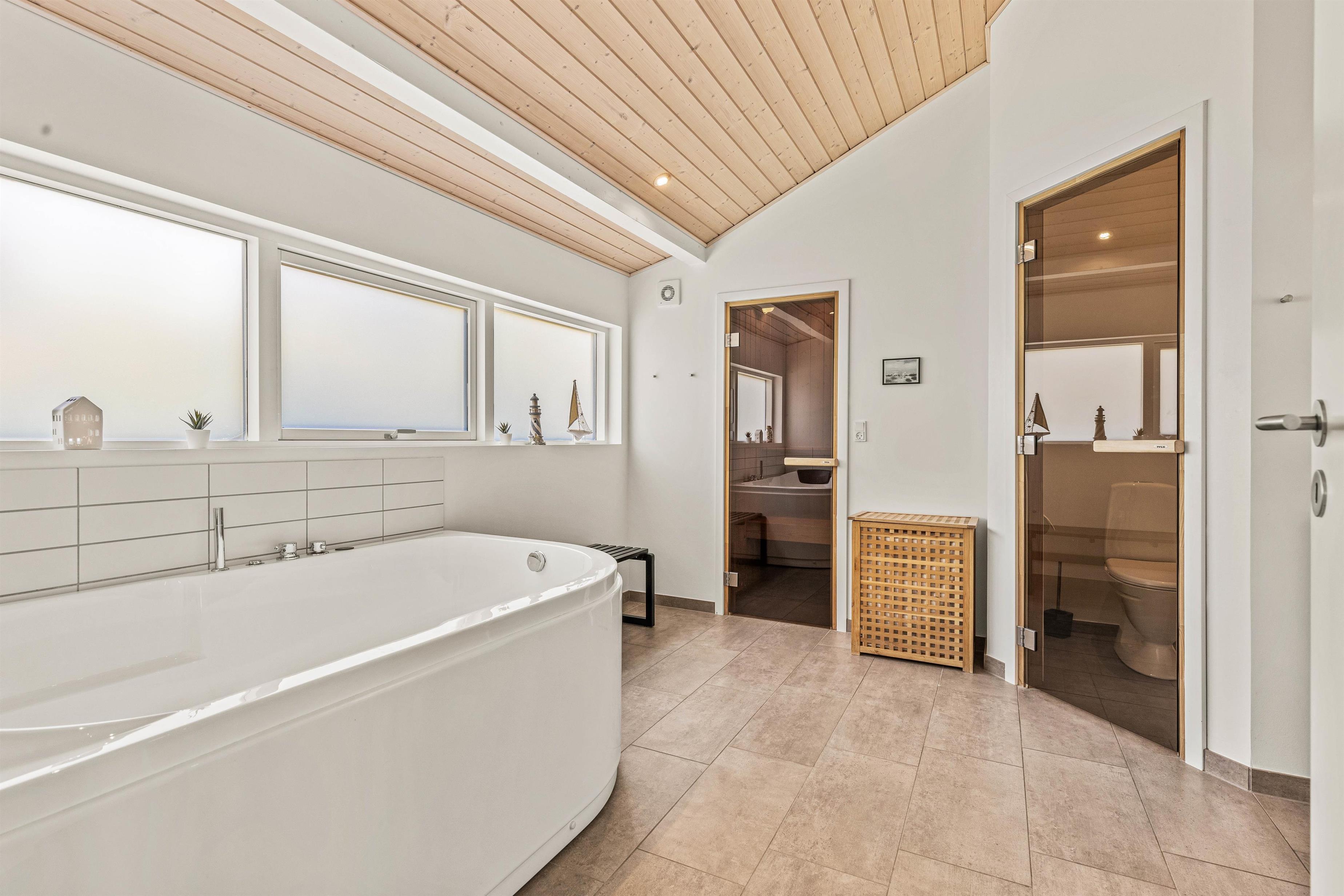Huset byder på hele tre flotte badeværelser, hvoraf det ene er en del af den helt nye poolafdeling. I det største kan I forkæle jer selv ekstra med både 2-personers spa og sauna – ren luksus efter en dag ved stranden.