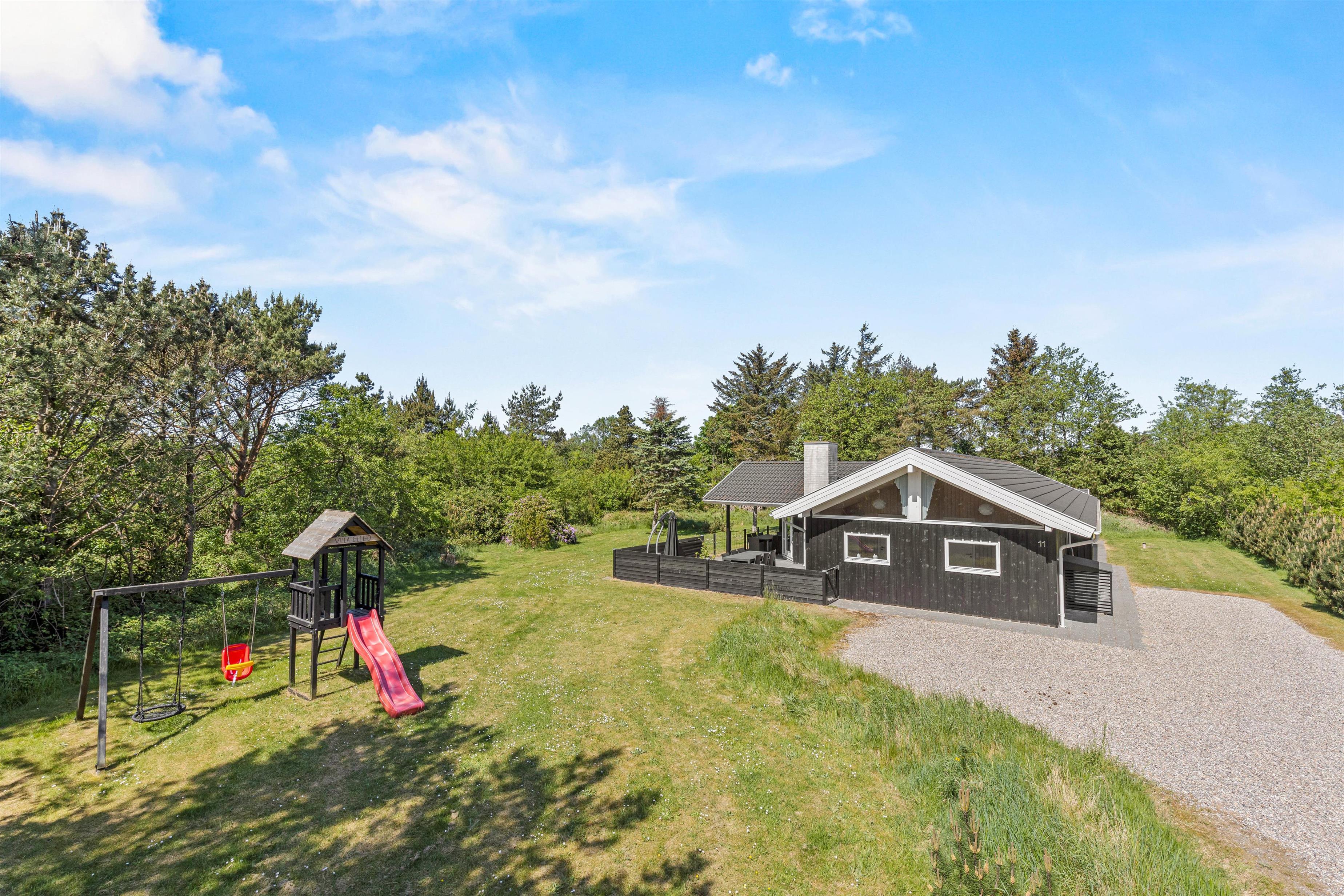 Den store, ugenerte naturgrund på 2379 m2 med masser af fyrtræer byder på masser af plads til leg og liv: fodboldmål, sandkasse, bålplads, klatretårn, rutsjebane og gynger – et paradis for familiens yngste.