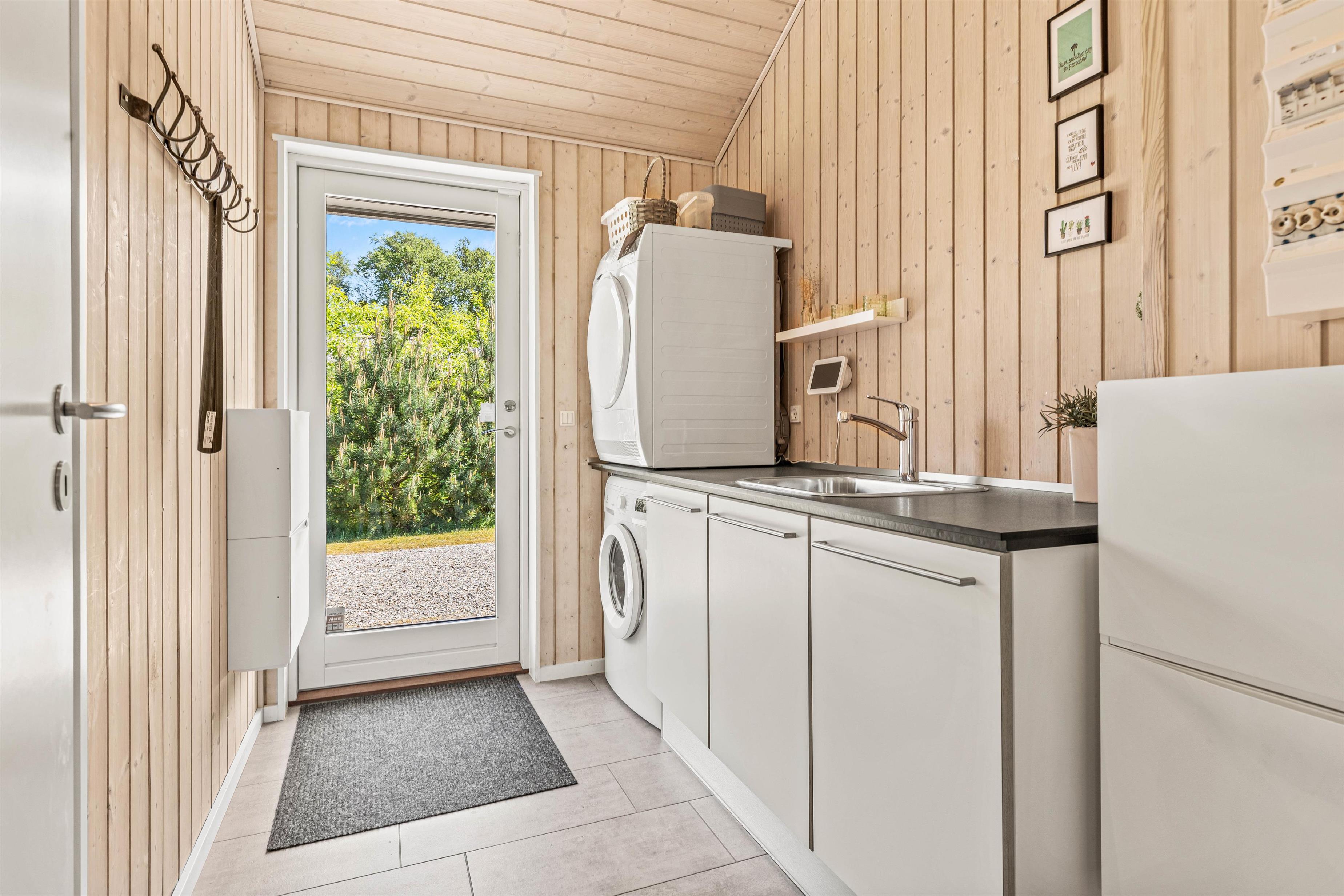 Den overdækkede terrasse på 23 m² med terrassevarmer gør det muligt at nyde lange aftener under åben himmel – selv når duggen falder. Her er også et praktisk udekøkken og en gasgrill, klar til at skabe lækre grillmiddage uden besvær. Når solen skinner, står liggestolene klar til ren afslapning, og den udendørs bruser giver sommerhusferien den helt rigtige luksusfornemmelse.