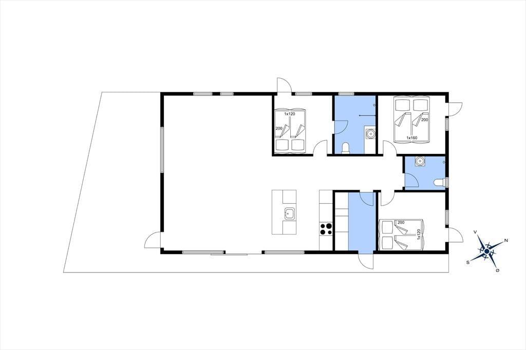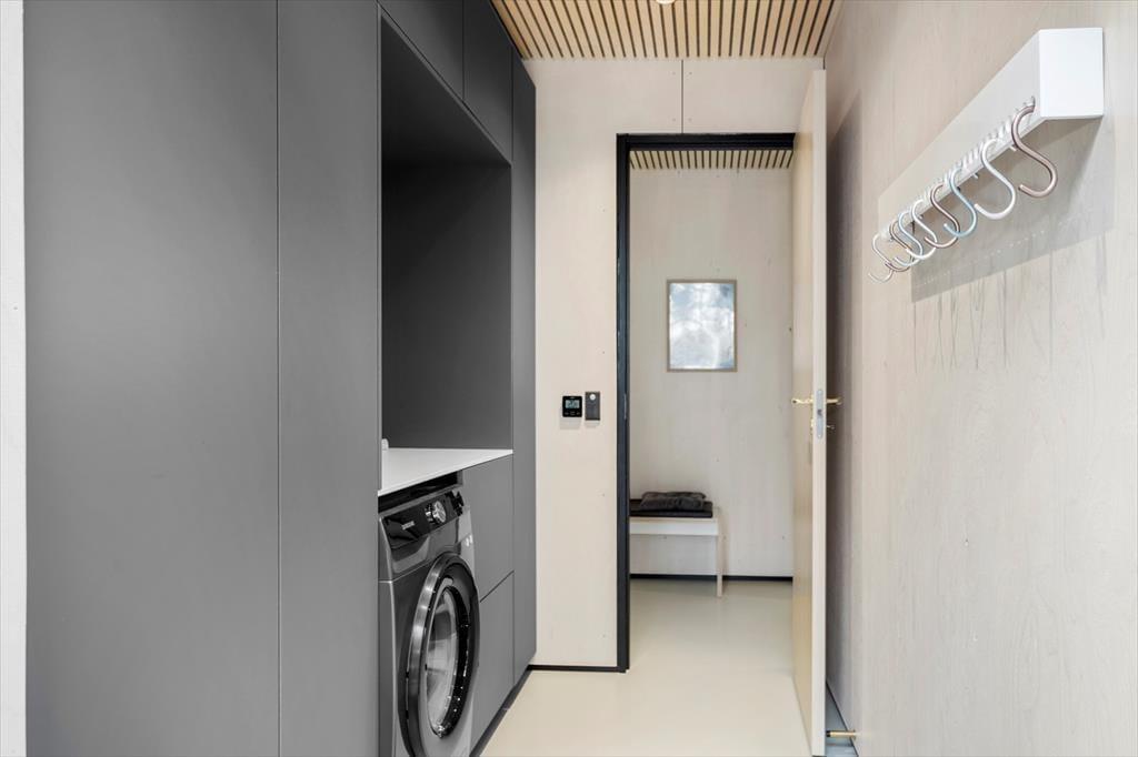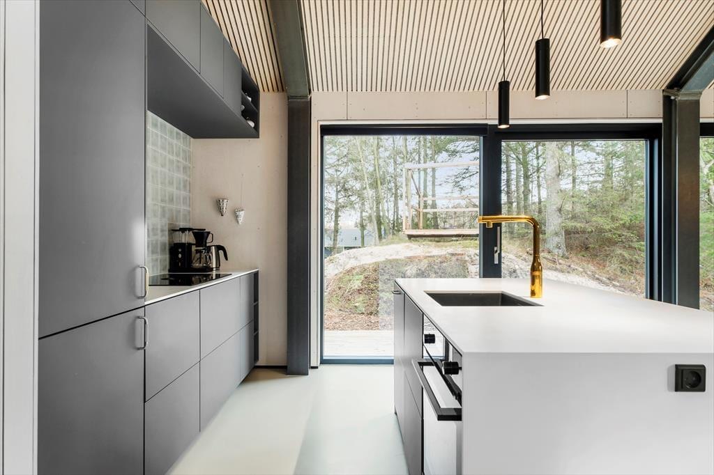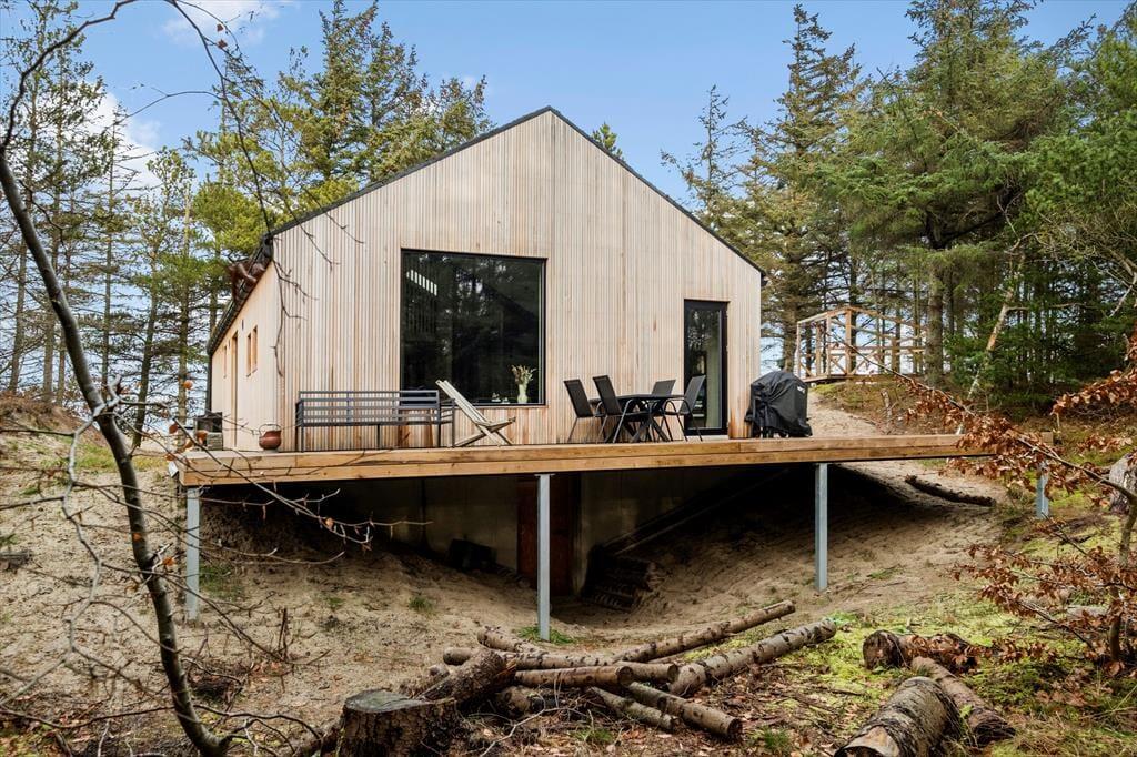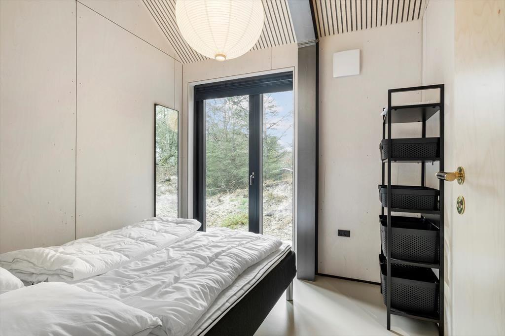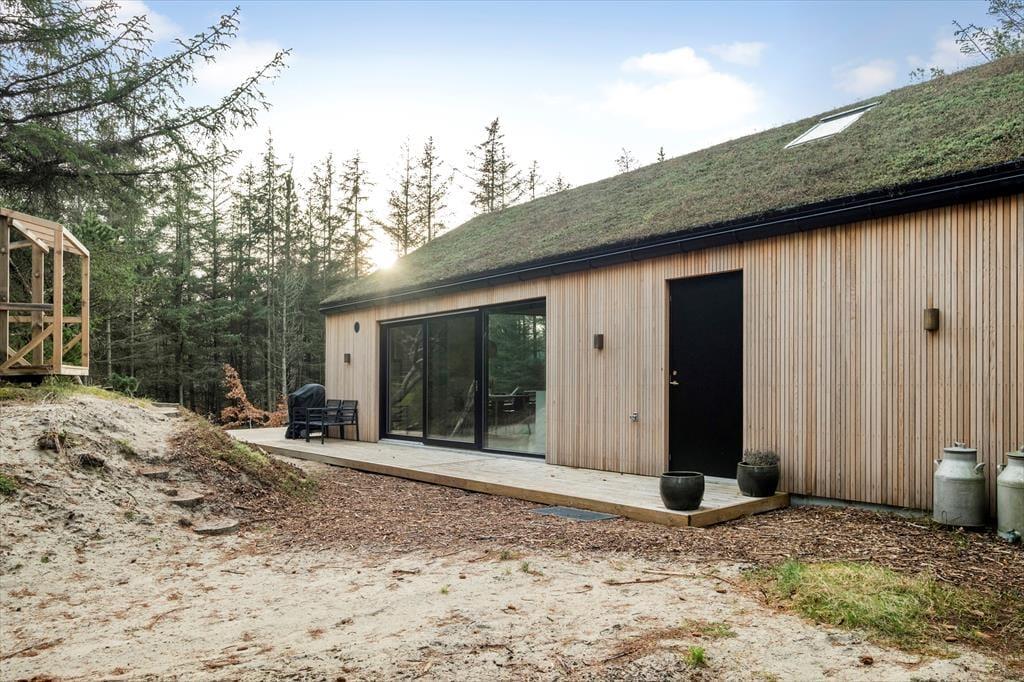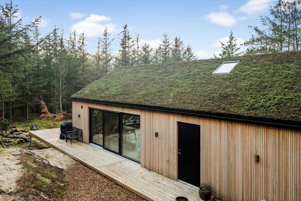 Med grønt tag og flot træfacade passer sommerhuset perfekt til at ligge i et skovbryn. Og den kuperede naturgrund bliver inviteret helt indenfor takket være de store vinduespartier: Tænk, at kunne kigge lige ud på knejsende fyrretræer og måske et forbipasserende rådyr, mens I slapper af med en kop kaffe. Planløsningen består af to brusebadeværelser og tre soveværelser med dobbeltseng, og der er også en entré med vaskemaskine og godt med garderobeplads. Stuen imponerer med sin flotte loftshøjde og de førnævnte kæmpestore vinduer, og det lækre køkken indbyder til at gøre madlavningen til et fælles hyggeprojekt for de, der elsker at kokkerere. Listeloftet sørger for en god akustik og er derudover kønt at kigge på, og så er der for øvrigt gulvvarme overalt i huset.