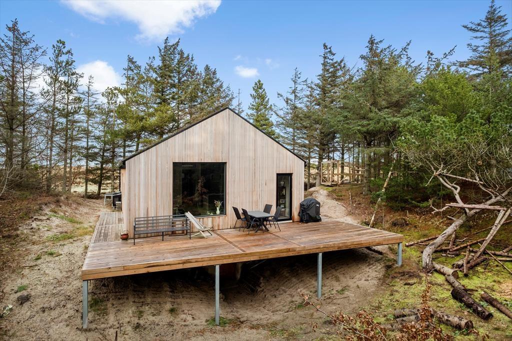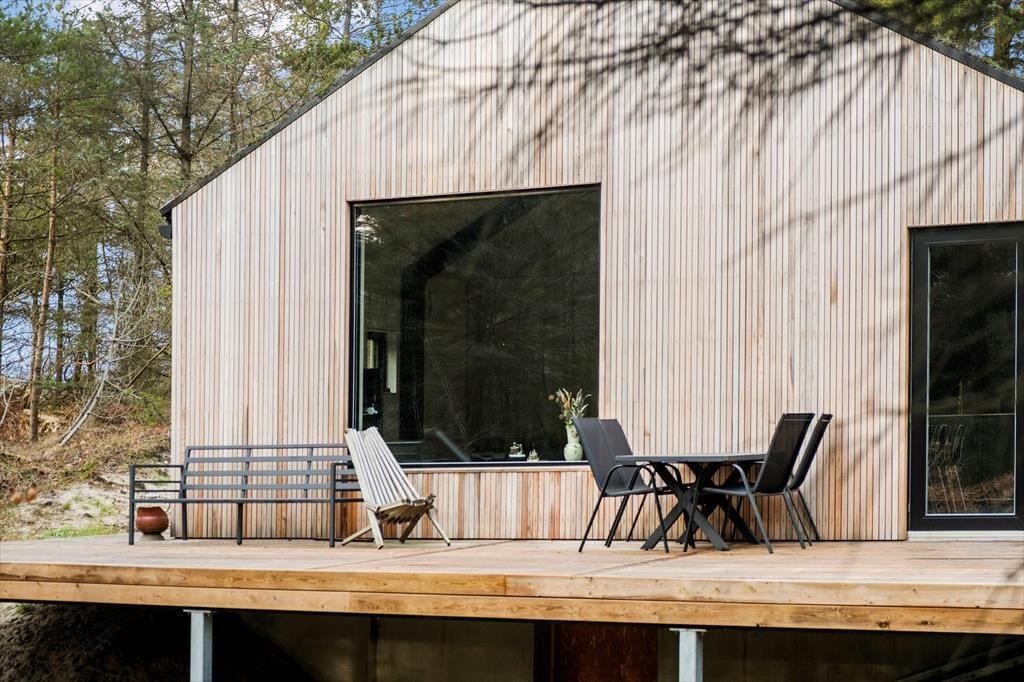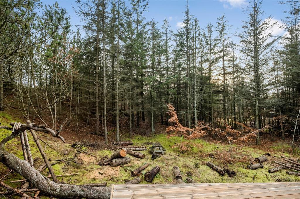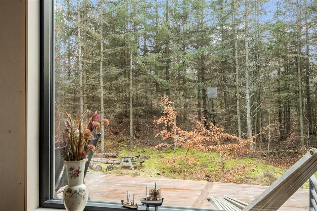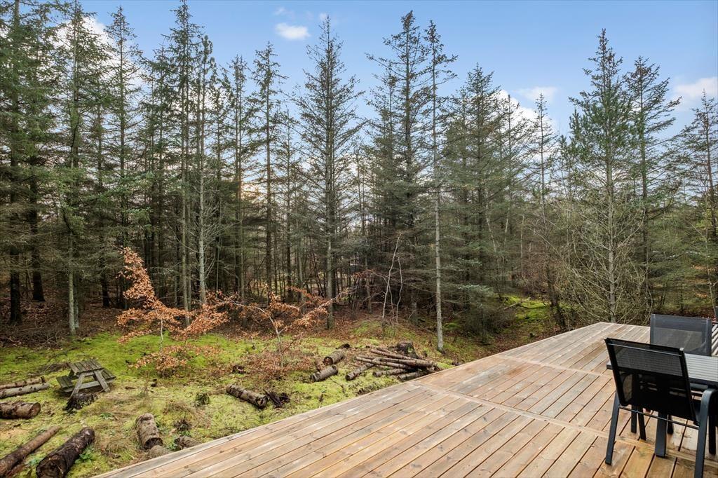 Syd for sommerhuset breder terrassedækket sig ud, og det er det oplagte sted at slå sig ned med en god bog eller en lækker frokost i solen. Naturgrunden er kuperet, så i denne ende hæver terrassen sig over jorden, og det føles nærmest som at sidde på en tribune i første parket til det betagende skovlandskab. Fra trætoppene er der måske fuglesang som underholdning, og ellers kan I bare nyde freden i de ugenerede omgivelser.