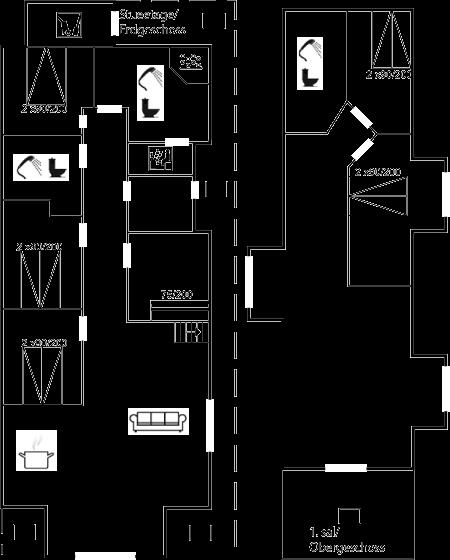 Køkkenet er udstyret med 1 køleskab. Der er 5 gasblus, varmluftovn, mikrobølgeovn samt opvaskemaskine.