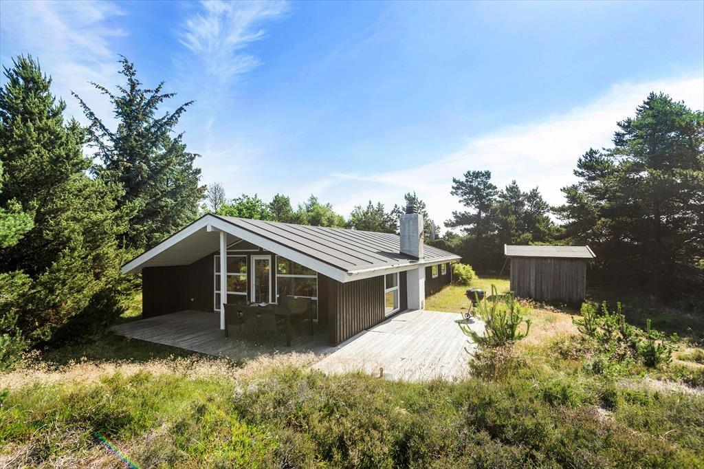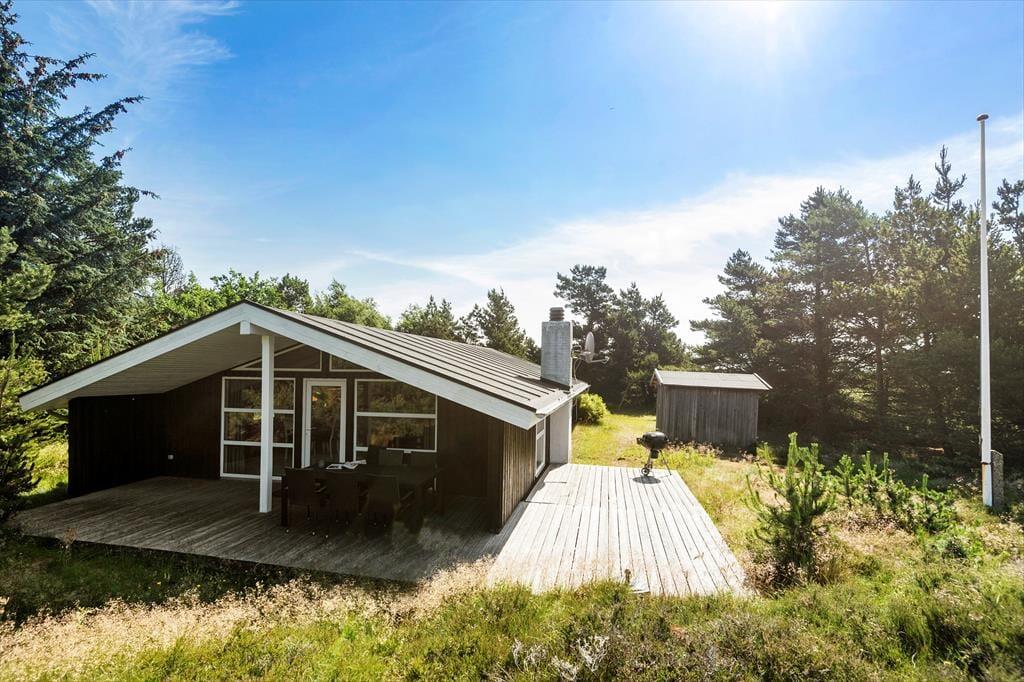 Stuens havedør giver jer direkte adgang til en stor og skøn terrasse. Det er et herligt sted at falde i staver, mens I nyder det gode vejr og udsigten over hedelyng og fyrretræer – og der er for øvrigt både en overdækket og en åben afdeling at vælge imellem. I kan også slå jer ned på østsiden af sommerhuset, hvor der ligger endnu en terrasse, som især er solrig først på dagen.