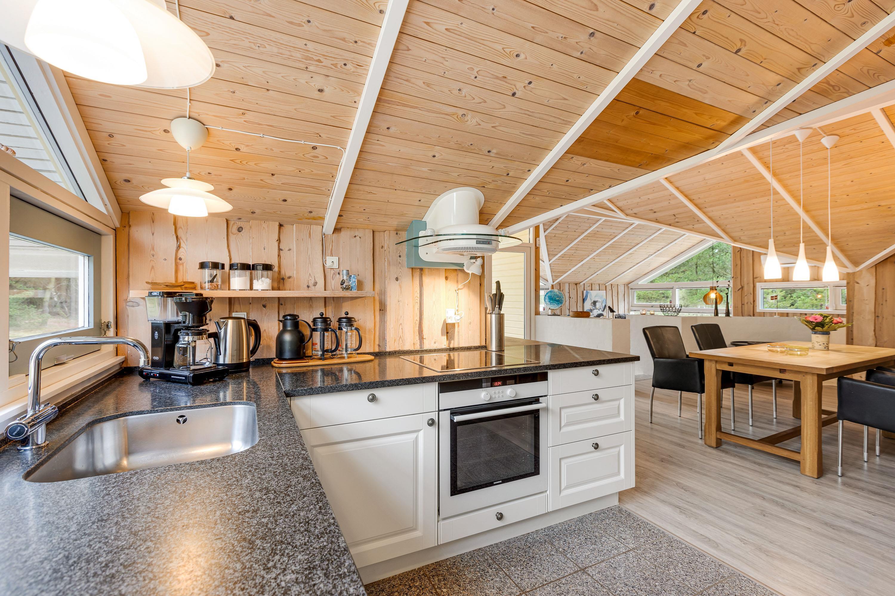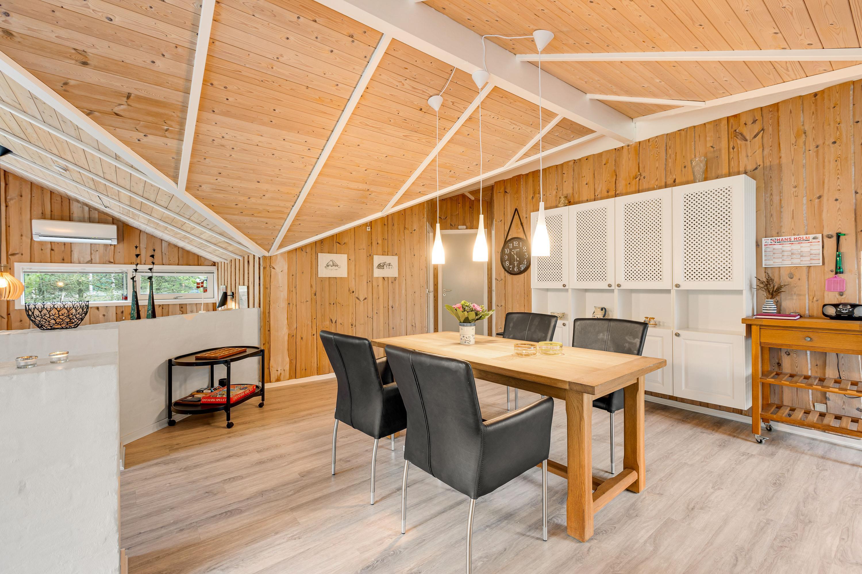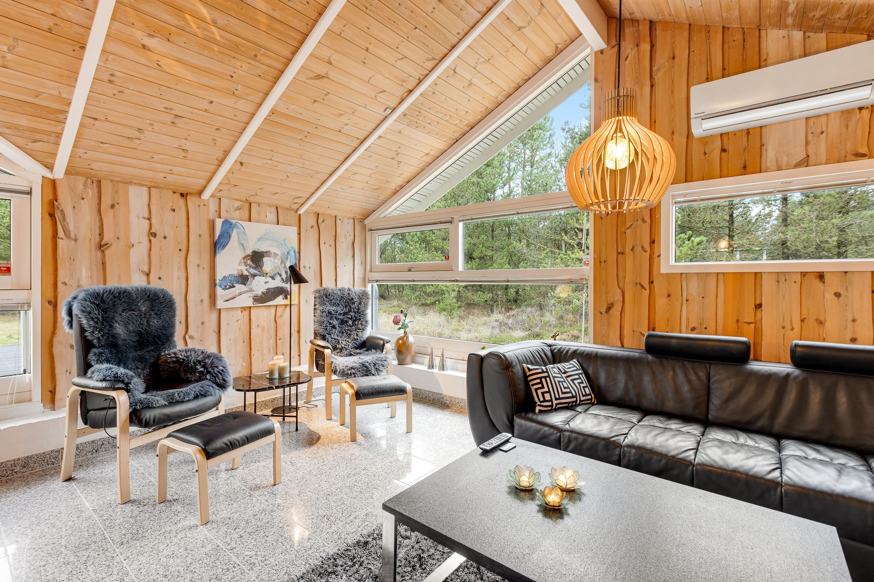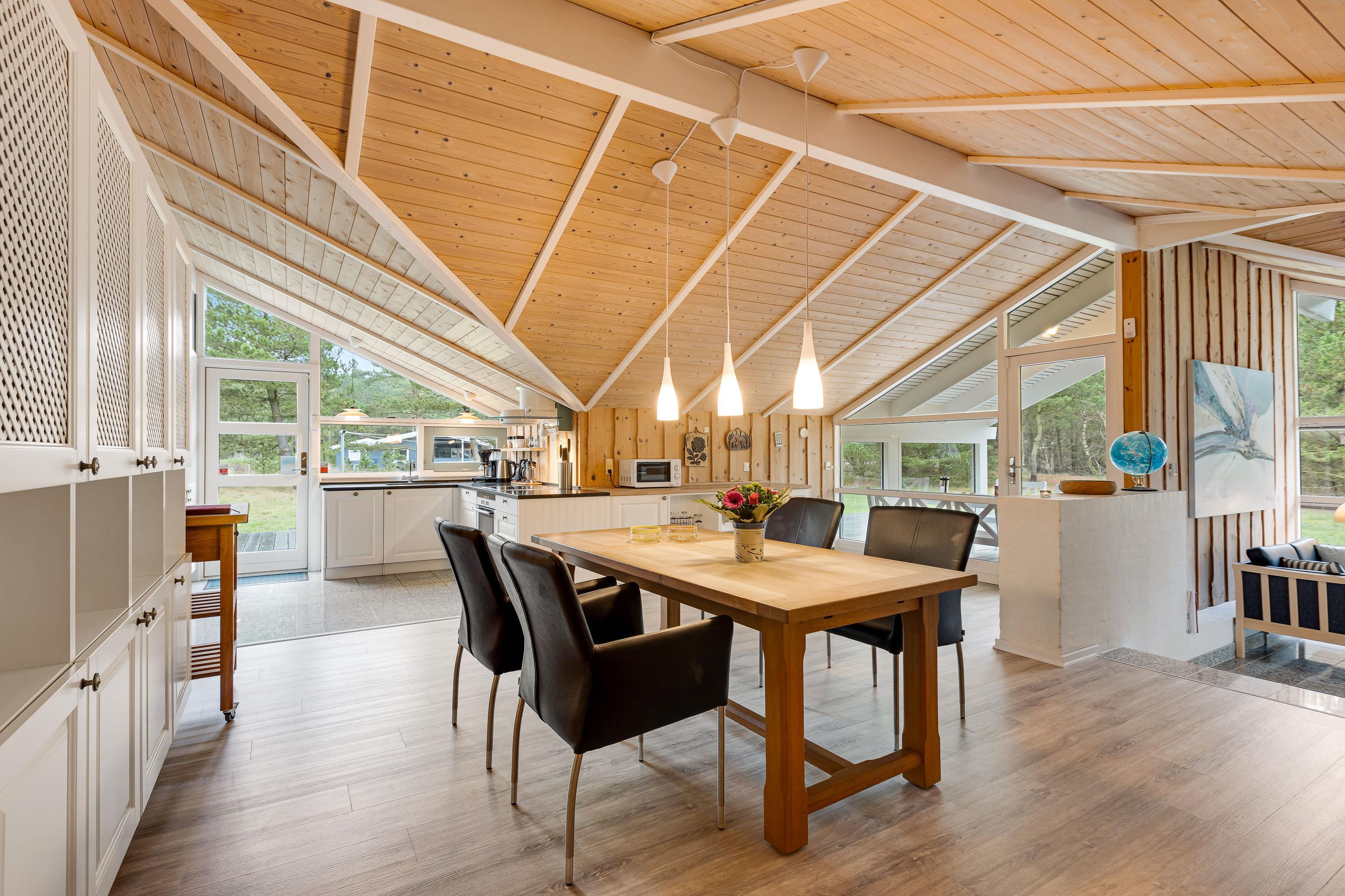 Feriehusets store, nedsænkede opholdsstue med loft til kip ligger i åben forbindelse med spisestuen og køkkenet. Væggene er beklædte med lyst træ og gulvene med trælaminat og klinker, så der er tale om et allergivenligt hus.
