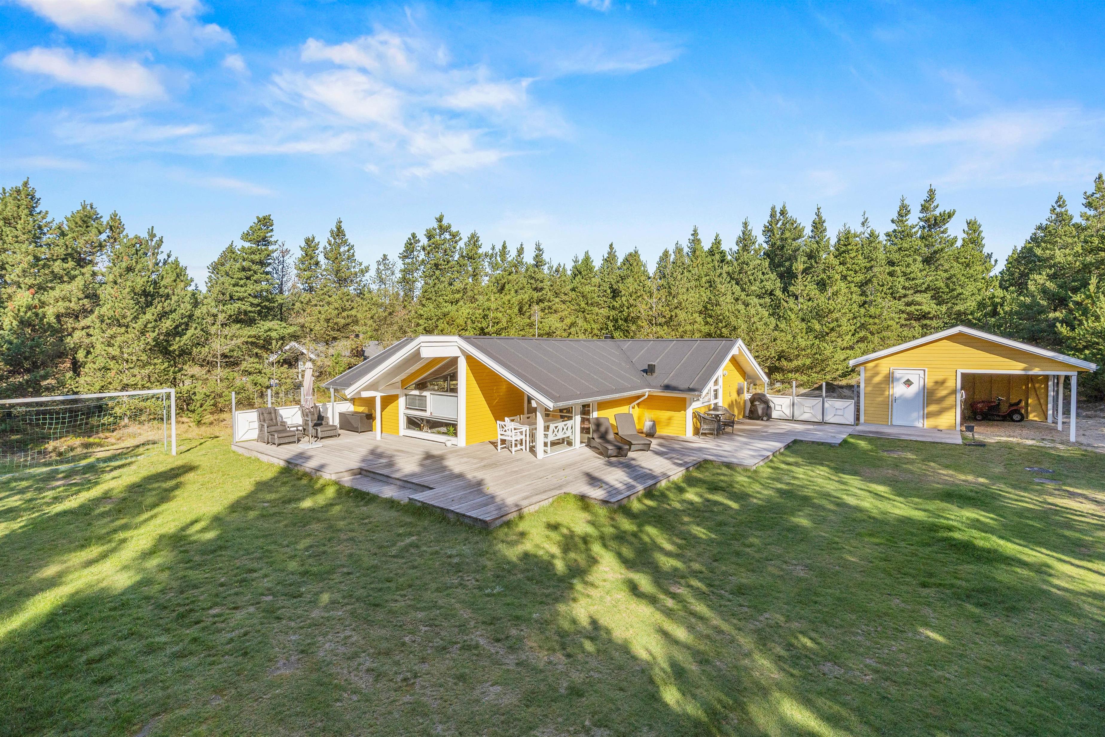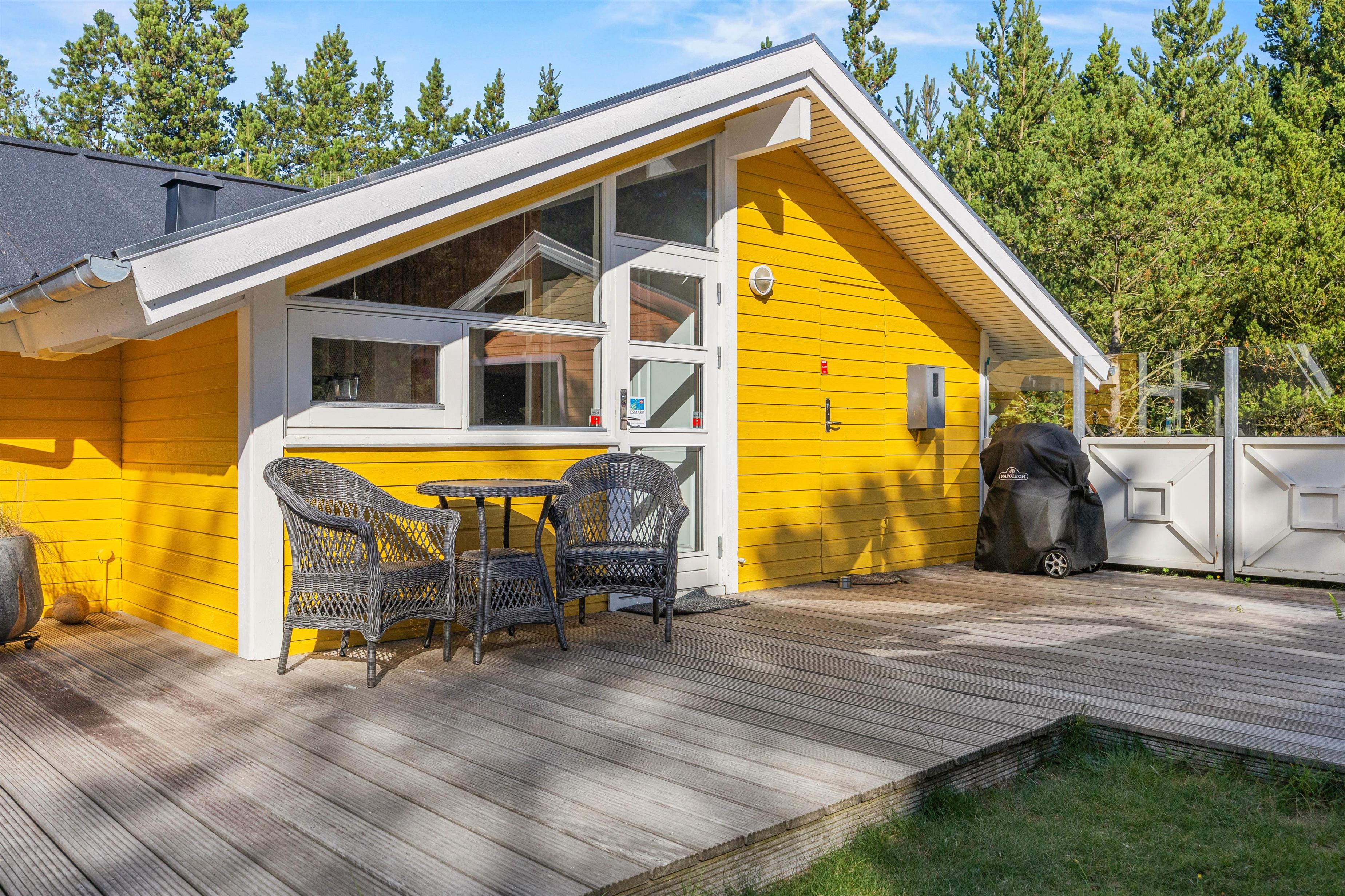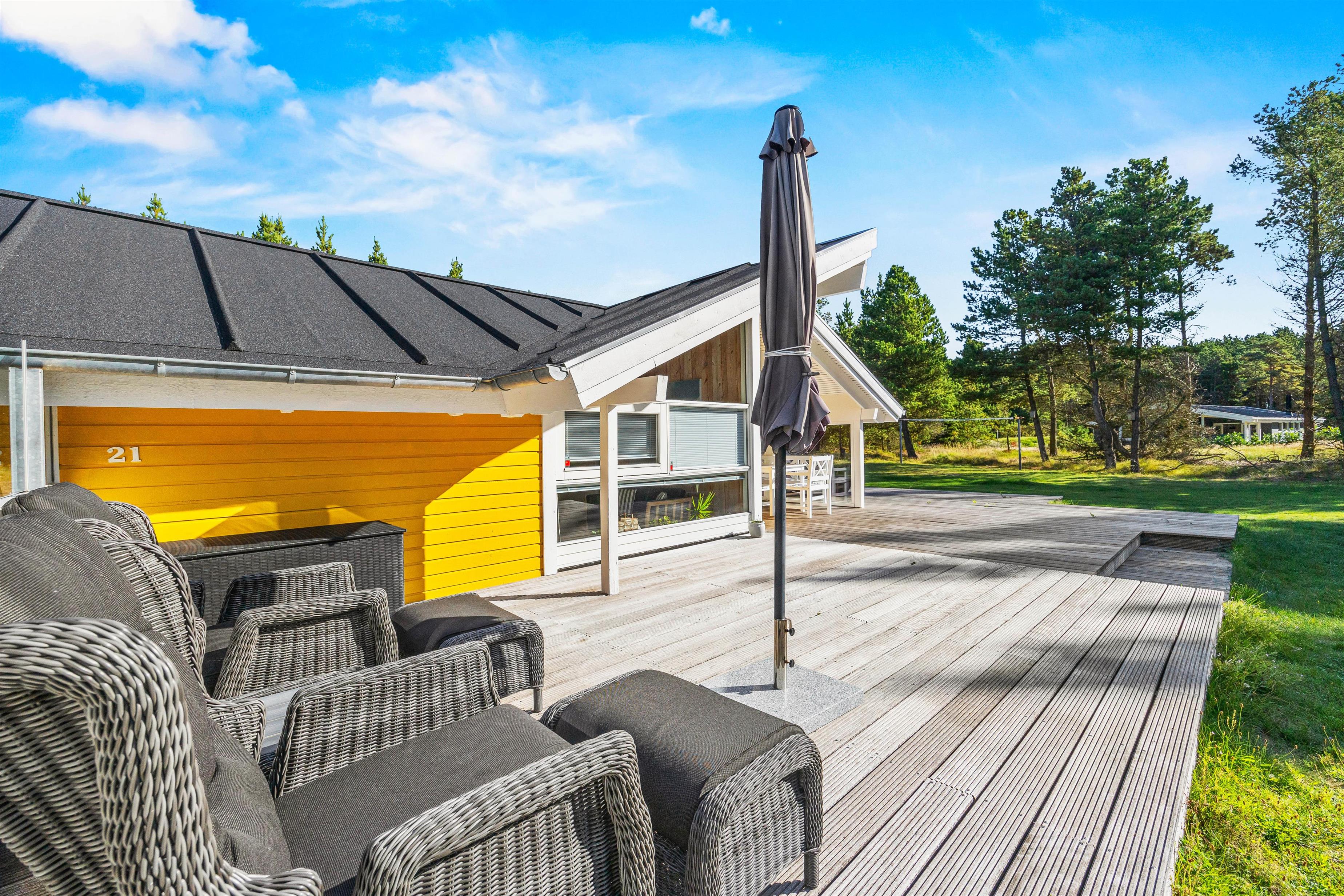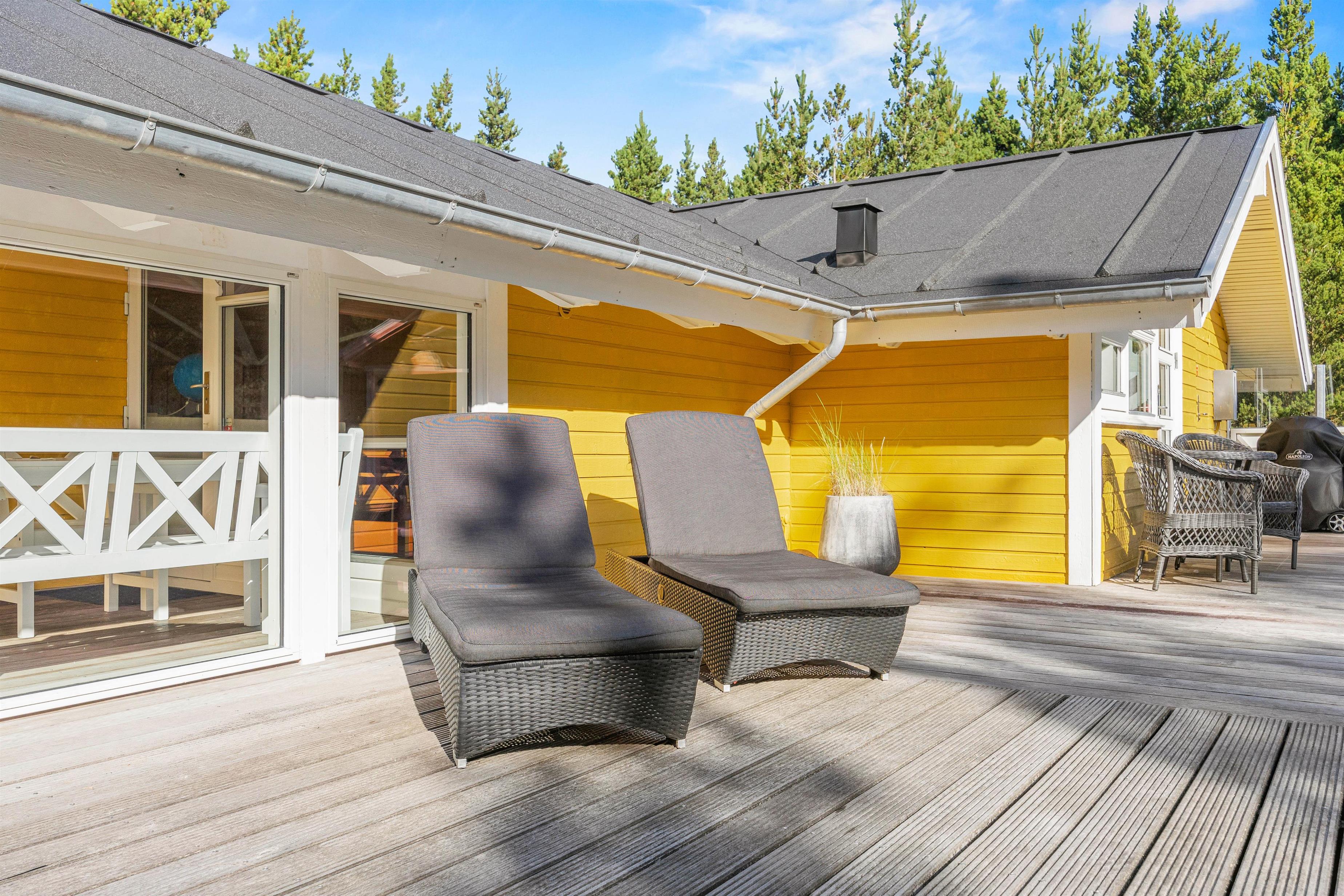 Udelivet kan nydes på de dejlige, store træterrasser, som er delvis overdækket. Her kan man nyde roen i de naturskønne og fredfulde omgivelser. Mens de voksne kan nyde et glas vin og en bøf fra gasgrillen i de behagelige havemøbler, kan børnene boltre sig på den ugenerede naturgrund med fodboldmål. Efter en lang dag på Rømøs fantastiske strand, kan man slappe af på den dejlige grund medr lægivende træer.