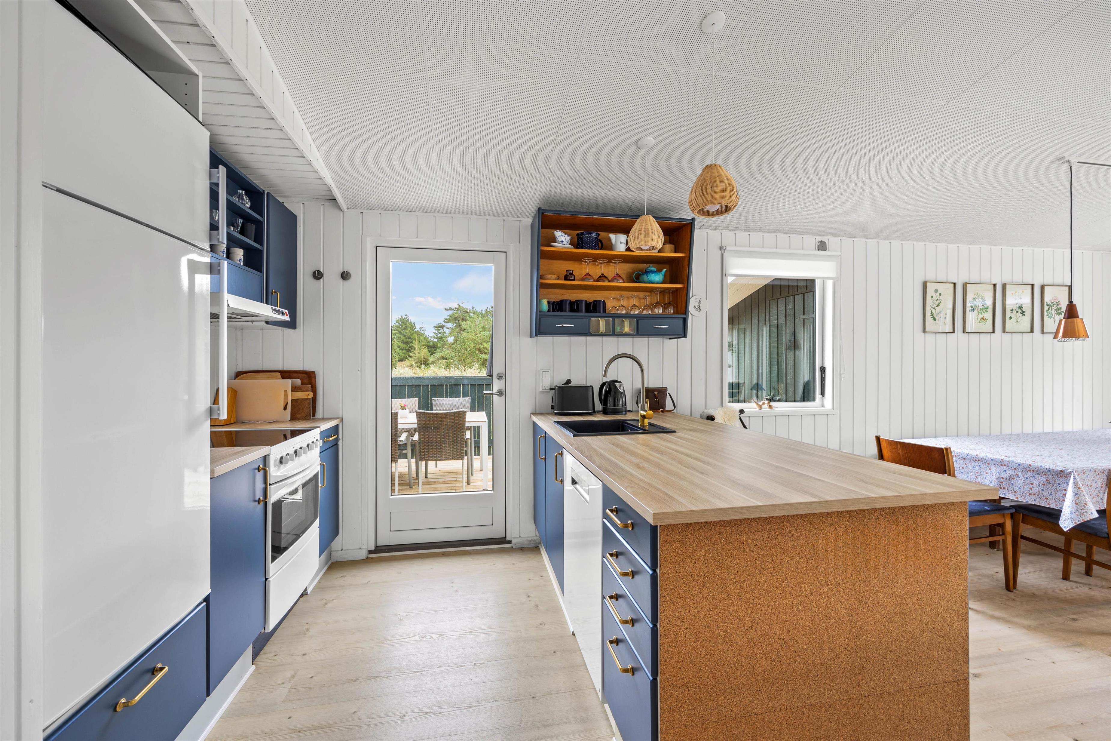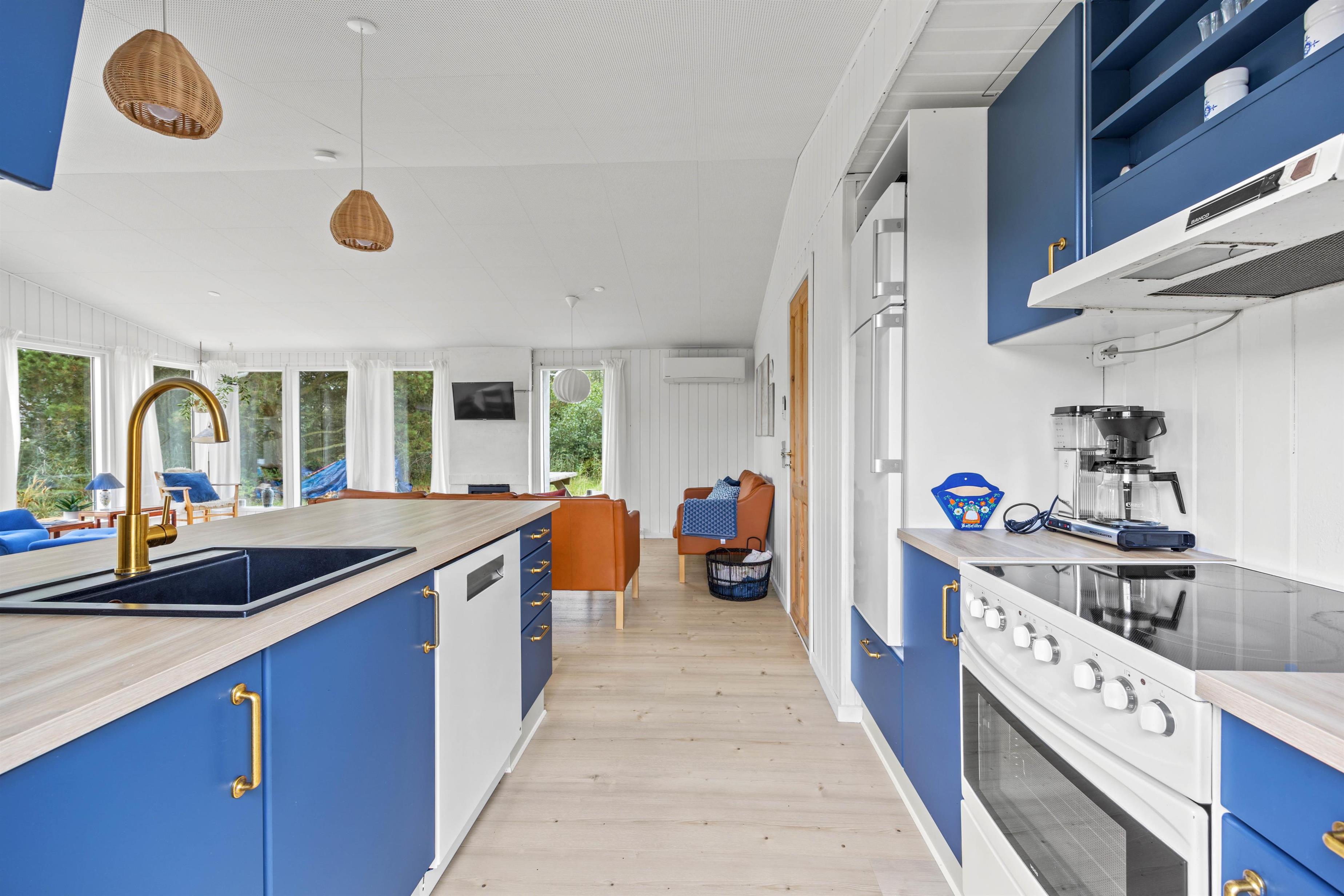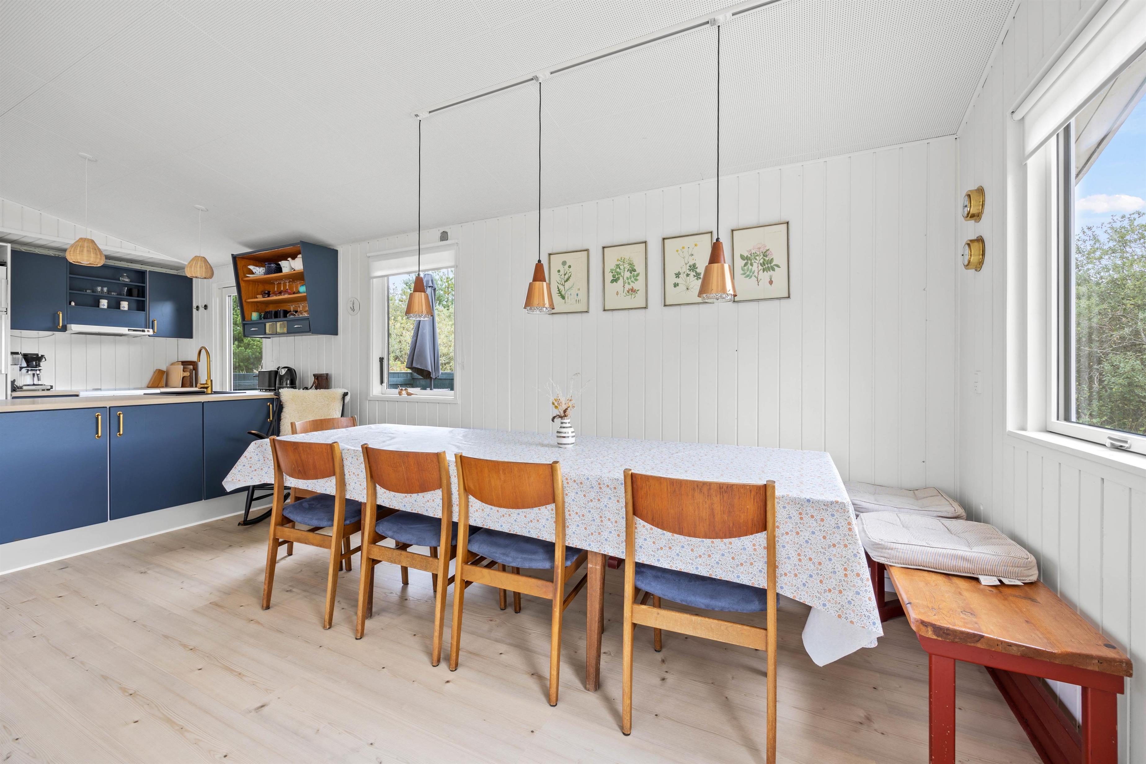 Feriehusets skønne køkkenalrum indbyder til gode familiesnakke, spil og afslapning foran brændeovnen, mens nogen måske laver mad i køkkenet. I køkkenalrummet er der også en varmepumpe, som kan varme jer, når aftnerne bliver koldere.