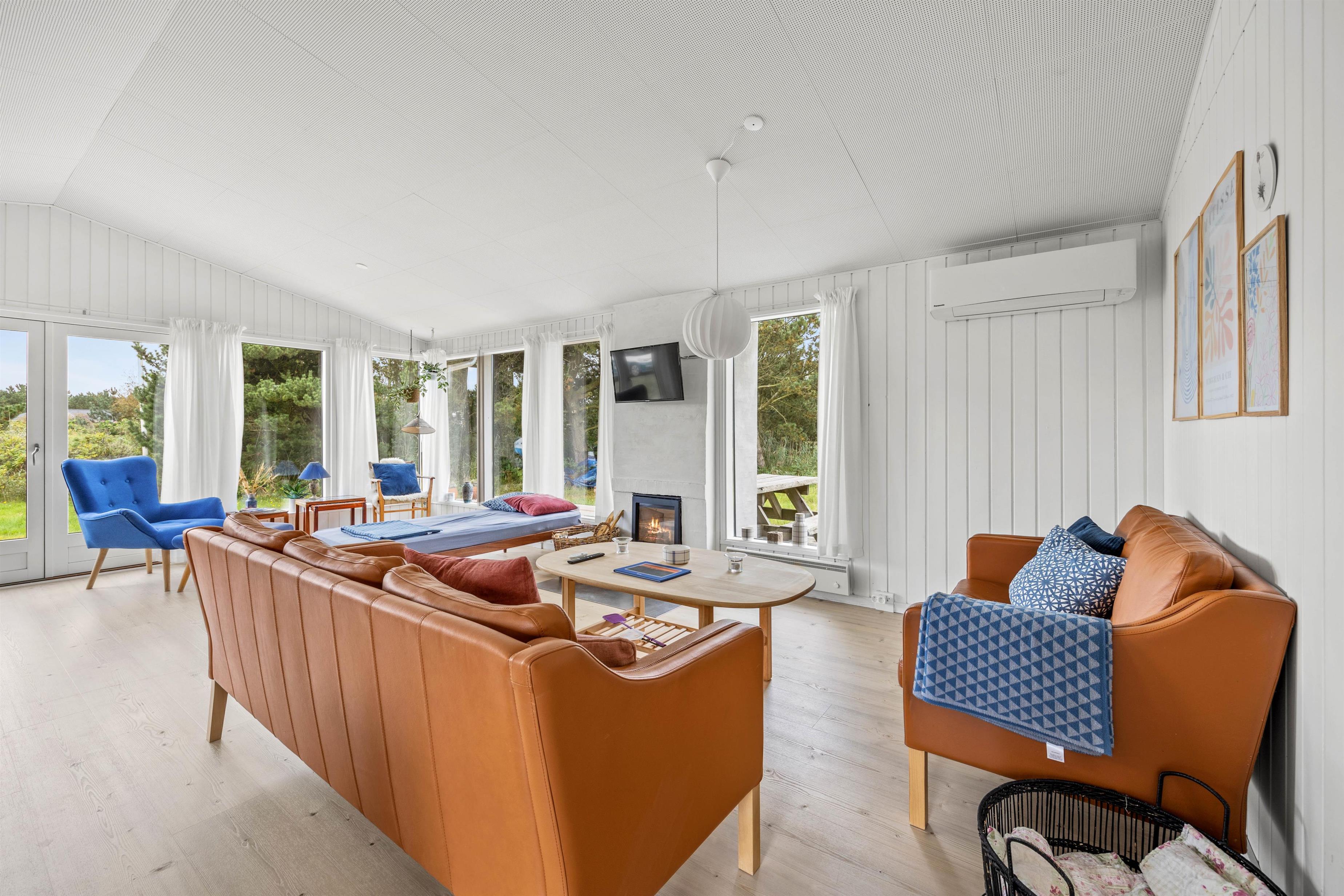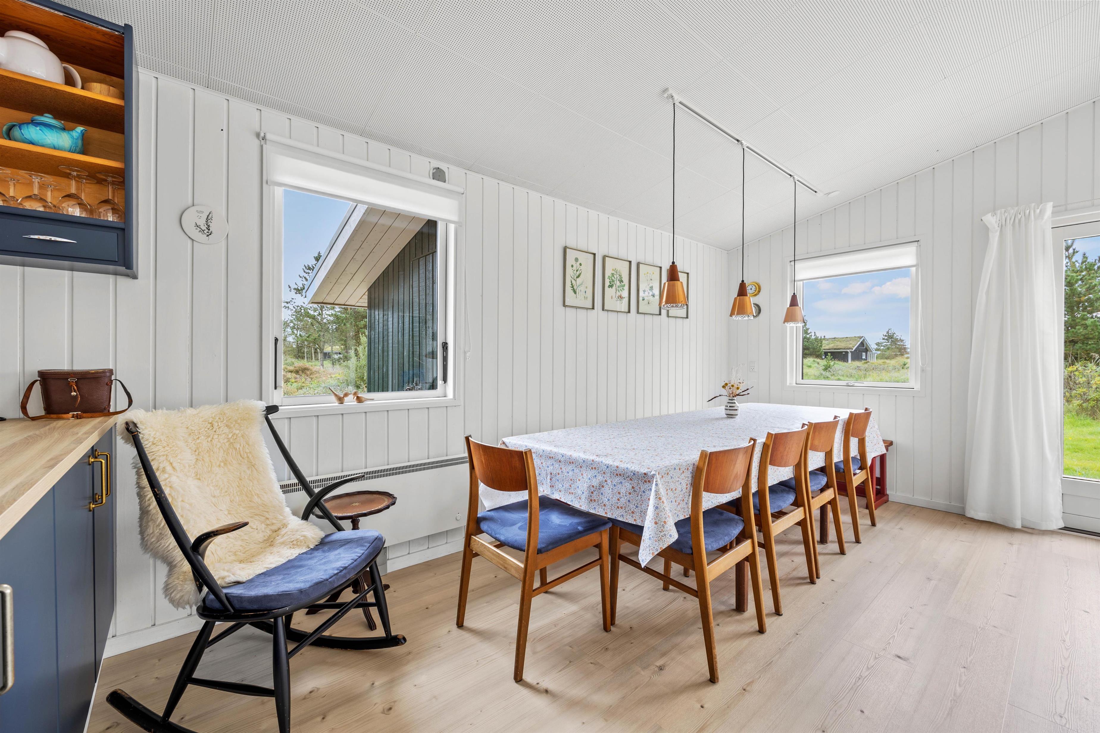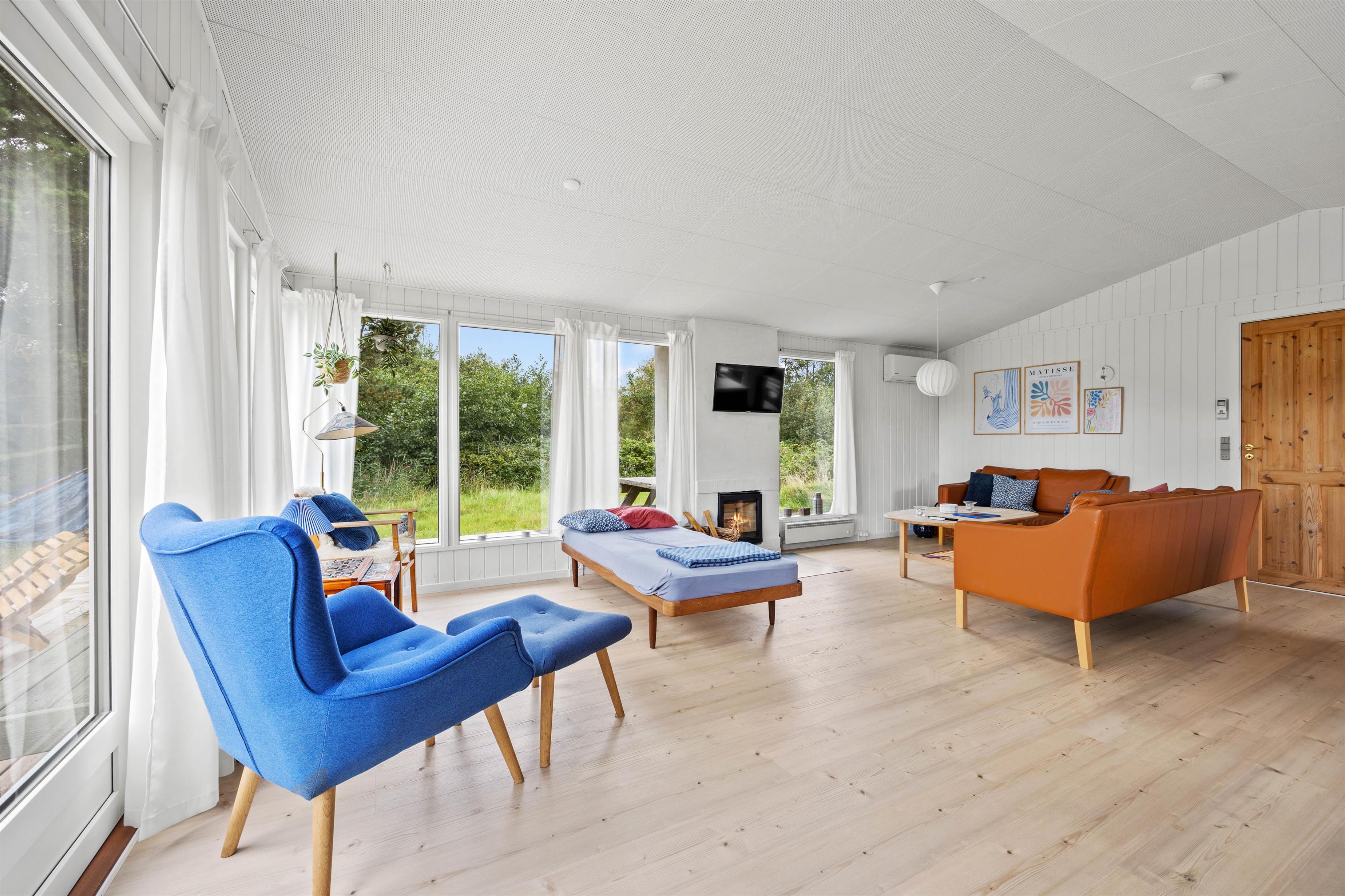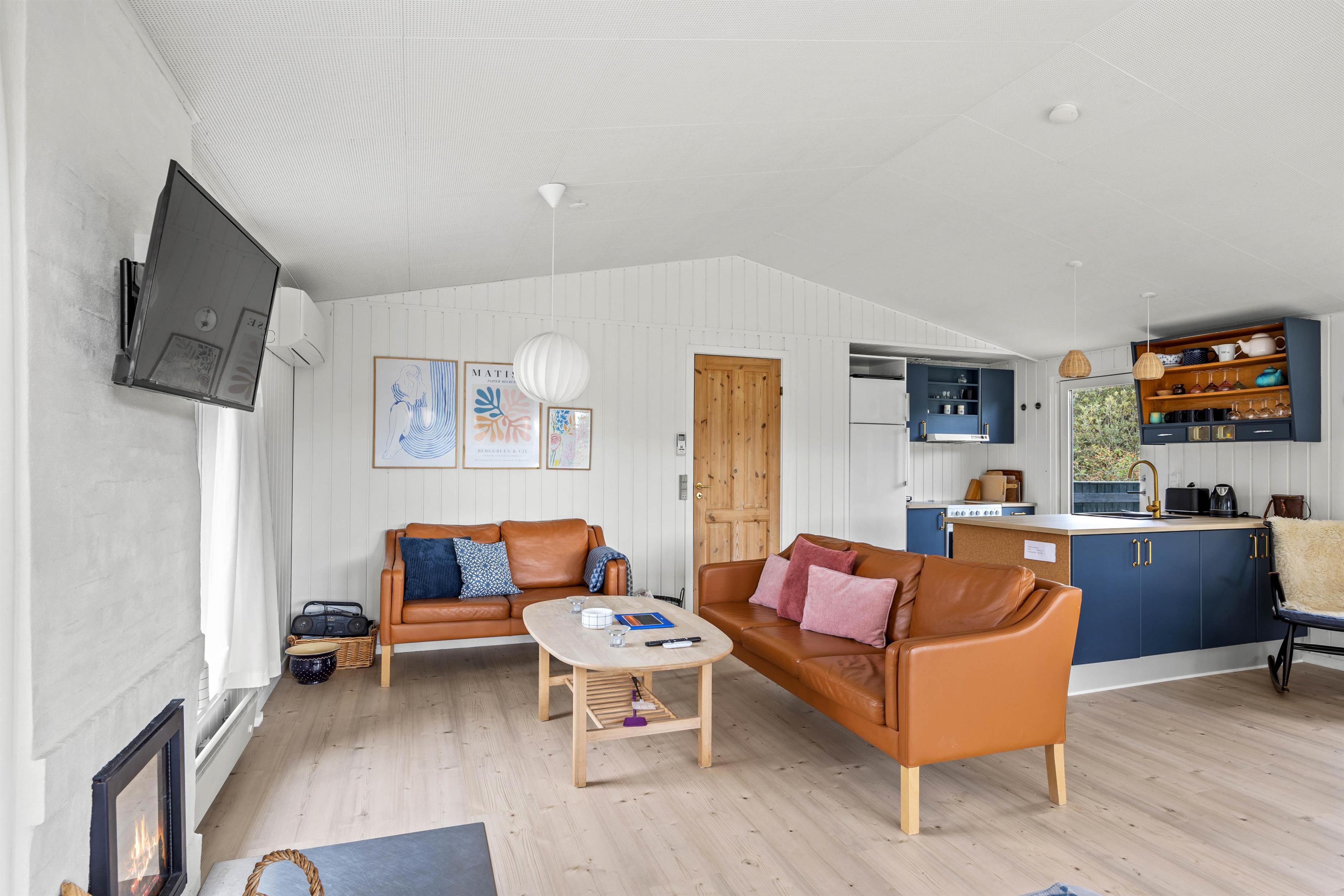 Feriehusets skønne køkkenalrum indbyder til gode familiesnakke, spil og afslapning foran brændeovnen, mens nogen måske laver mad i køkkenet. I køkkenalrummet er der også en varmepumpe, som kan varme jer, når aftnerne bliver koldere.