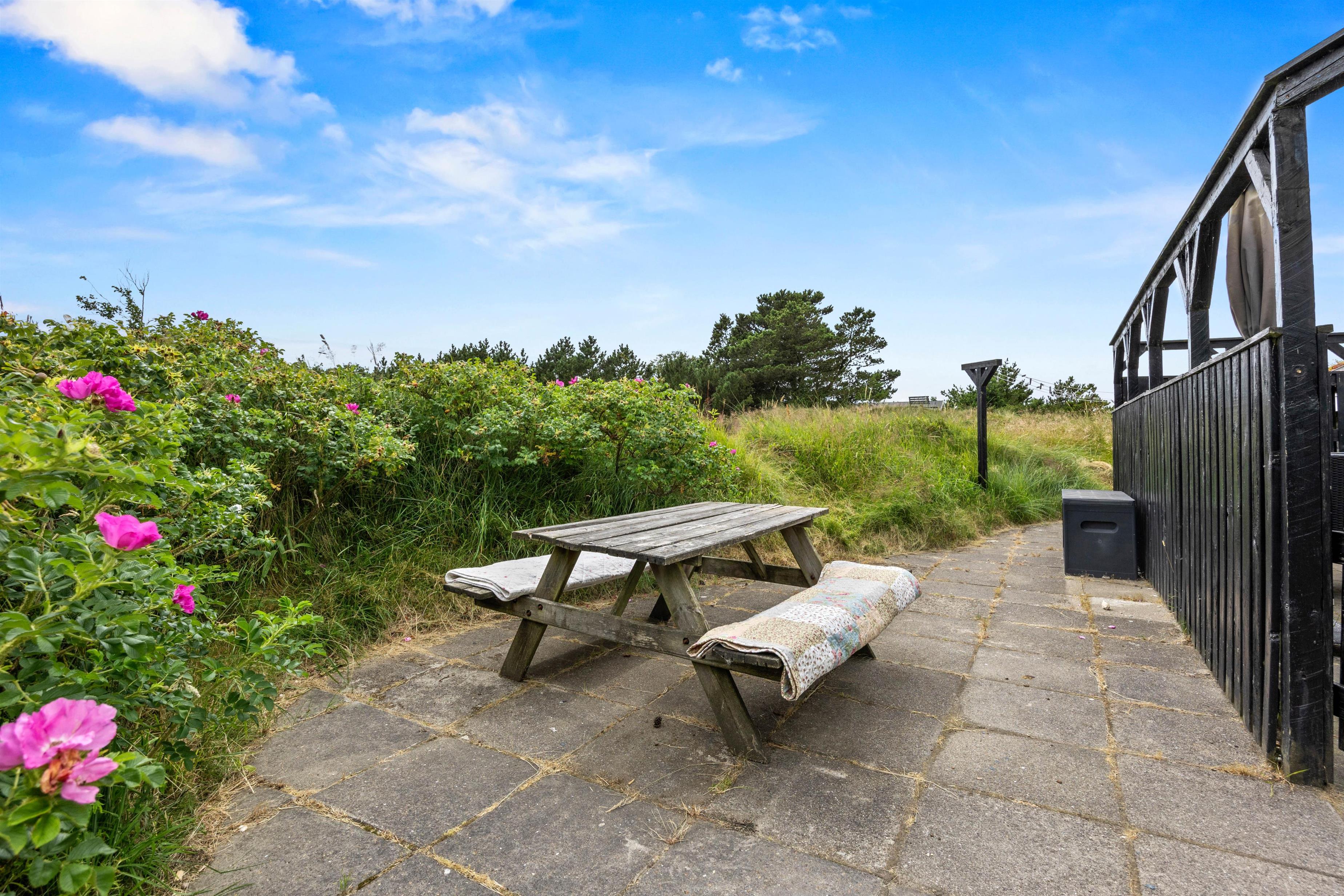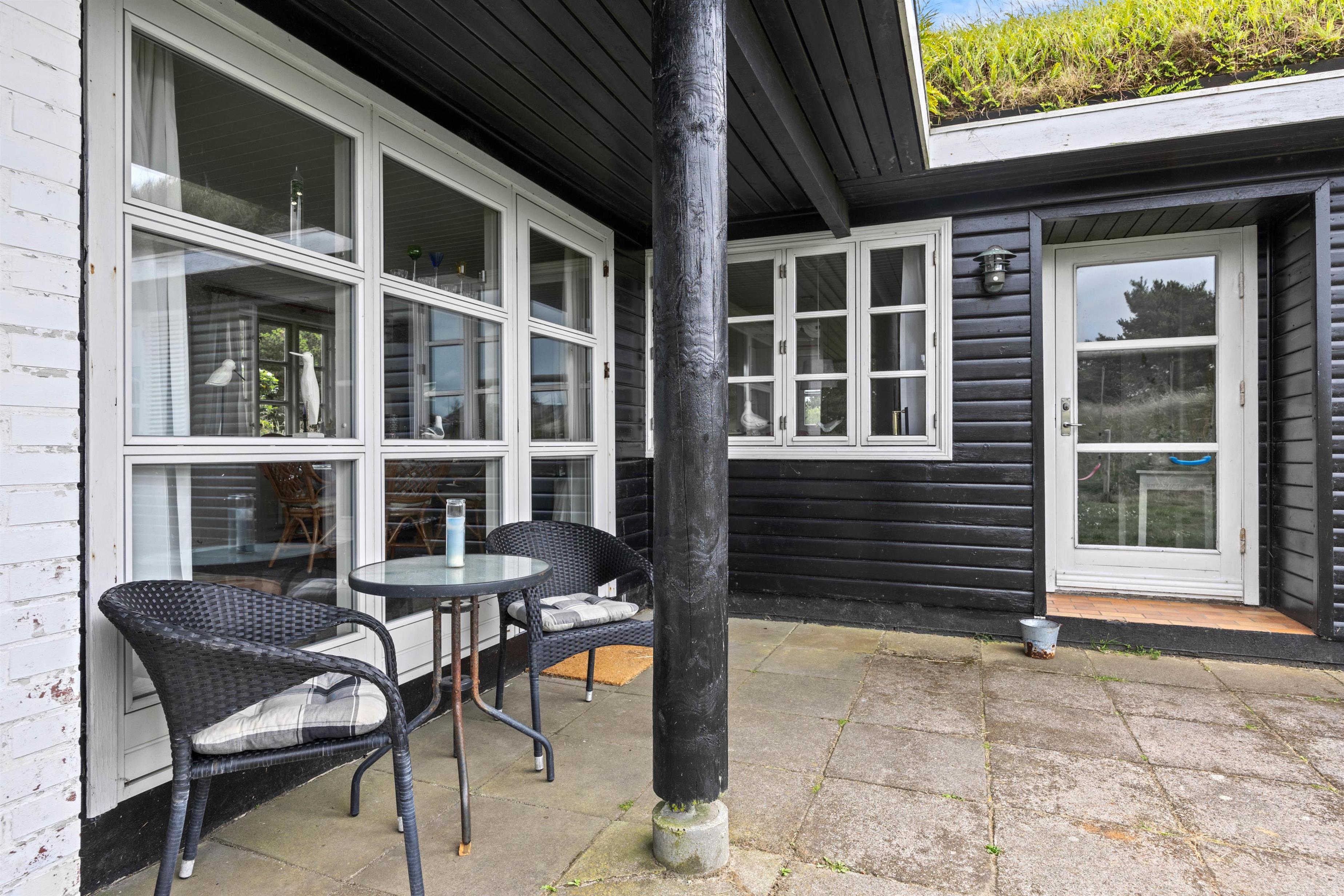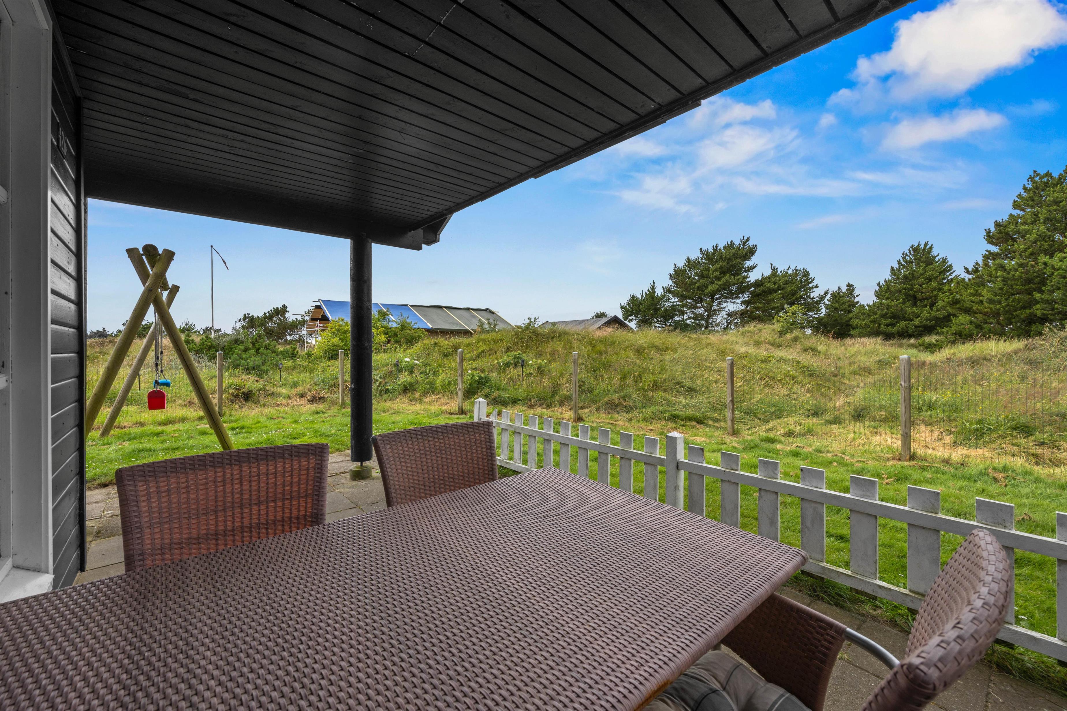 Omkring sommerhuset er terrasse og en indhegnet have, ideelt hvis I har småbørn eller hunde med. Terrassernes placering og de mange gode kroge gør, at I altid kan finde en behagelig plet at opholde jer på udendørs. Til børnene er der en sandkasse, og sammen kan I spille et boldspil eller et spil Viking. Tag solbad på de komfortable liggestole eller slap af i havemøblerne. Tænd op i grillen til aften,og nyd et lækkert grillmåltid sammen, før børnene skal sove, eller I skal ned på stranden og opleve solnedgangen.