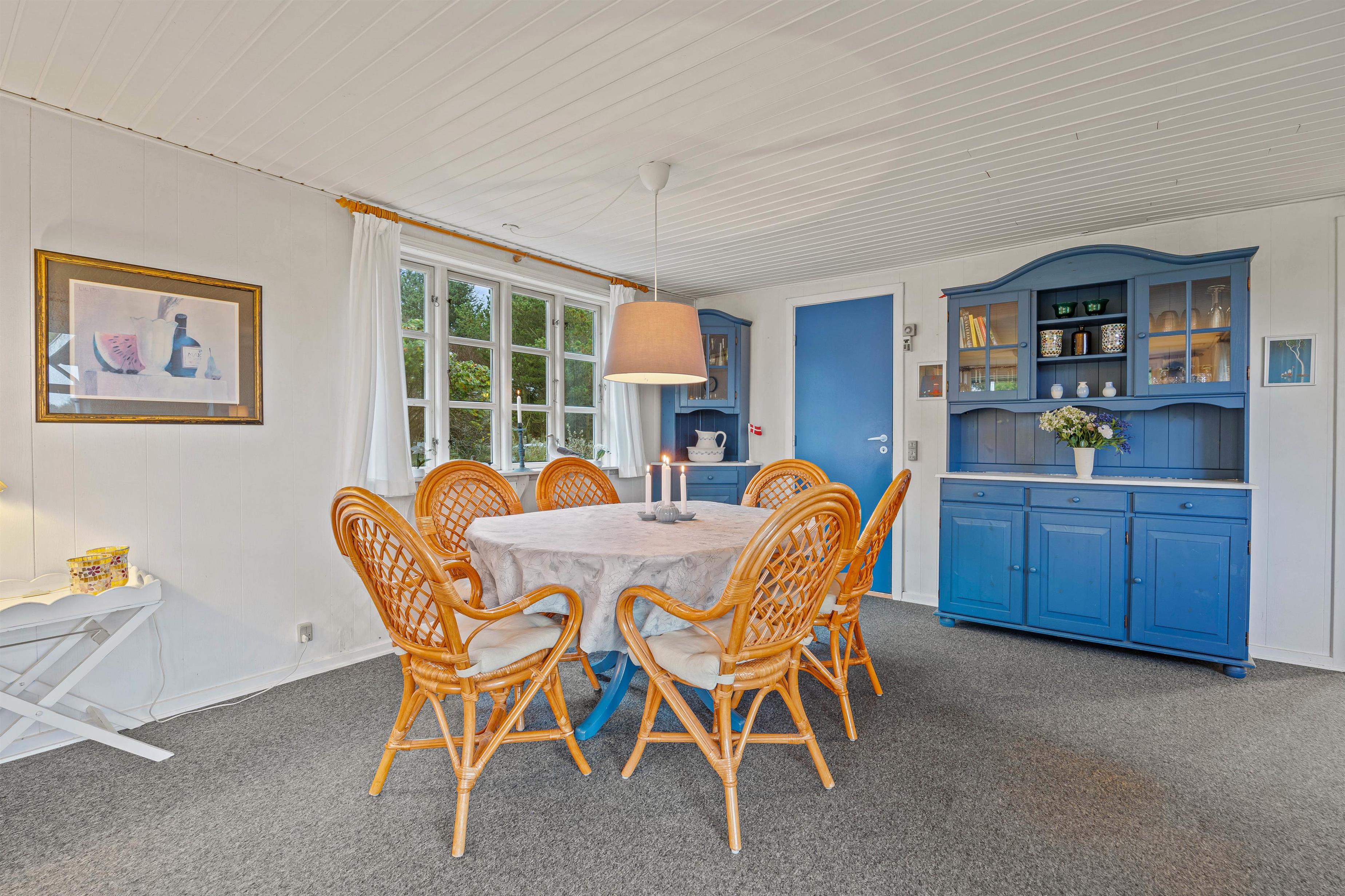 Sommerhuset på Ringvejen 126 er hyggeligt indrettet med sprossevinduer og hvidmalede vægge og lofter. I stuen er der gulvtæppe og brændeovn, som giver feriestemning og behagelige temperaturer. I sofagruppen kan I hygge jer sammen og eventuelt spille et brætspil. I kan også se tyske TV-kanaler, og der er naturligvis radio og WiFi, så I altid kan være opdateret på ferien. Der er en energibesparende varmepumpe som sikkerhed for altid at kunne holde temperaturen behagelig i feriehuset.