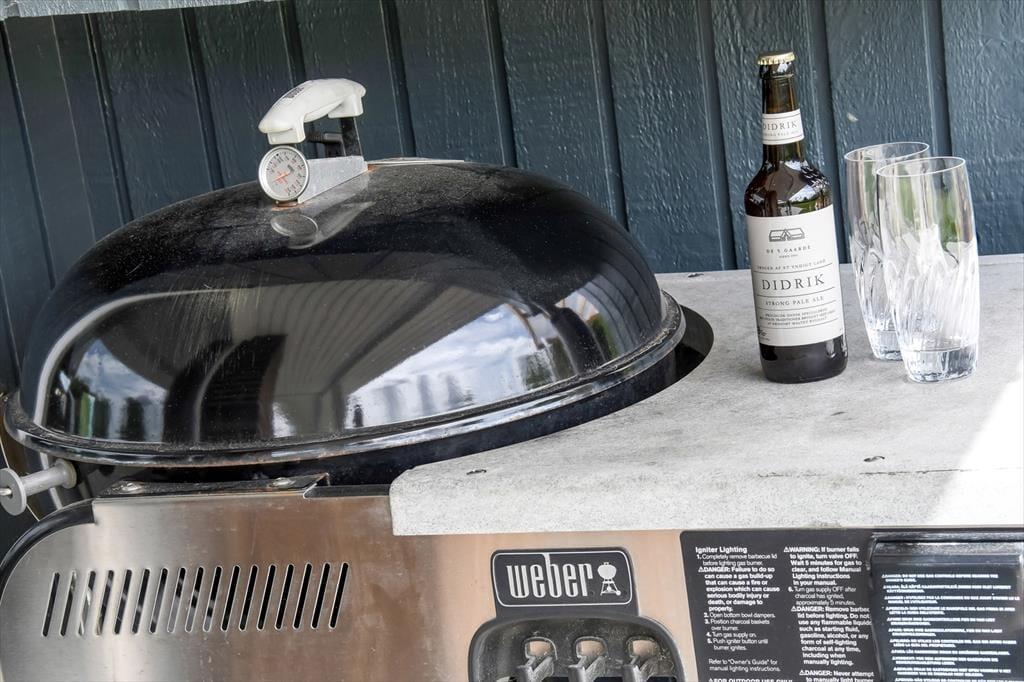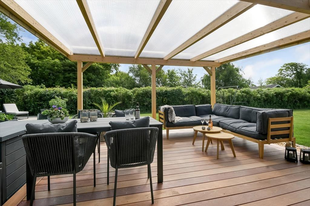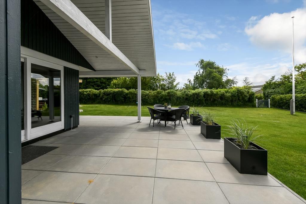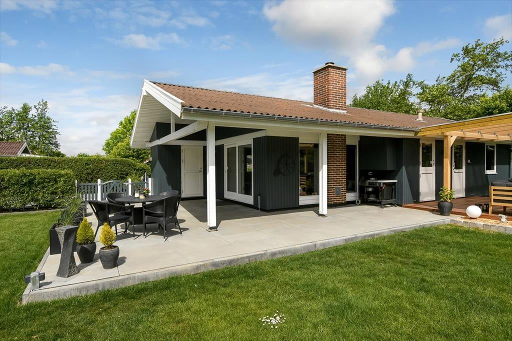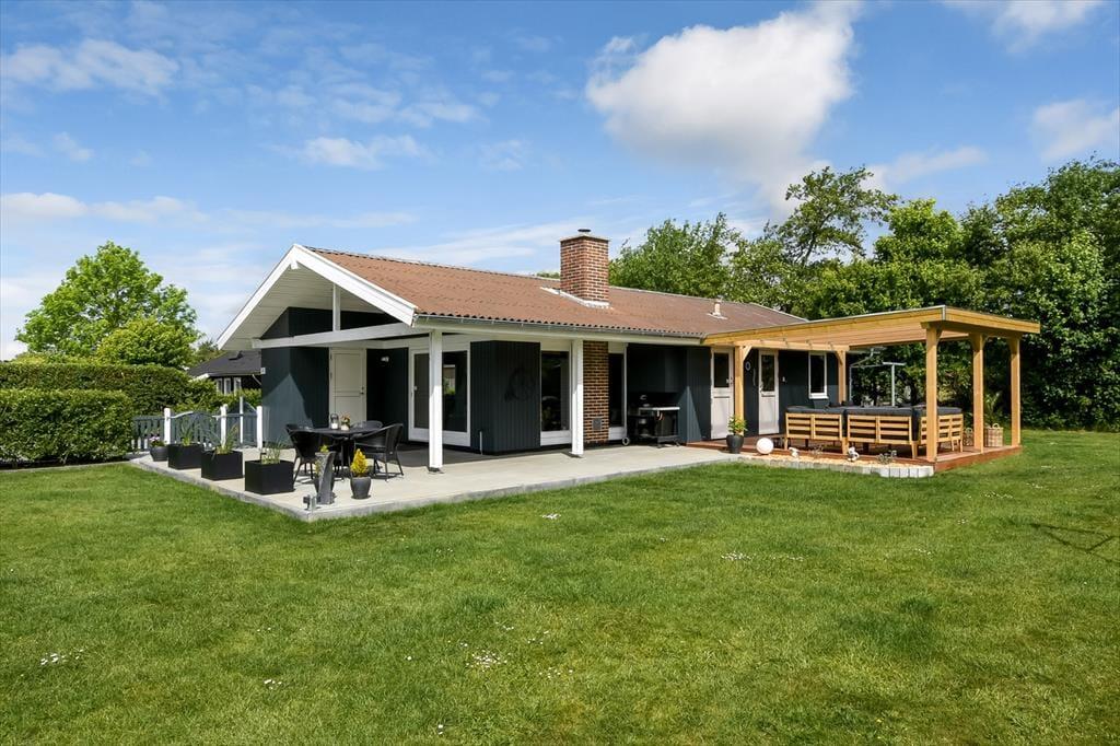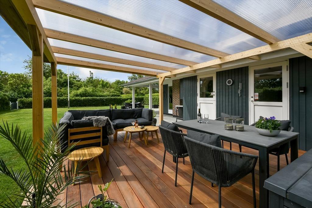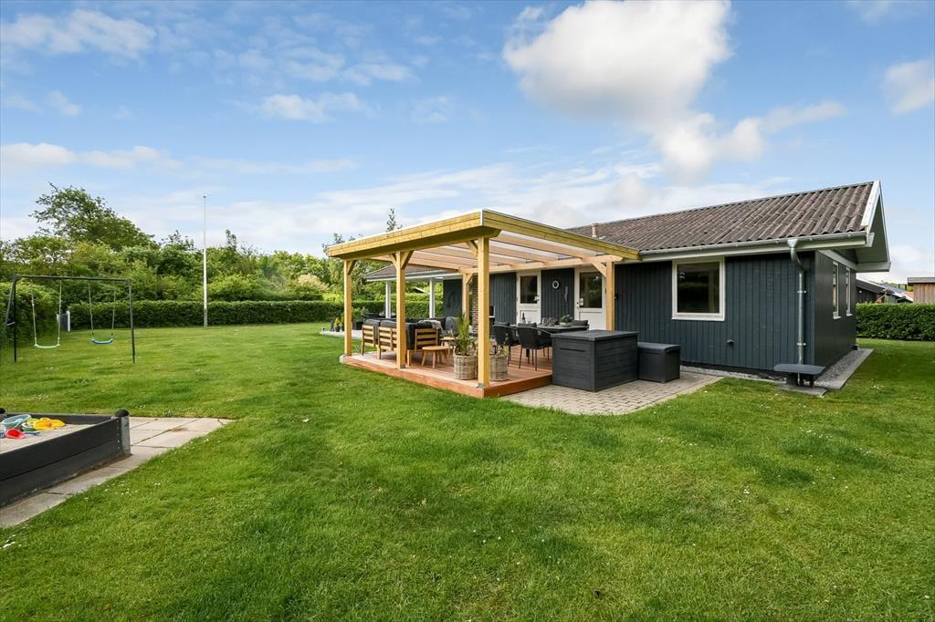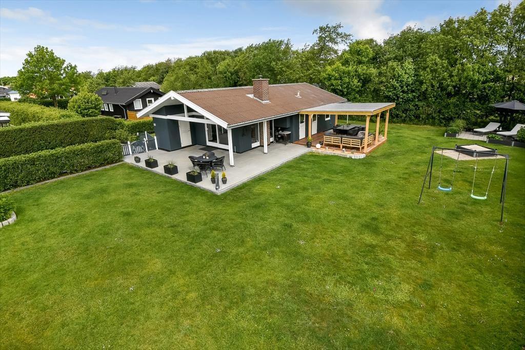 Syd og øst for sommerhuset breder en dejlig træterrasse sig. Den er delvist overdækket og udstyret med både liggestole, grill og havemøbler, så I både kan slappe af, kokkerere og spise ude i det fri. På den lukkede grund indbyder græsplænen til leg og havespil, og der er både gynge og sandkasse til de yngste feriegæster.