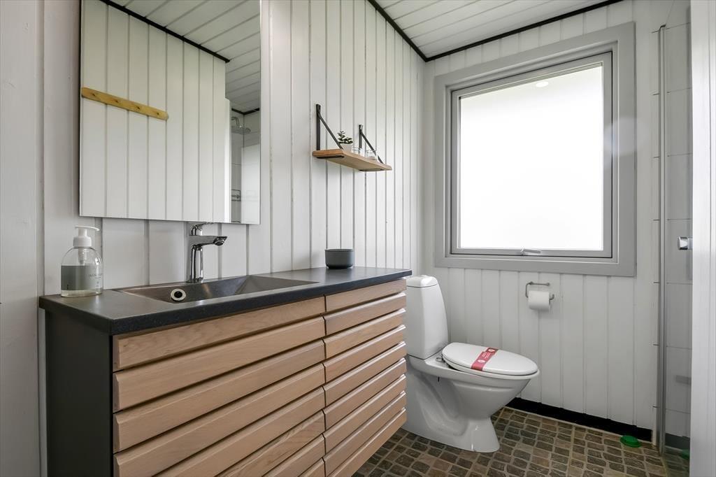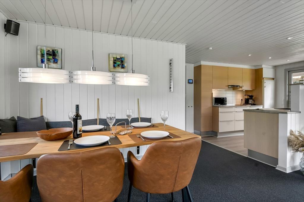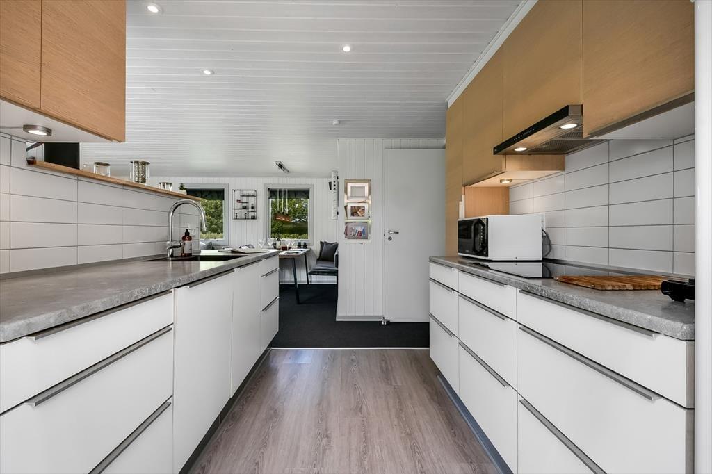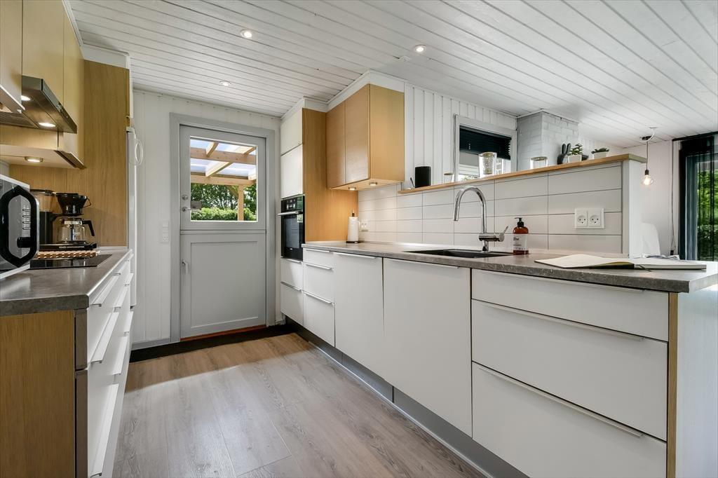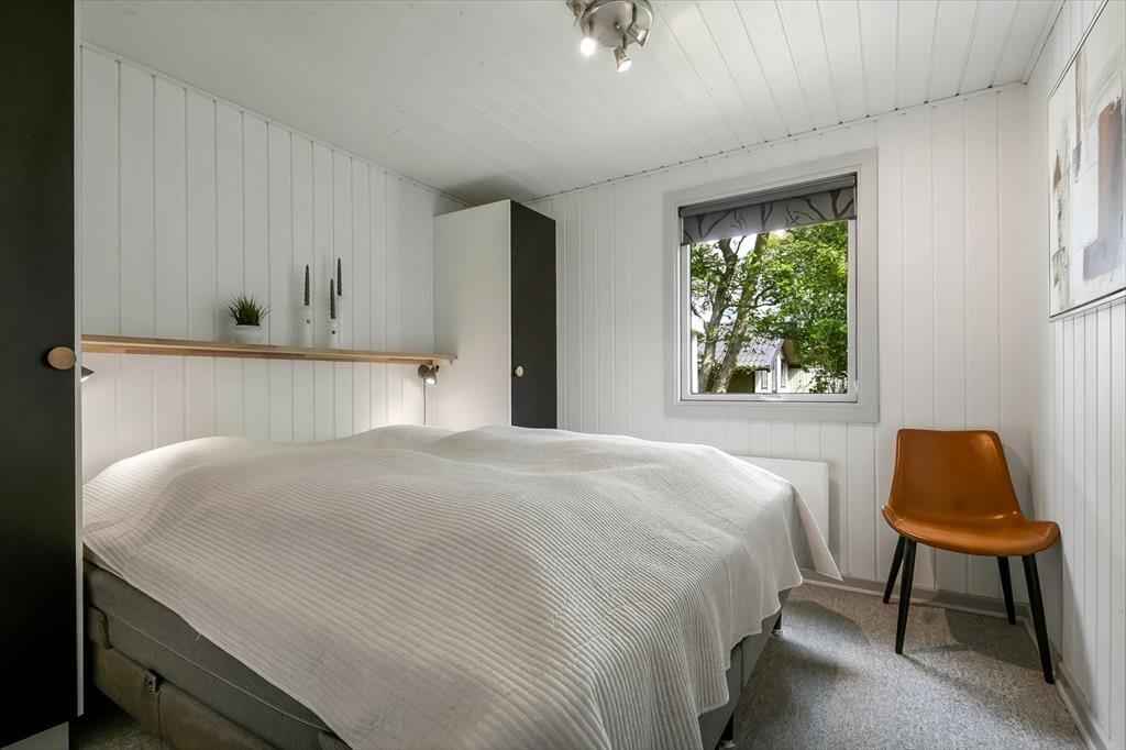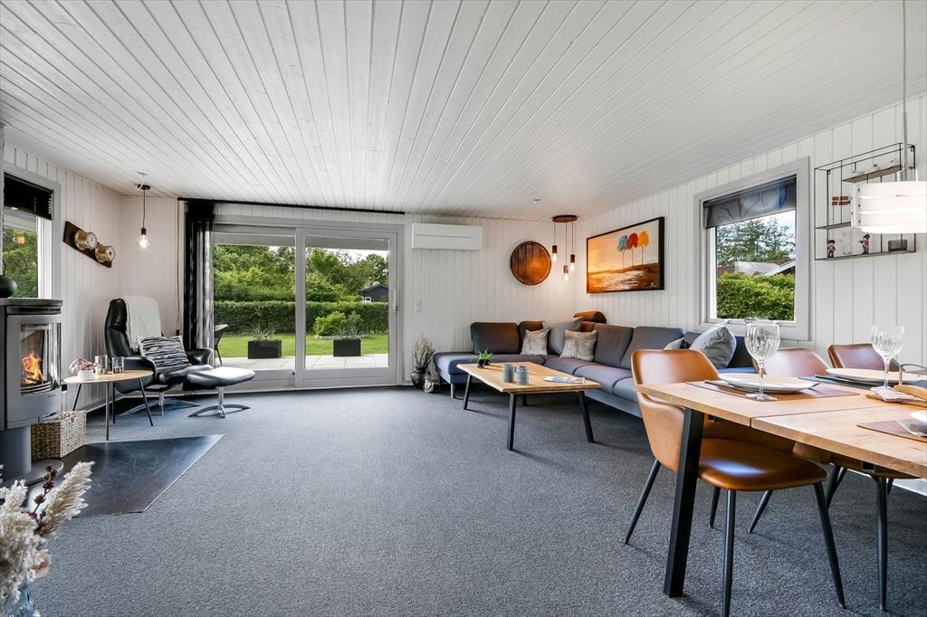 Sommerhuset har stået her på den fredelige adresse siden 1981, og gennem årene er det blevet godt vedligeholdt. Seneste renovering foregik i 2020, og alle rum præsenterer sig på indbydende vis med moderne møblement i neddæmpede farvetoner. Stuen og køkkenet er forenet som et stort opholdsrum, hvor I kan samles til hyggelig fællesmadlavning, gode samtaler omkring spisebordet og filmaftener i sofaen nær brændeovnen. Når dagen er ved at være til ende, kan I gå til ro i de tre soveværelser, der alle er udstyret med gode dobbeltsenge, og glæde jer til at vågne op til nye ferieoplevelser. Sommerhusets planløsning byder for øvrigt på et badeværelse med bruseniche og klinkegulv.