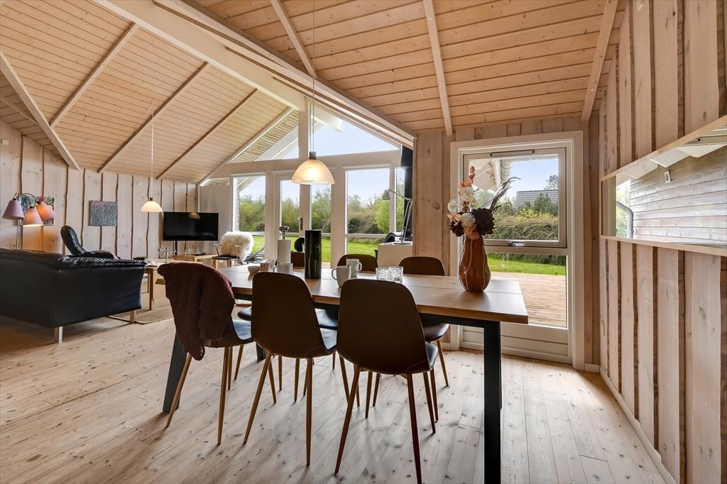 Fra stuen kan I træde lige ud på træterrassen, som er en stor og skøn model, der breder sig om tre af sommerhusets sider. En del af terrassen er overdækket og resten er åben, så der er flere valgmuligheder, når I vil nyde livet i havemøblerne eller liggestolene.