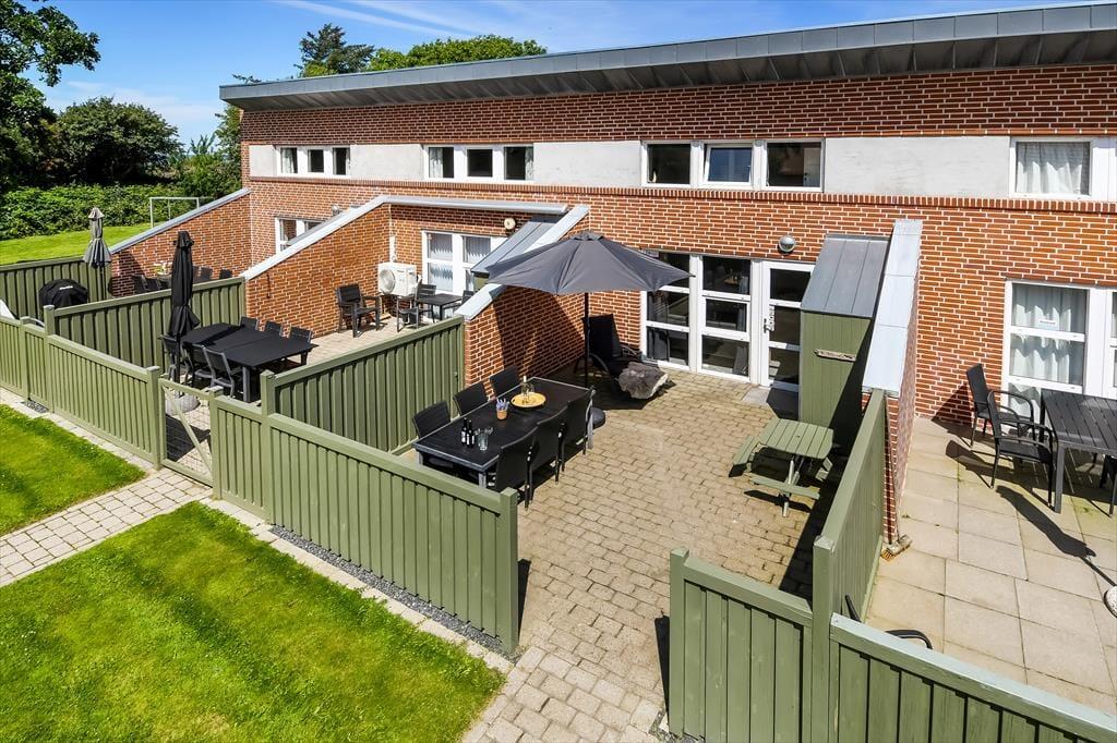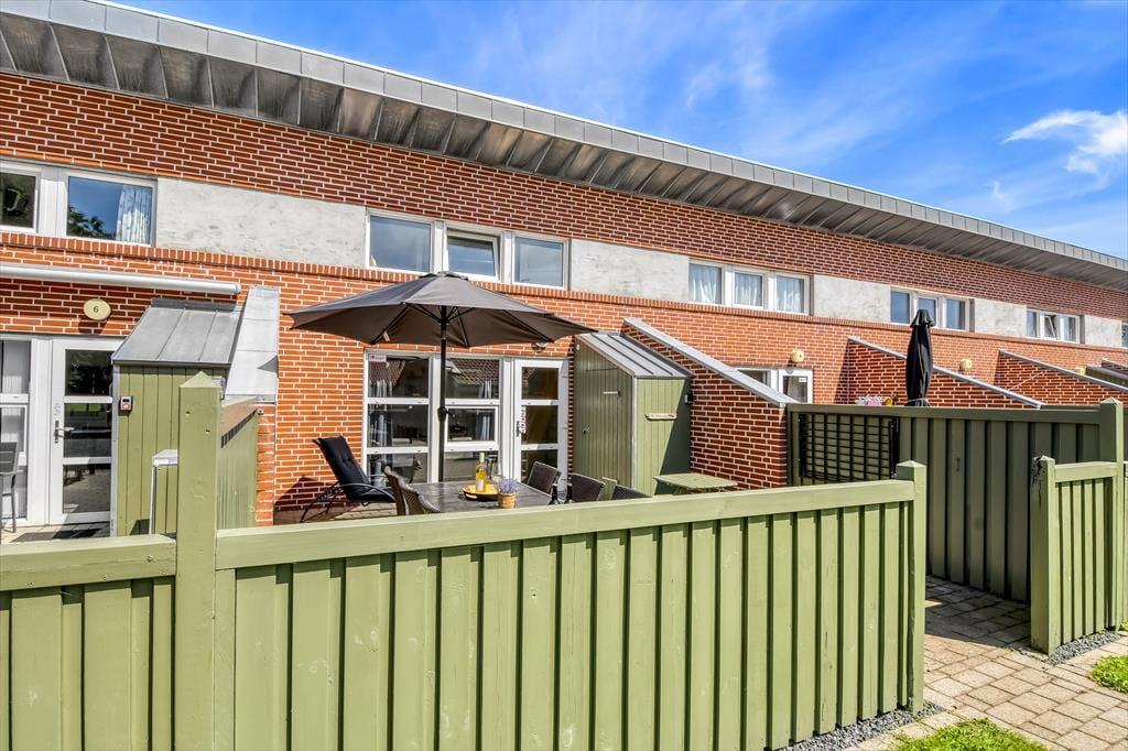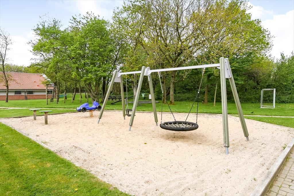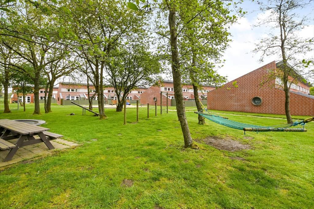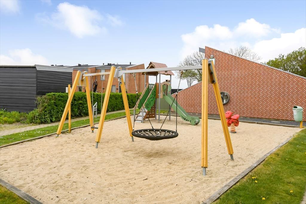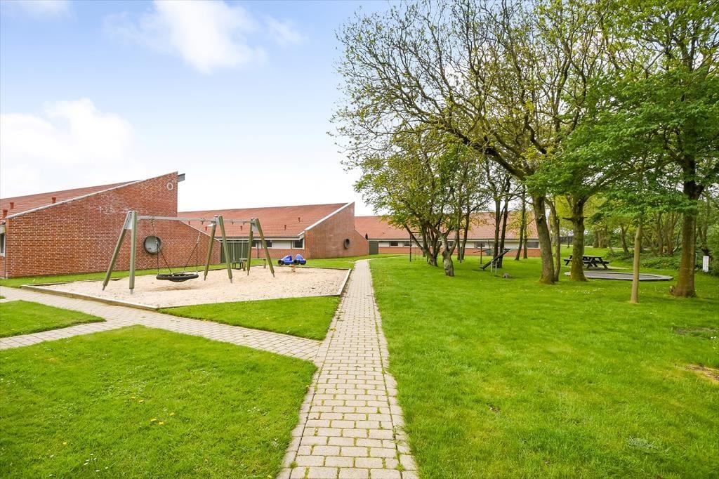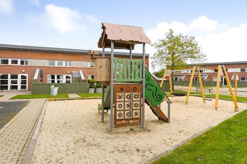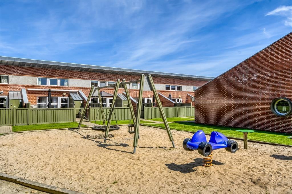 Fra stuen har I direkte adgang til en sydvestvendt fliseterrasse, der er aflukket med hegn ud mod naboerne og de grønne fællesarealer. Her er der havemøbler og liggestole til rådighed, når I bare vil tage den med ro og nyde det gode vejr – og skal der være mere gang i den, har I masser af plads til at boltre jer på fællesarealerne, hvor I blandt andet kan spille petanque, beachvolley og tennis. Lejligheden ligger tæt på områdets fælles legepladser, hvor der bl.a. er en stor sandkasse, gynger og rutschebaner.