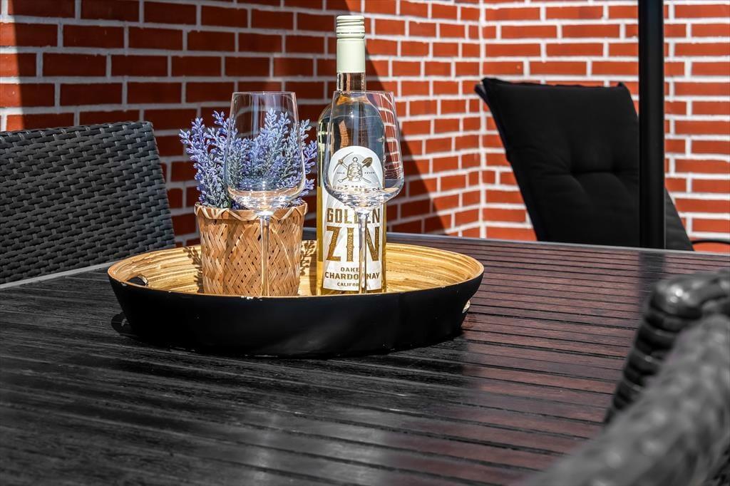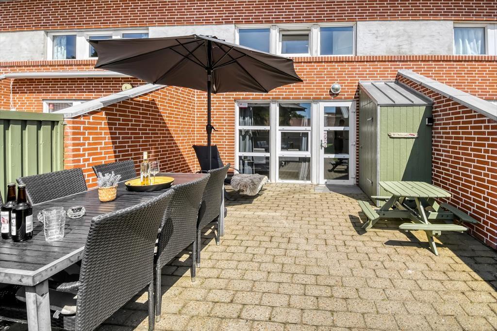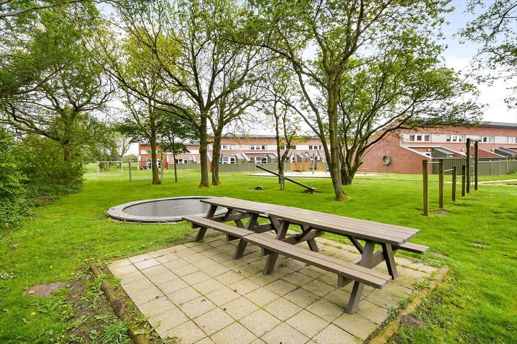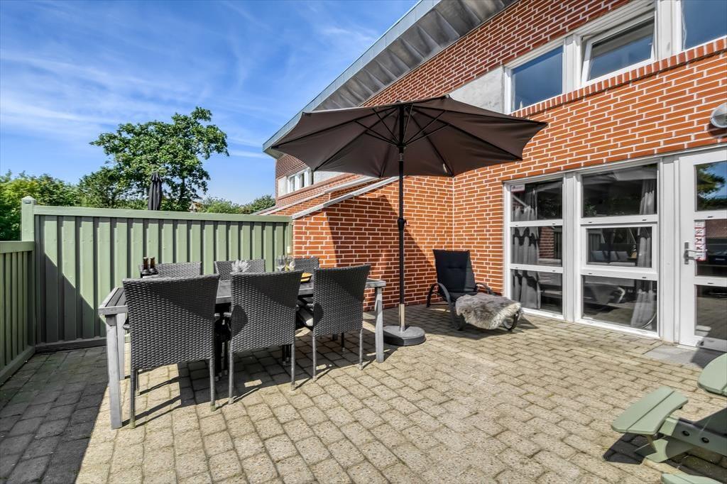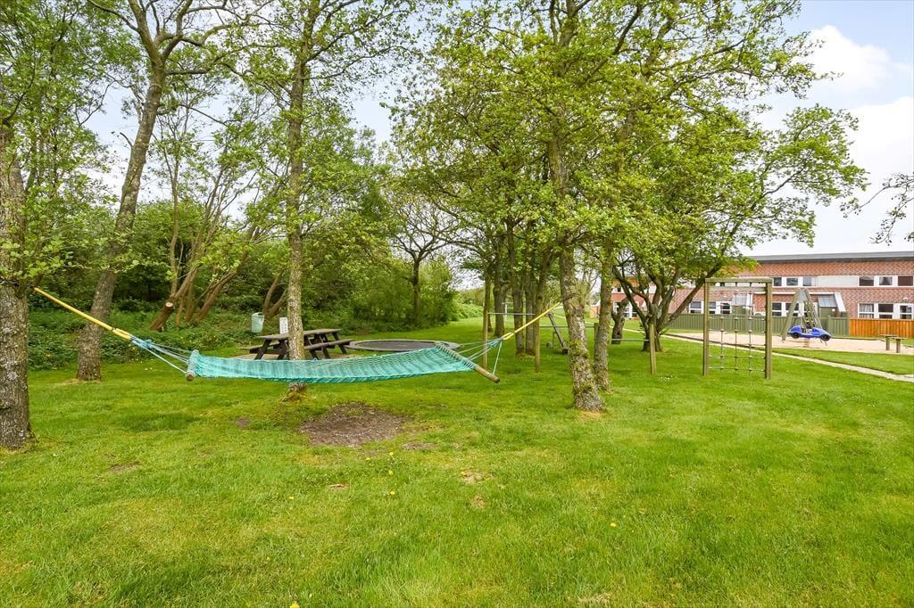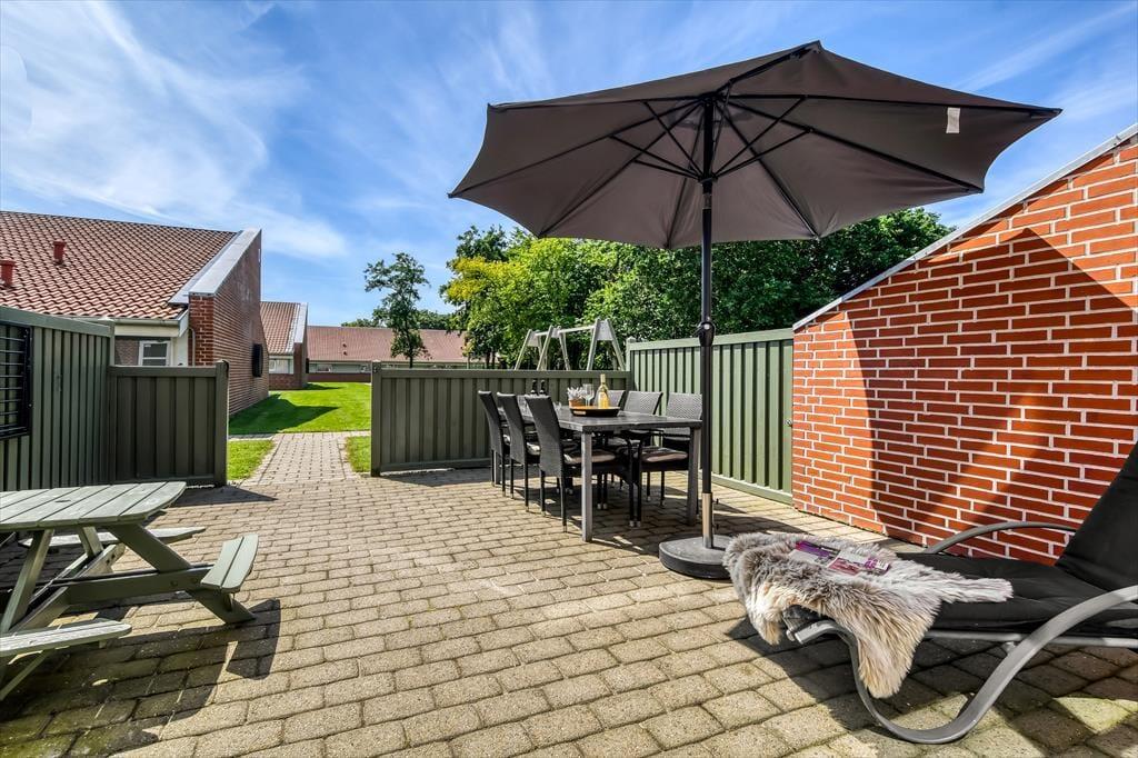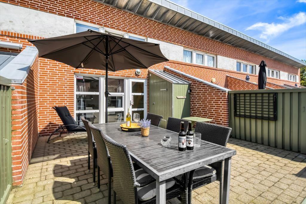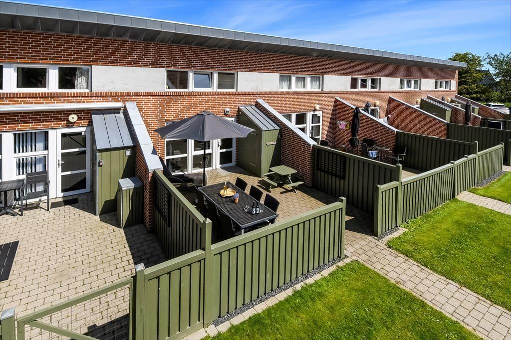 Fra stuen har I direkte adgang til en sydvestvendt fliseterrasse, der er aflukket med hegn ud mod naboerne og de grønne fællesarealer. Her er der havemøbler og liggestole til rådighed, når I bare vil tage den med ro og nyde det gode vejr – og skal der være mere gang i den, har I masser af plads til at boltre jer på fællesarealerne, hvor I blandt andet kan spille petanque, beachvolley og tennis. Lejligheden ligger tæt på områdets fælles legepladser, hvor der bl.a. er en stor sandkasse, gynger og rutschebaner.