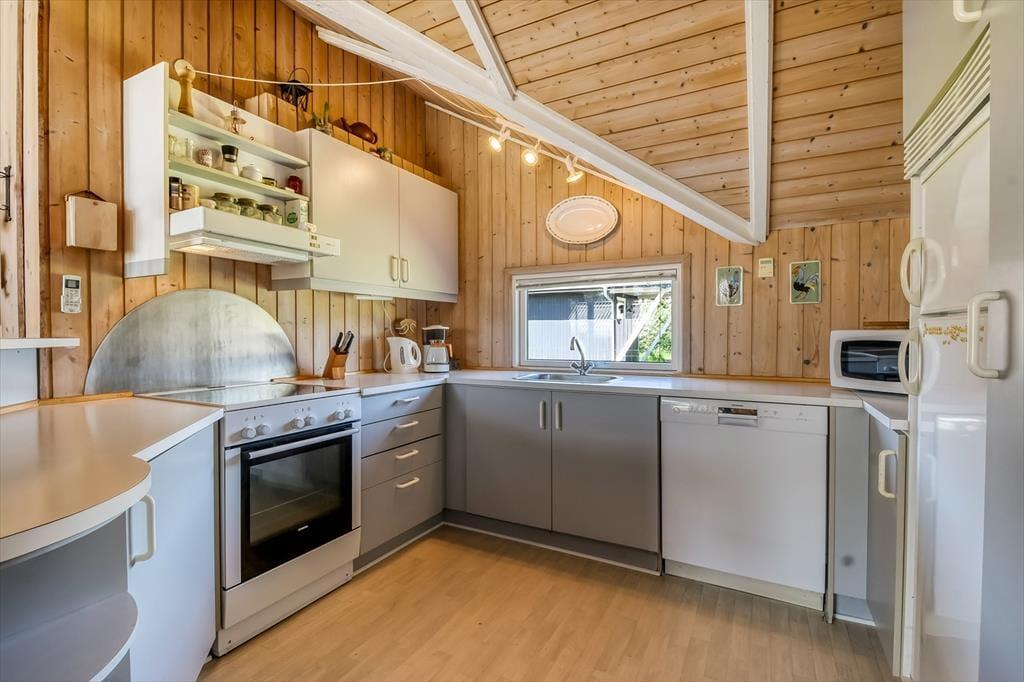 Fra det øjeblik du træder ind i sommerhuset, mærker du en hjemlig varme og en helt særlig atmosfære, der indbyder til afslapning og samvær. Indretningen kombinerer det lyse og luftige med charmerende detaljer og hyggelige kroge, hvor du kan smække benene op med en god bog, spille kortspil med børnene eller bare nyde den ro, som kun ferie kan give. Stuen og køkkenet ligger i åben forbindelse, så snakken kan gå over gryderne, og den afslappede stemning breder sig naturligt i hele huset. Her er plads til at være sammen – og plads til at trække sig tilbage. Uanset om du nyder morgenkaffen i fred og ro eller en hyggelig spilleaften med familien, så danner sommerhuset de perfekte rammer om det gode ferieliv.