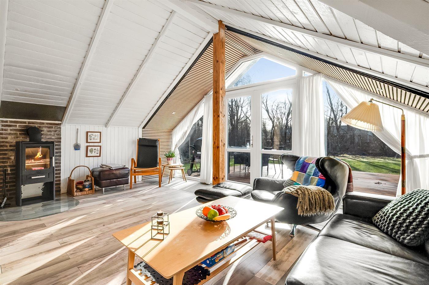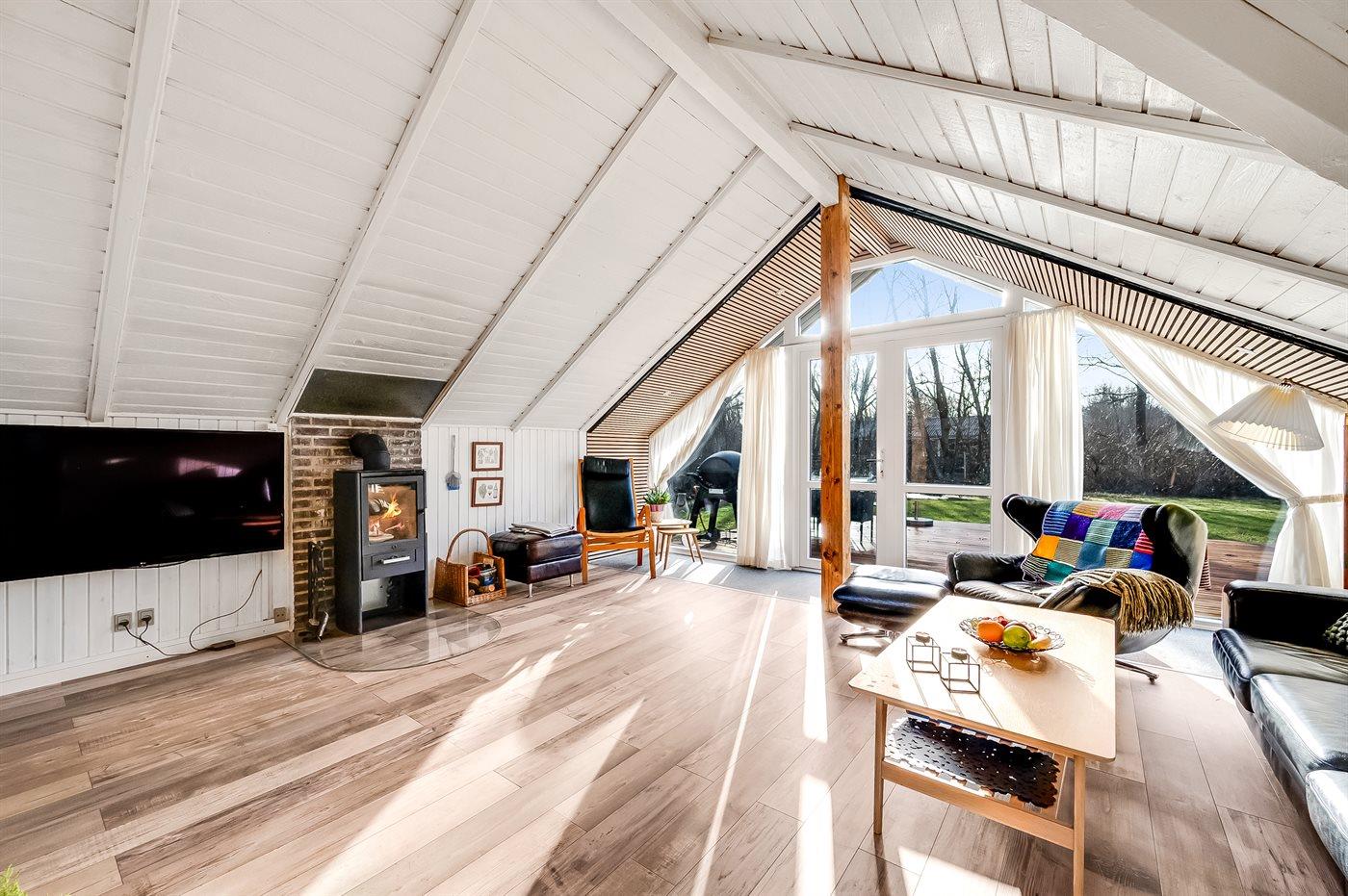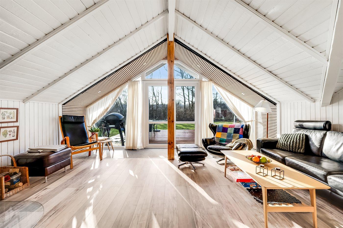 Sommerhusets indretning er lys og venlig, og når du træder ind i stuen, vil du straks bemærke det smukke loft, som tilføjer en følelse af plads, hygge og charme. Den store sofa er god at slænge sig i, og brændeovnen skaber en hyggelig atmosfære og er perfekt til de kølige aftener.