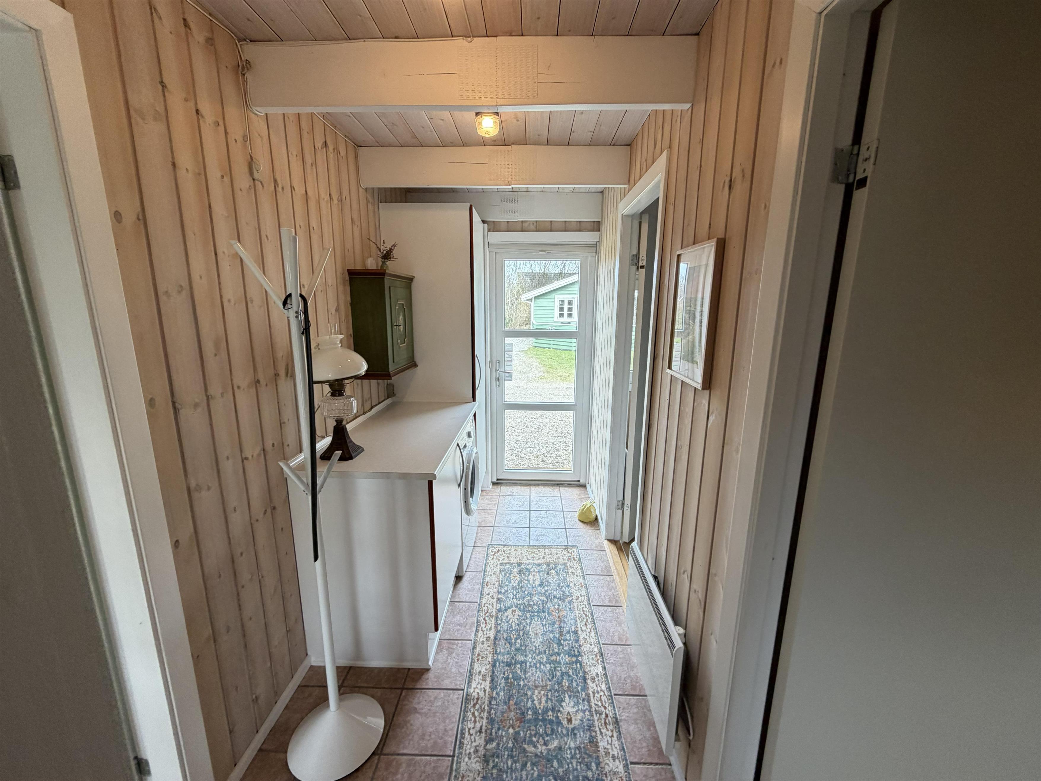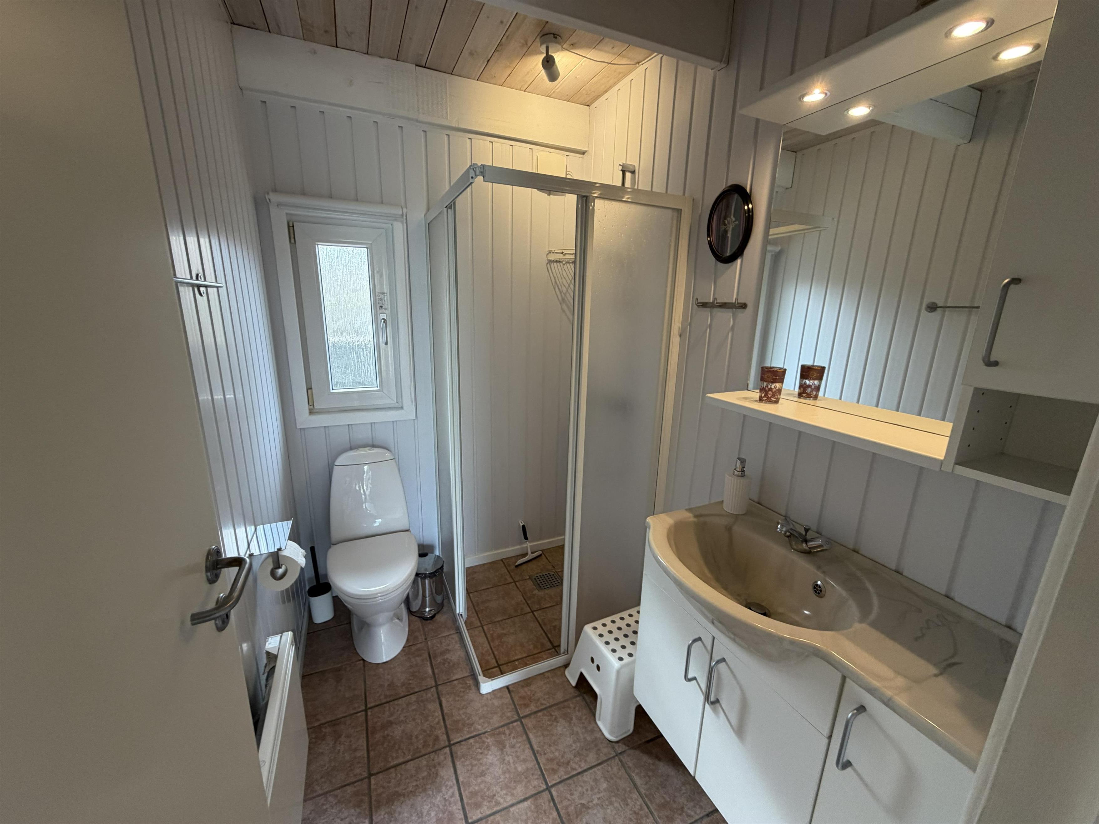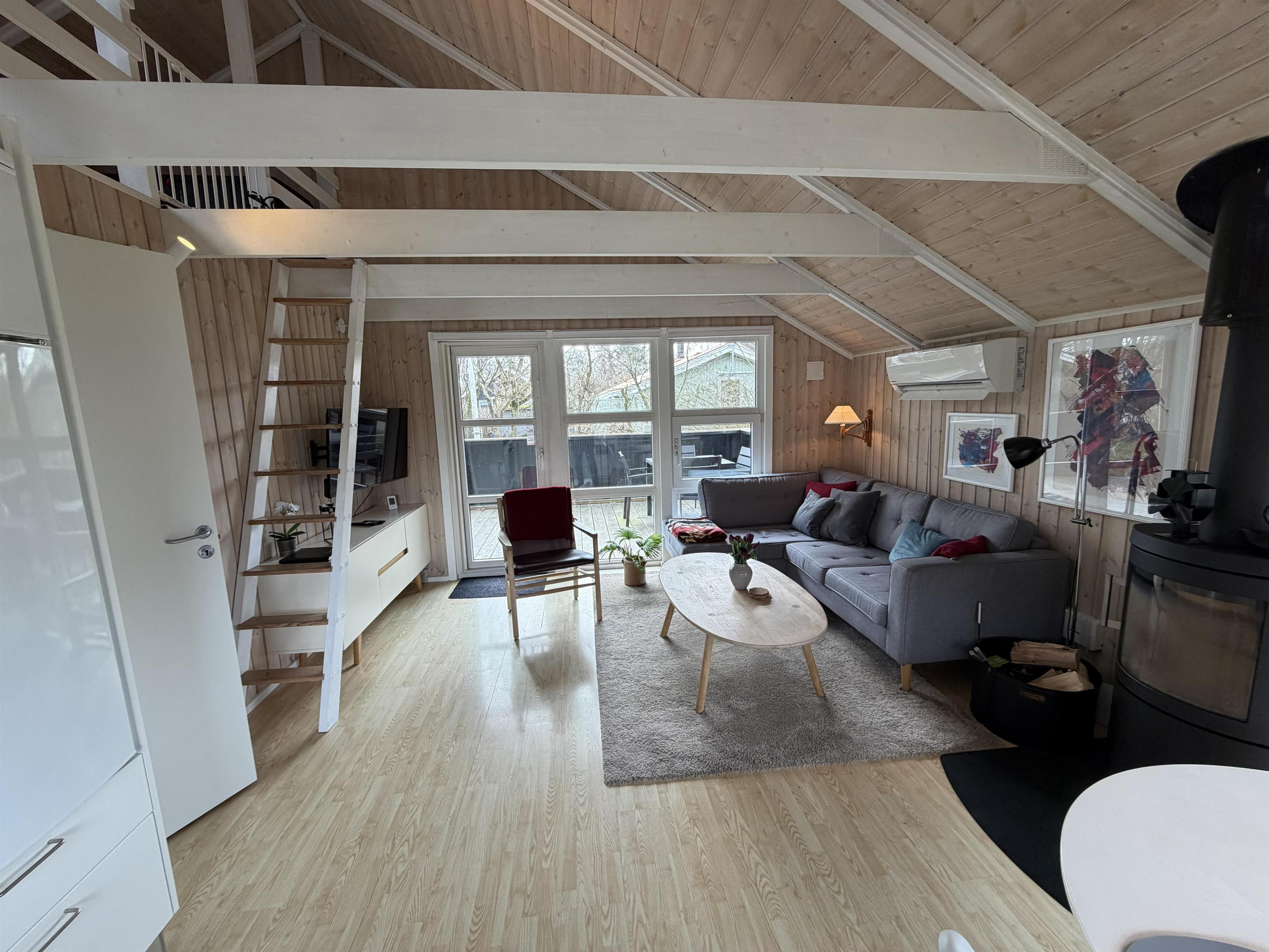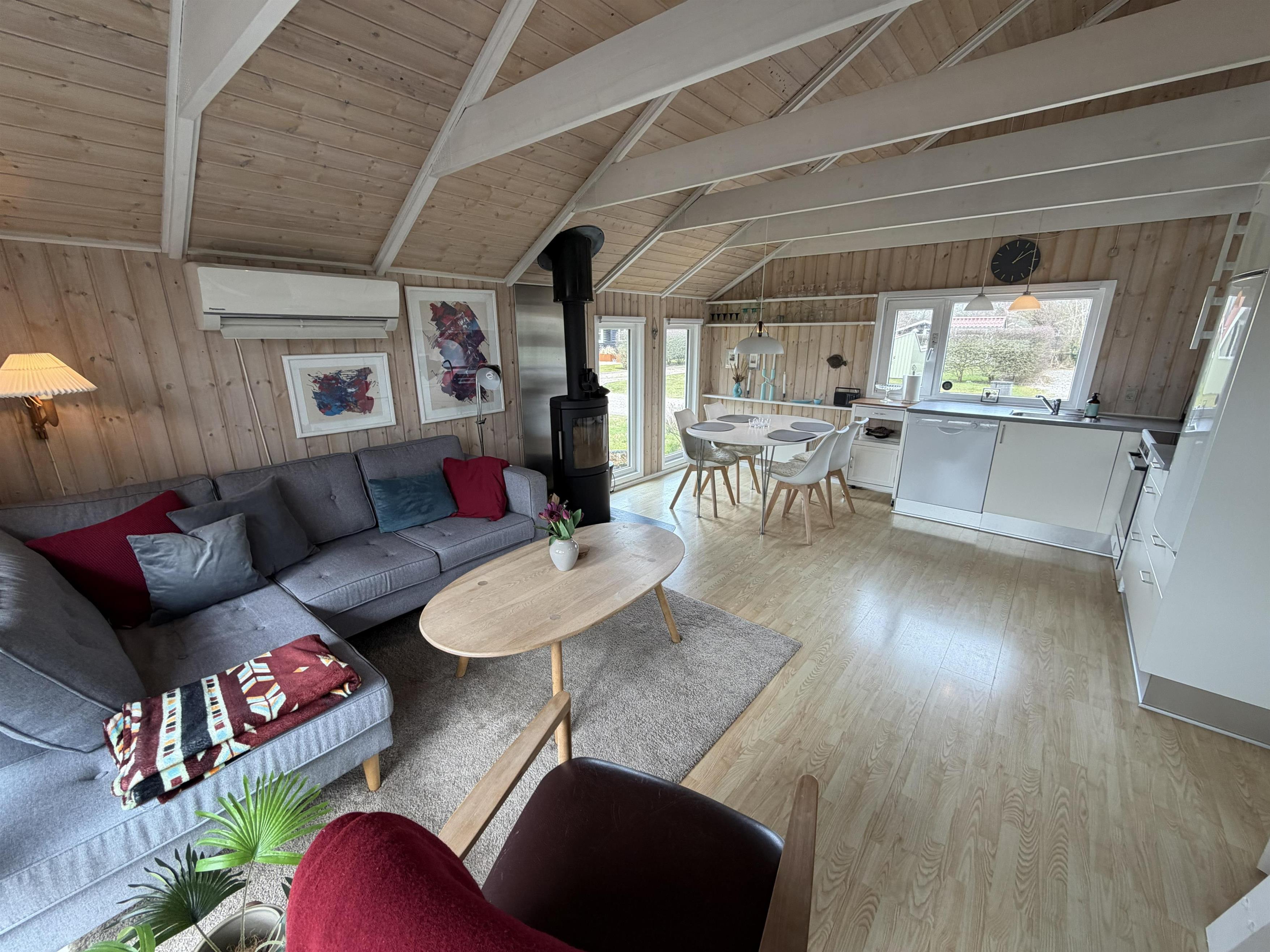 Når vejret skifter, giver luft til luft varmepumpen et behageligt indeklima, og brændeovnen skaber ekstra varme og feriestemning på kølige aftener. Badeværelset har gulvvarme, som gør morgenerne mere behagelige og lettere at overskue.