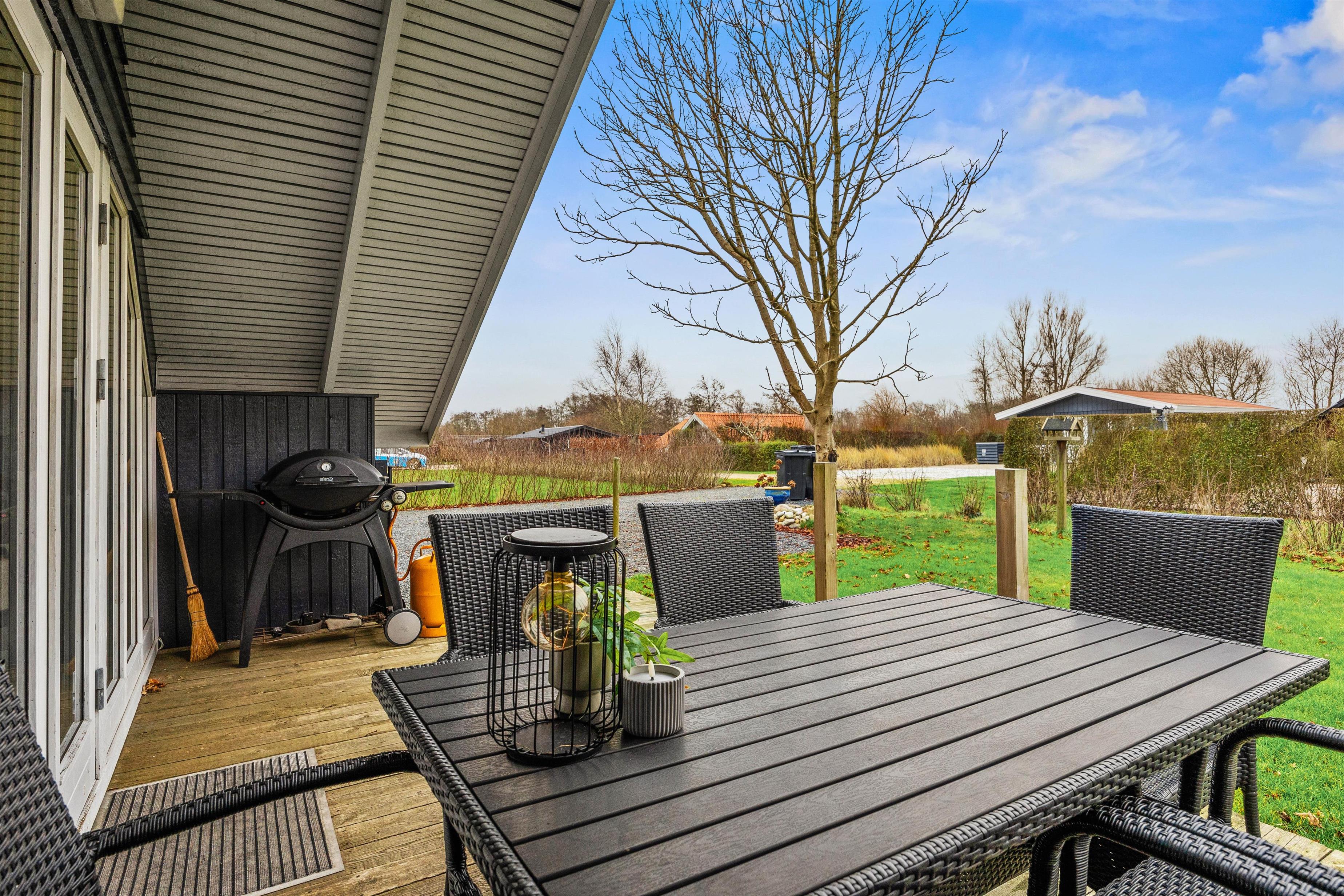 Fra opholdsstuen kommer I ud på sommerhusets delvist overdækkede terrasse, som er udstyret med gode havemøbler og solsenge – perfekte til ren afslapning. Her kan I nyde solen eller jeres egen grillede mad, tilberedt på sommerhusets gasgrill. Den 633 m² store grund med græs giver plads til at lege og måske en omgang vikingespil.