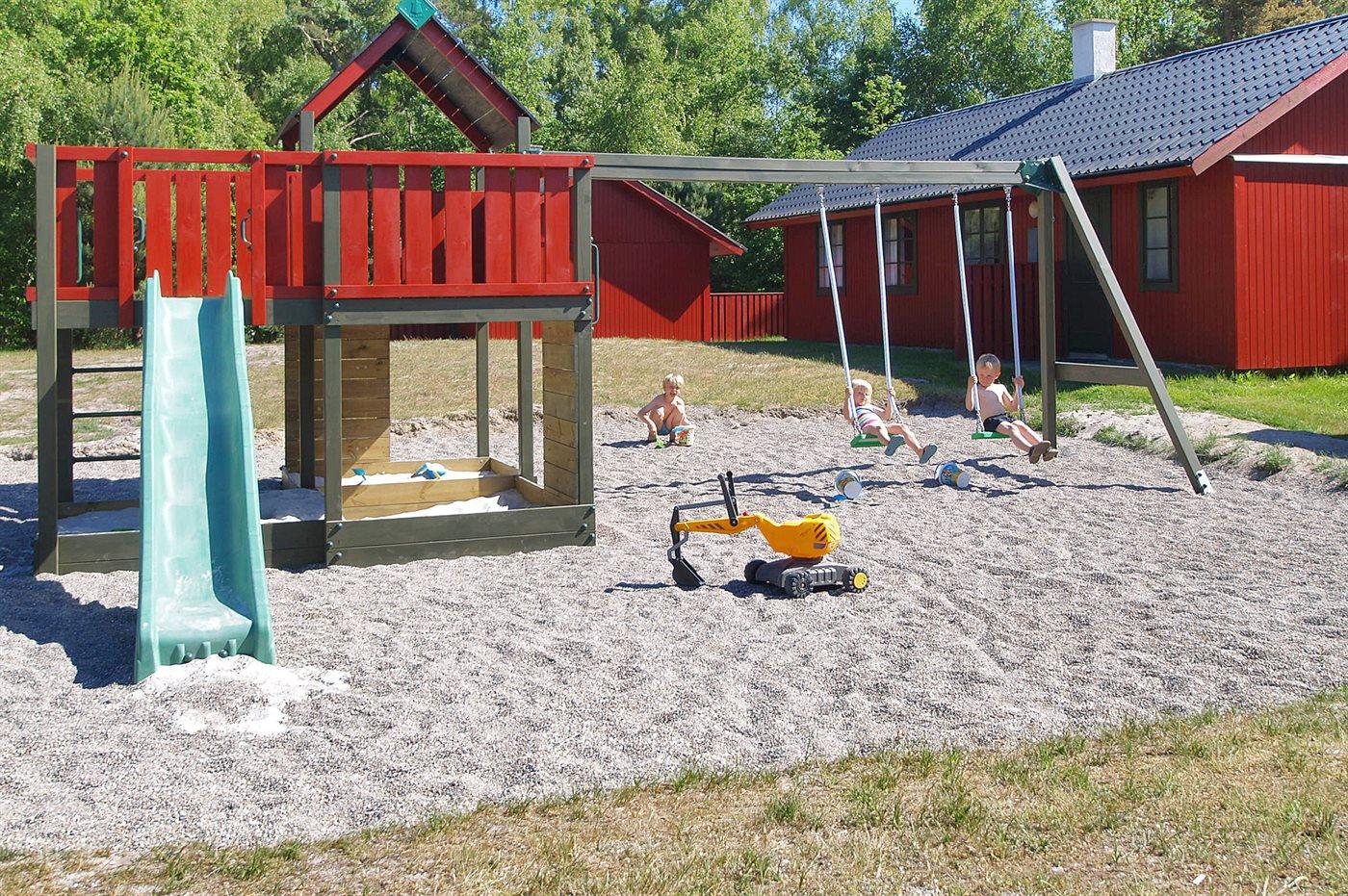 I området findes gynge, rutschebane og sandkasse samt mulighed for at spille fodbold, basketball og petanque. Den store naturgrund mellem husene giver rig mulighed for leg. Huset fremstår indbydende og velplejet - beliggende nær swimmingpoolen og hovedbygningen.