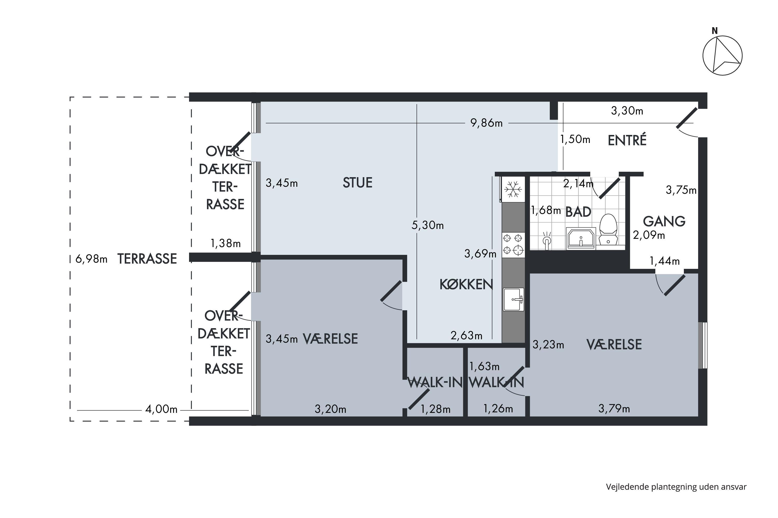 Fra den rummelige entré kommer man ind i lys stue i åben forbindelse med køkken og med udgang til terrasse. Her er spiseplads til 4 personer, rummeligt sofamøblement og TV med gratis danske kanaler. Det velindrettede køkken har komfur med keramiske kogeplader og ovn, stort køle-/fryseskab og opvaskemaskine. Med indgang fra stuen finder man dejligt soveværelse med dobbeltseng og udgang til terrasse, og fra entréen er der indgang til stort, lyst soveværelse med dobbeltseng, i alt 4 sovepladser. Lækkert, stilrent badeværelse med bruseniche og gulvvarme. Der er internetadgang. Der må kun grilles med gasgrill på terrassen.