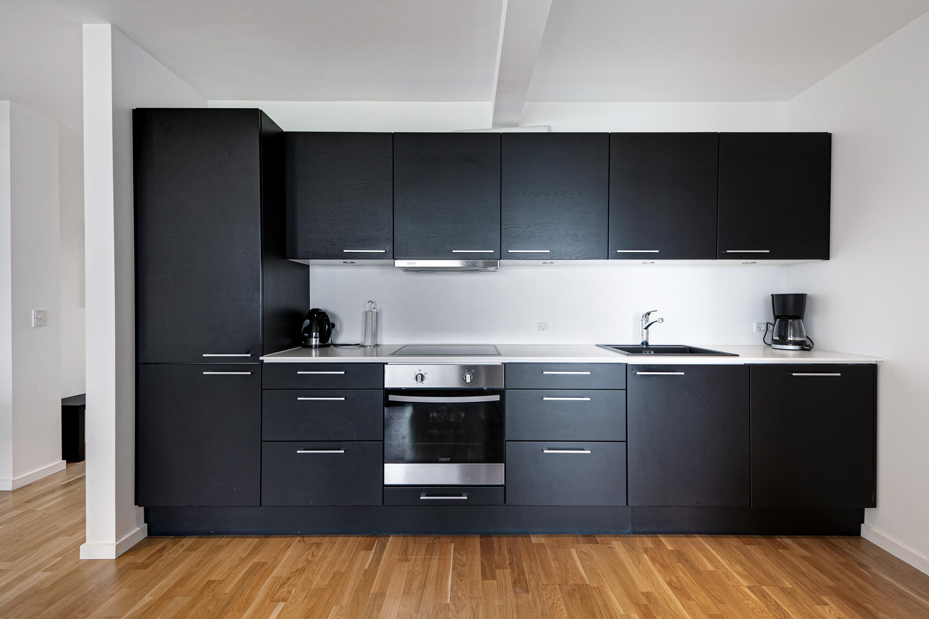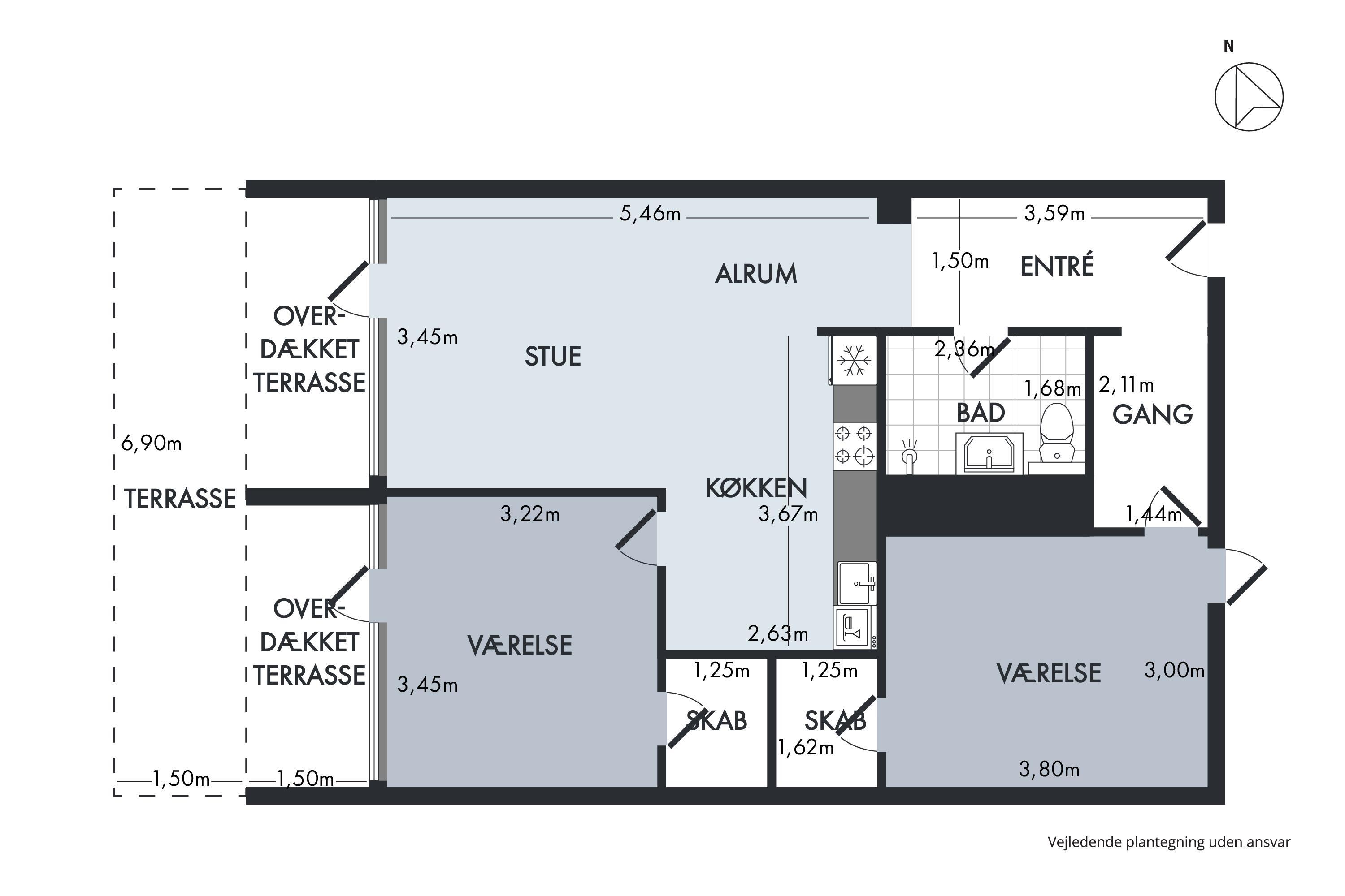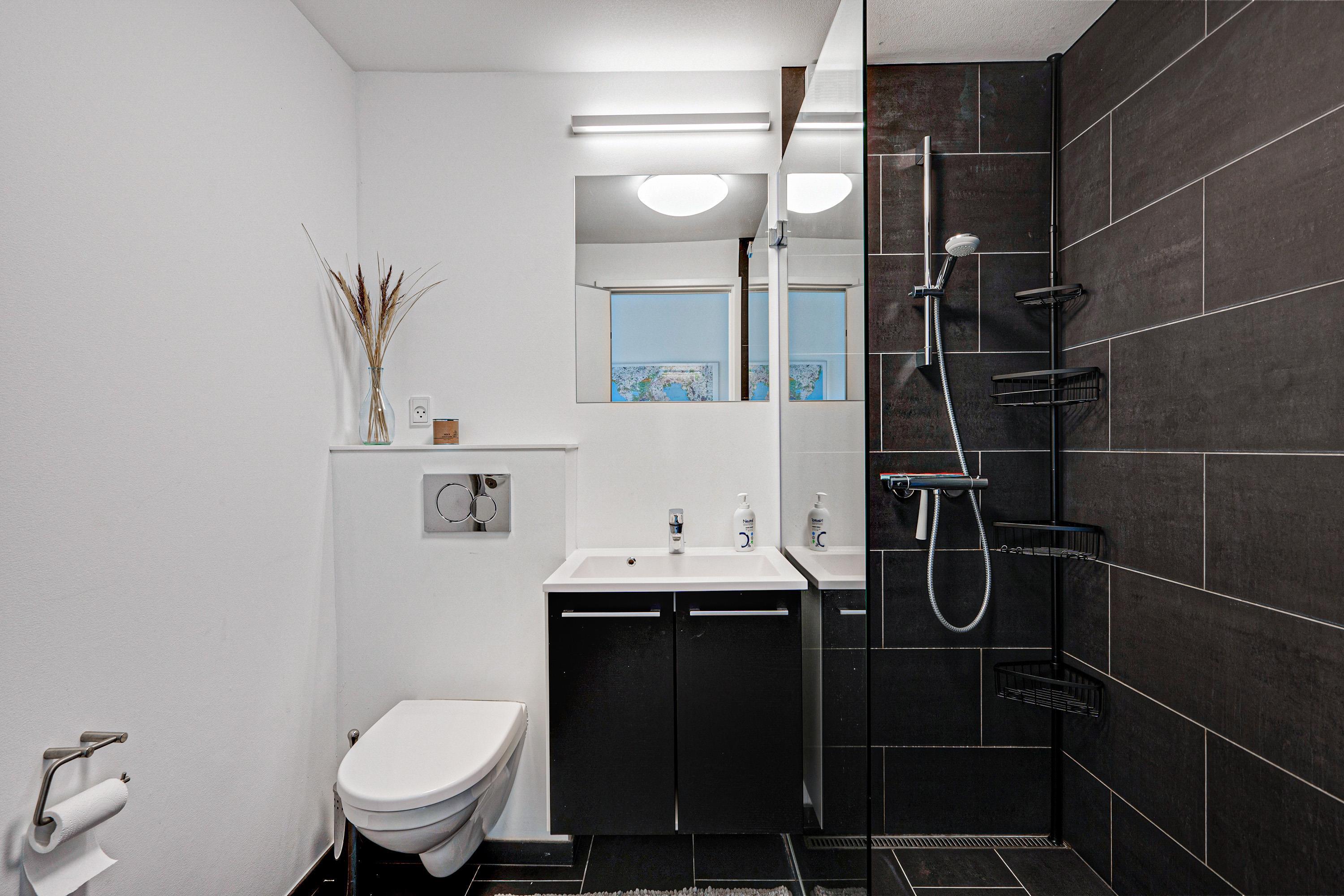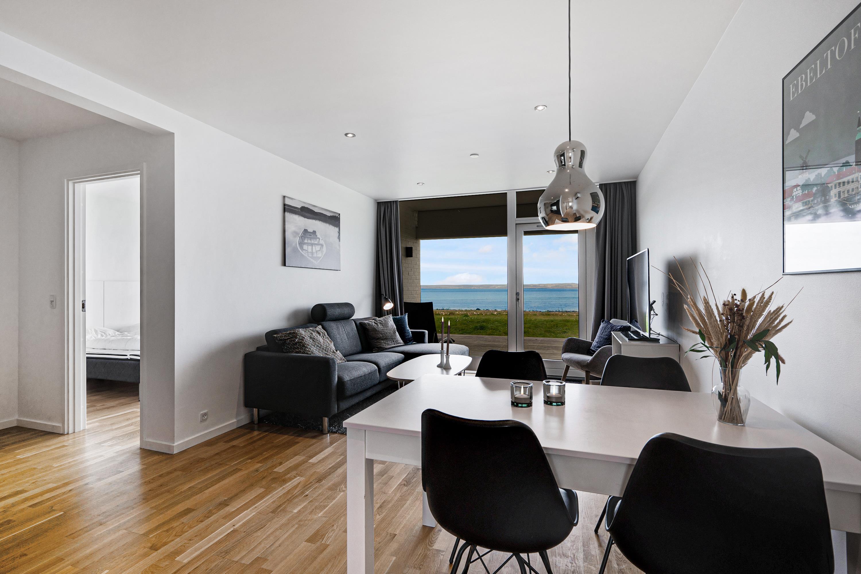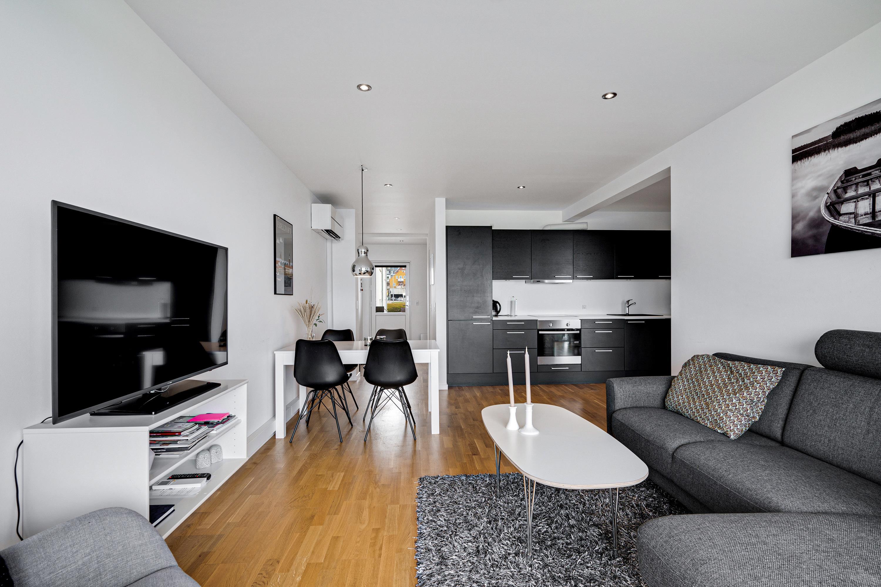 Fra den rummelige entré kommer man ind i lys og velmøbleret stue i åben forbindelse med køkken og med udgang til terrasse. Her er spiseplads til 4 personer, sofamøblement og TV med Chromecast. Køkkenet har komfur med keramiske kogeplader og ovn, køle-/fryseskab og opvaskemaskine. Med indgang fra stuen finder man dejligt soveværelse med dobbeltseng og udgang til terrasse, og fra entreen er der indgang til stort soveværelse med dobbeltseng – i alt 4 sovepladser. Lækkert, stilrent badeværelse med bruseniche og gulvvarme. Der er internetadgang.