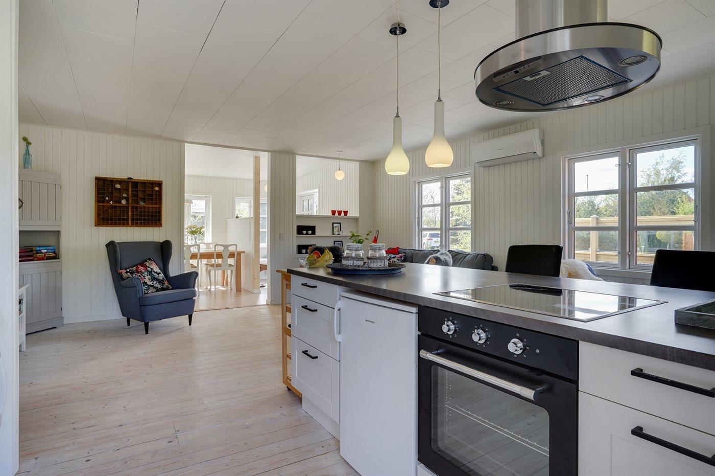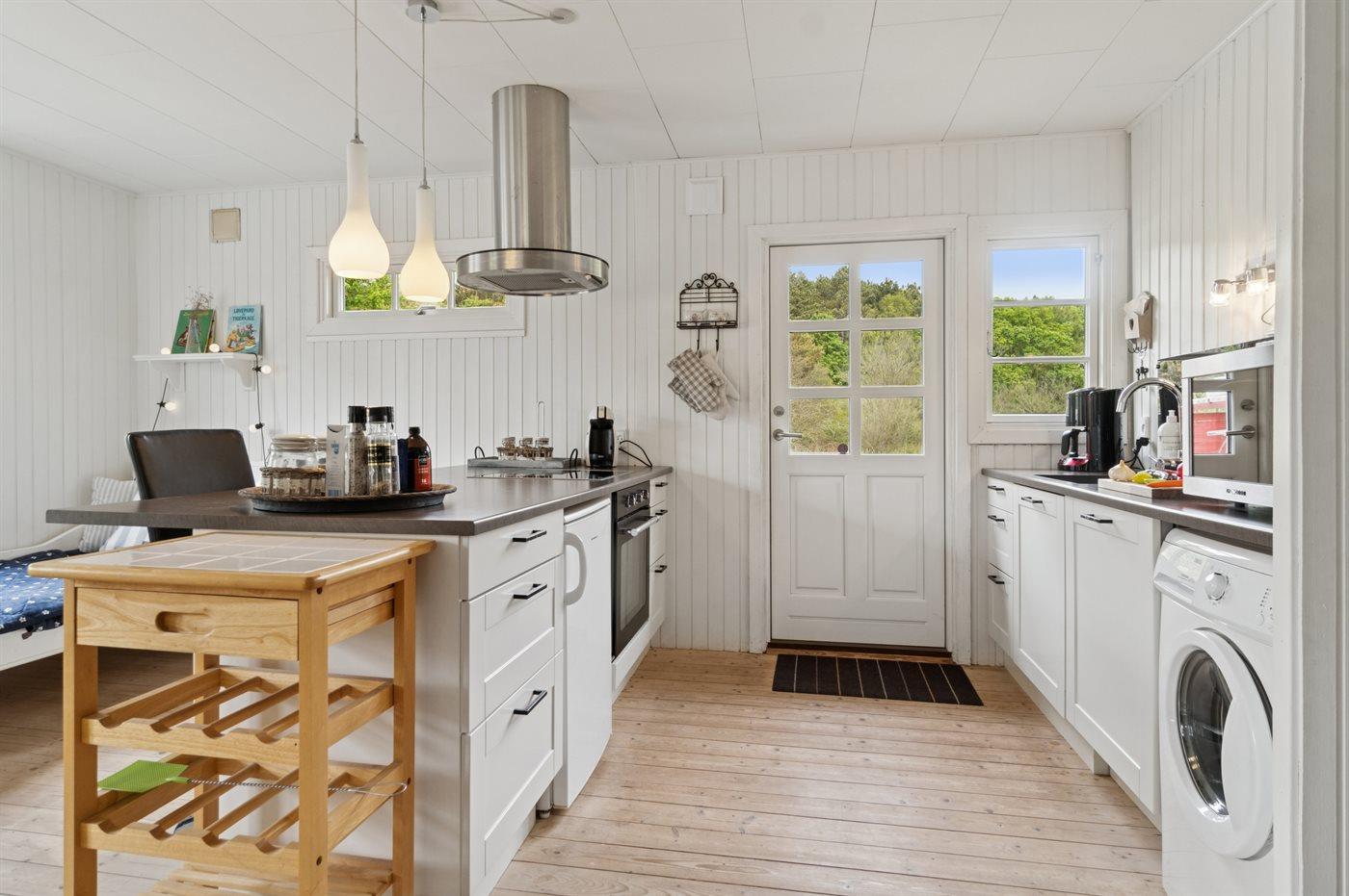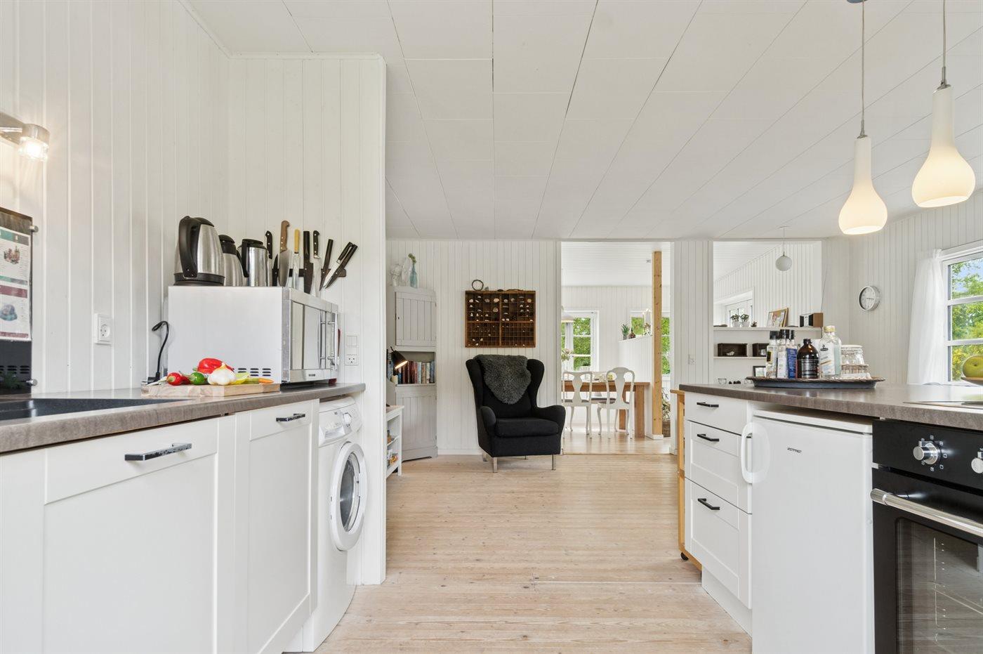 Køkkenet er udstyret med 1 køleskab. Der er 4 keramiske kogeplader, varmluftovn, mikrobølgeovn samt opvaskemaskine.