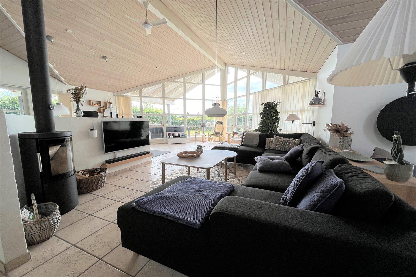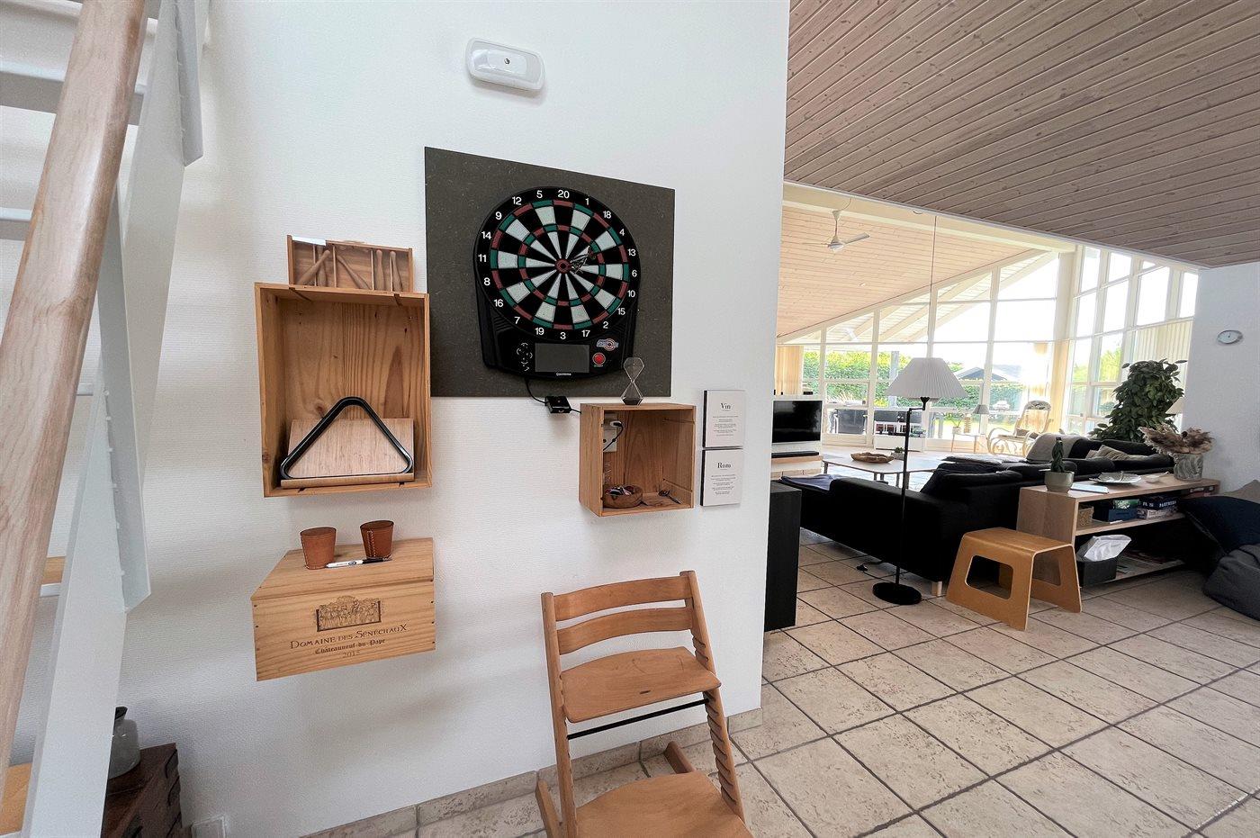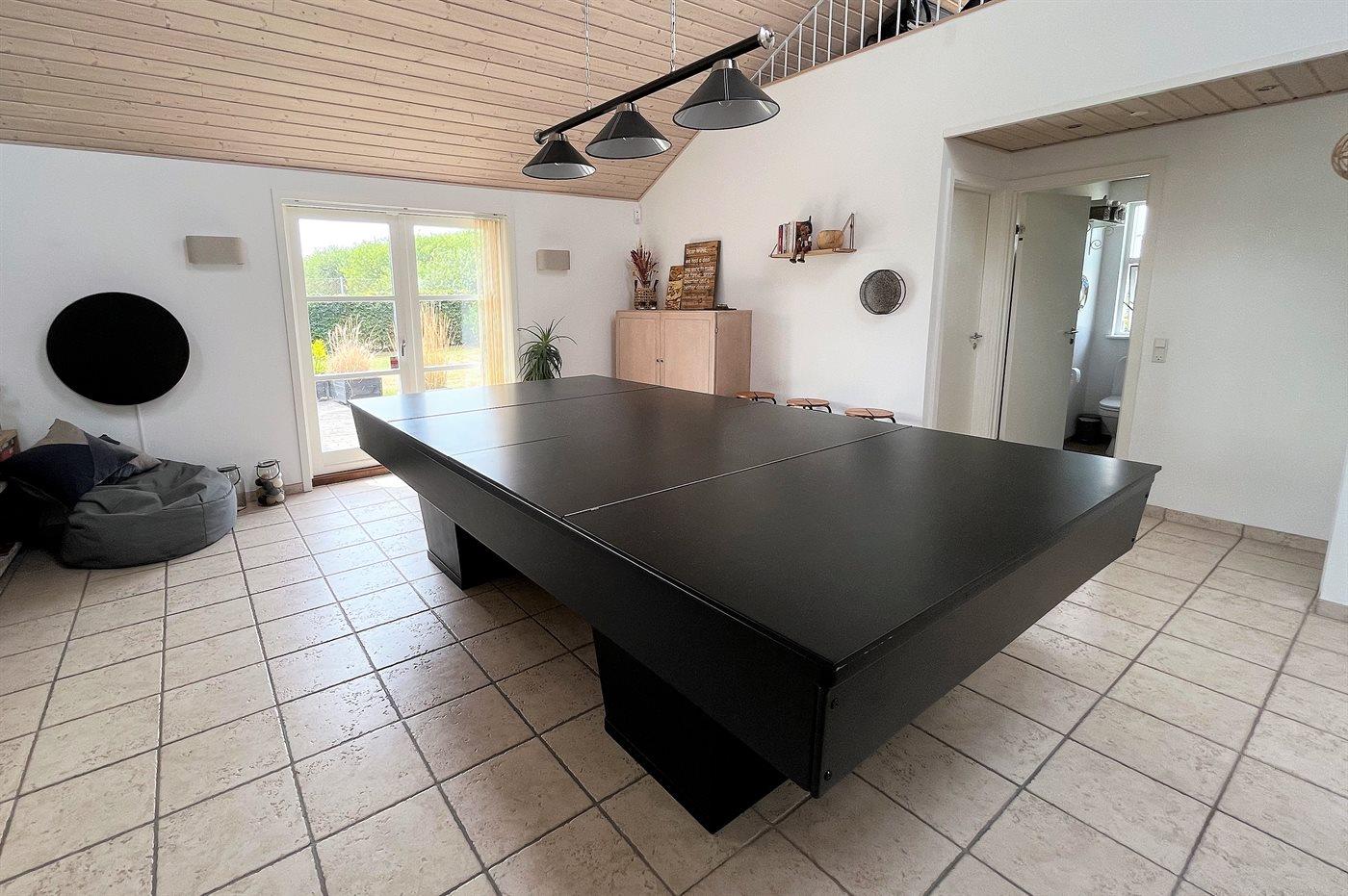 Kun 350 meter fra vandet, i et meget attraktivt feriehusområde, ligger dette skønne sommerhus. Huset er velindrettet med to gode soveafdelinger og dejlige fællesområder med loft til kip. Centralt i huset findes et stort og eksklusivt billardbord samt dart og surroundsound-anlæg. Herfra fører en trappe op til husets hems, hvor der findes et stort TV og Playstation4 med racer-rat og pedaler - en rigtig spillehule for børn og barnlige sjæle. Udenfor findes en dejlig have med gode terrasser samt en udebruser, hvor du kan skylle dig efter en tur på stranden, eller når du blot trænger til at blive kølet af.