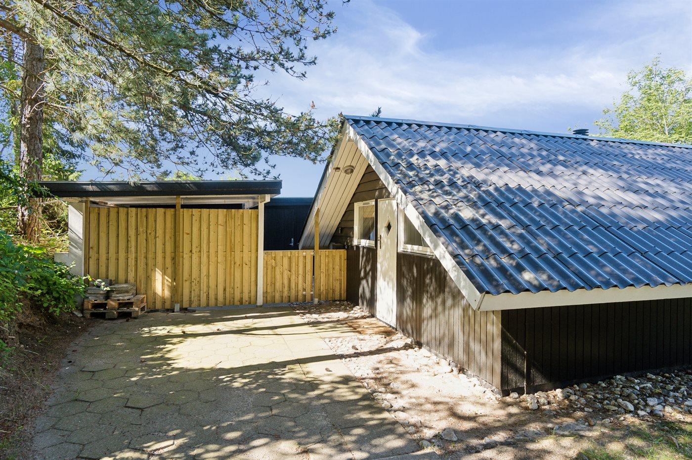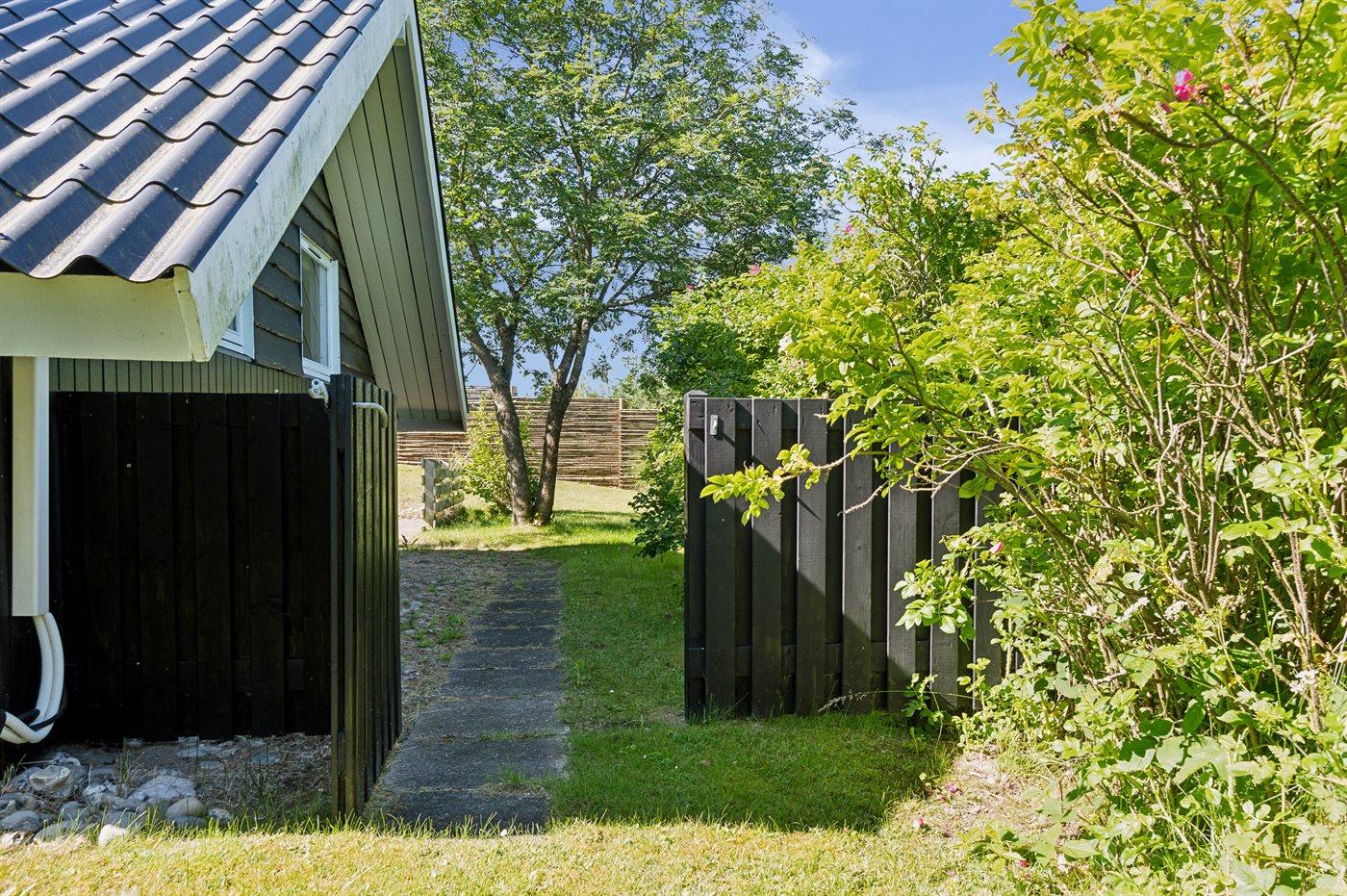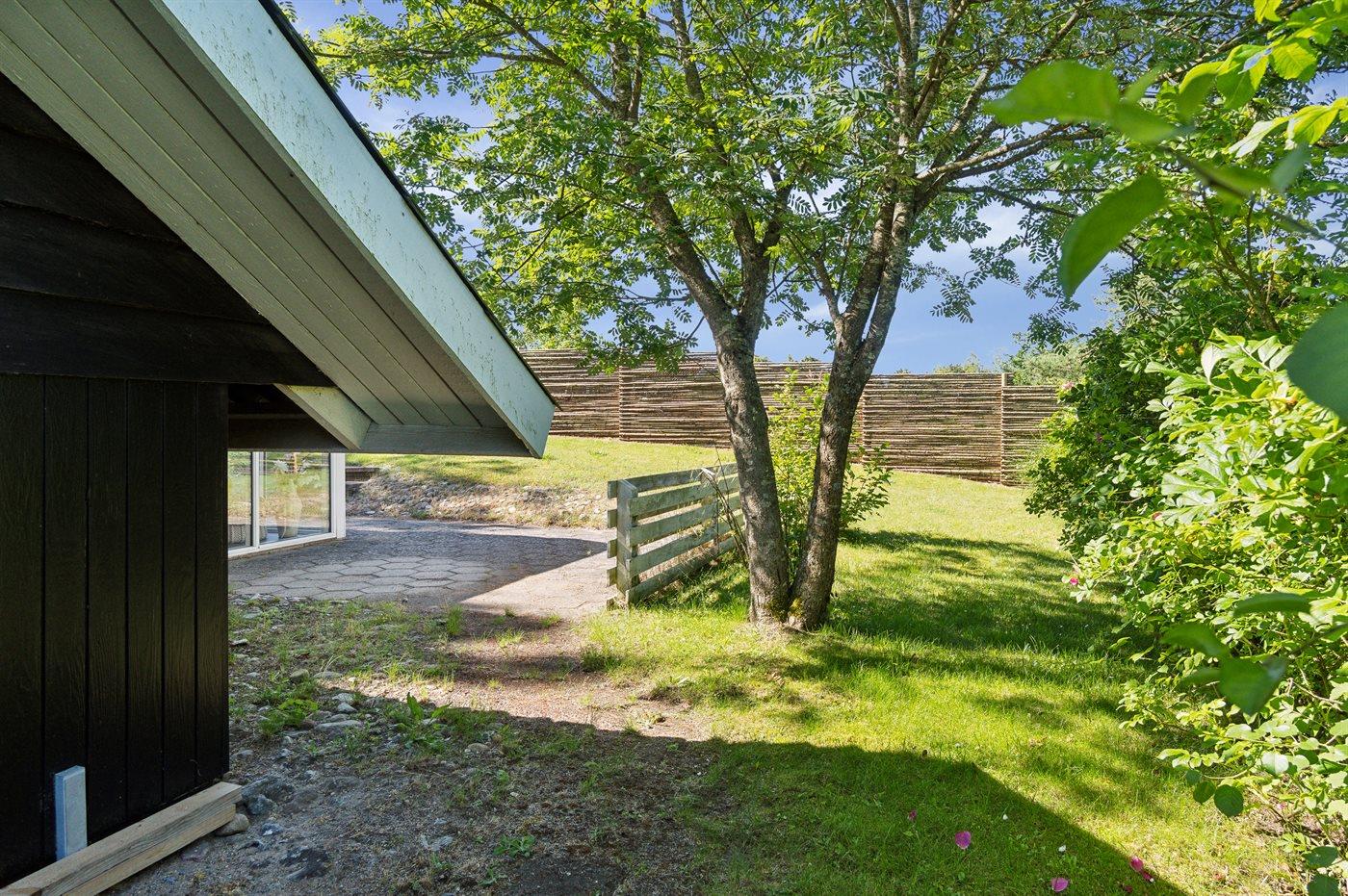 Ferieboligen er beliggende på en 900 m² stor naturgrund. Grunden er indhegnet. Der er 800 m til havet. Nærmeste forretning er beliggende i en afstand af 800 m. Til ferieboligen hører åbent terrasseareal. Desuden er der overdækket terrasse. Der er redskabsrum. Grill til rådighed. Parkering ved ferieboligen.
