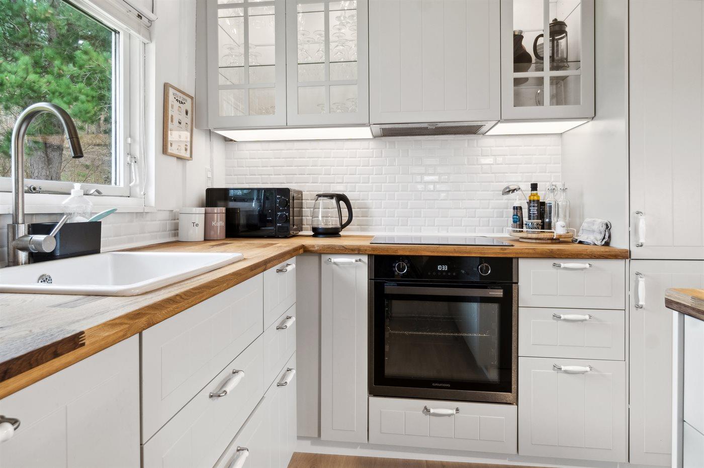 Køkkenet er udstyret med 1 køleskab. Der er 4 induktionskogeplader, varmluftovn, mikrobølgeovn samt opvaskemaskine.