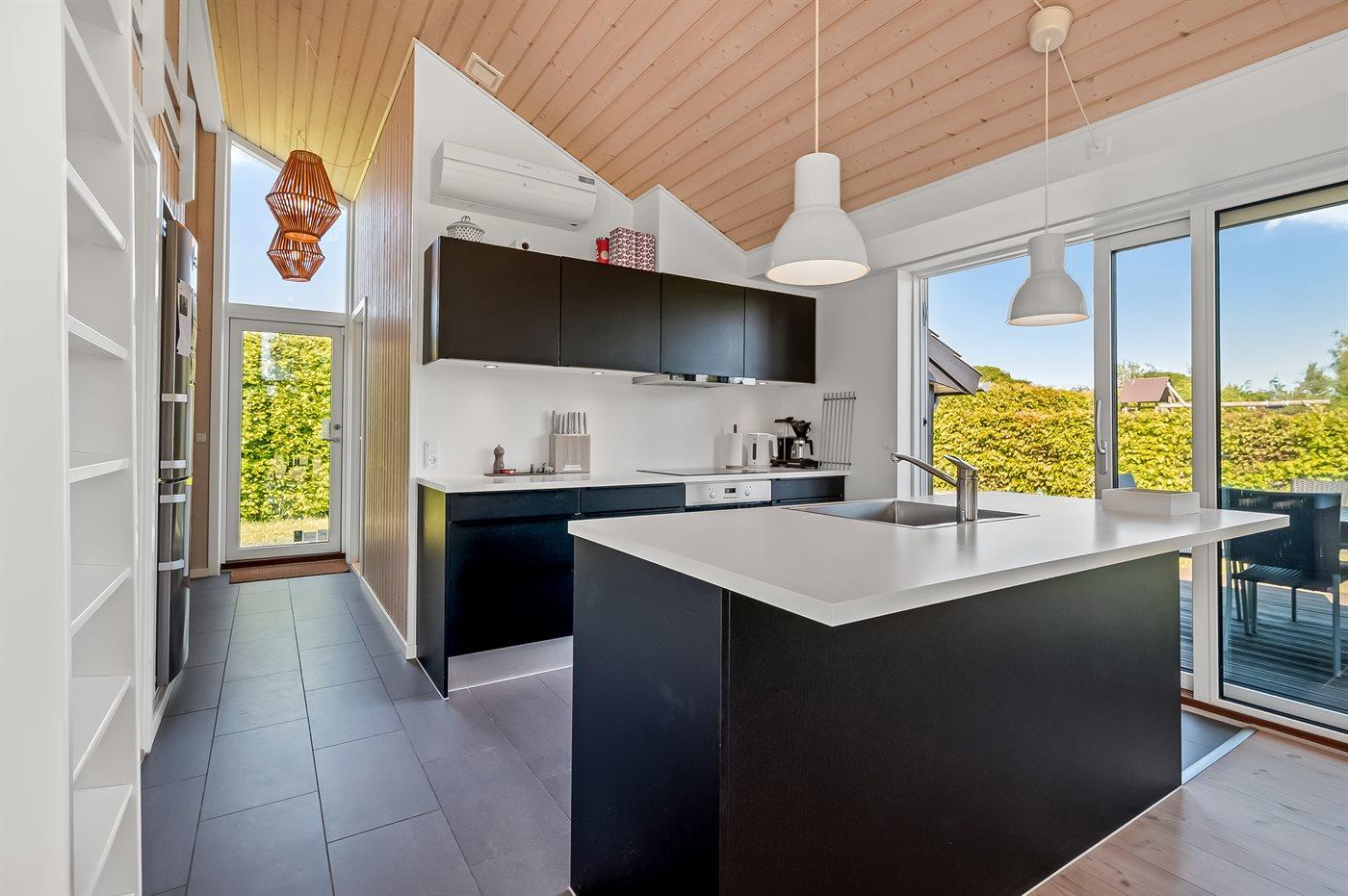Køkkenet er udstyret med 1 køleskab. Der er 4 keramiske kogeplader, varmluftovn samt opvaskemaskine.