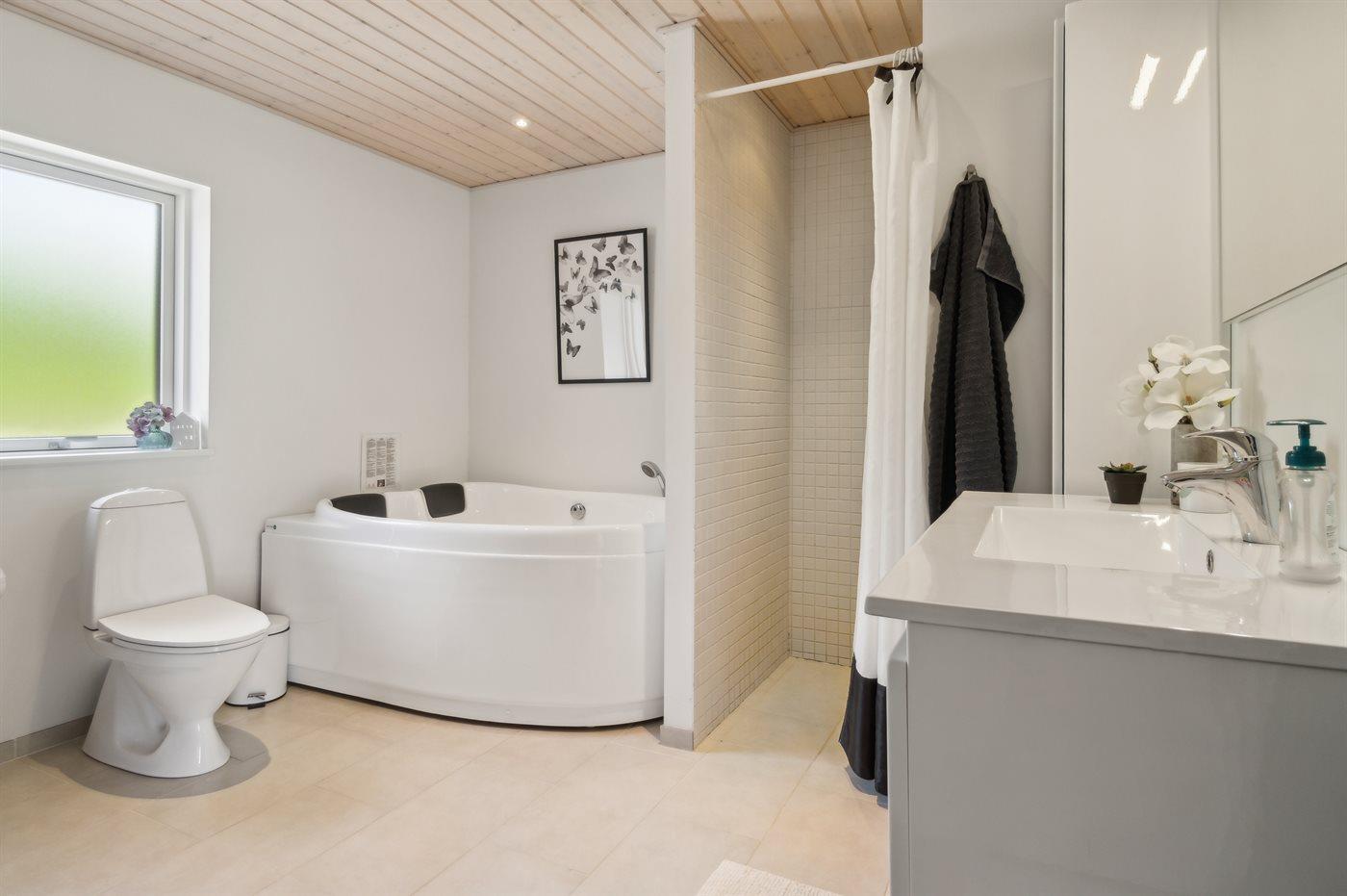 Der er 1 badeværelse med bruseniche og 2 toiletter, heraf 1 gæstetoilet. Der er gulvvarme på 1 badeværelse. Der er gulvvarme på gæstetoilettet. I den infrarøde sauna er der mulighed for afslapning for 2 personer.