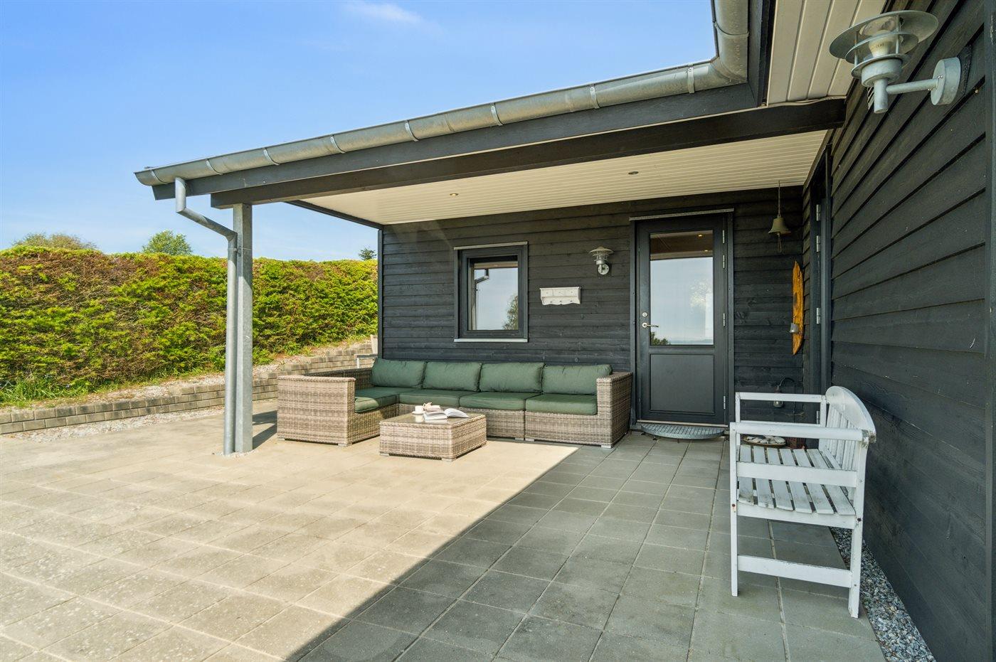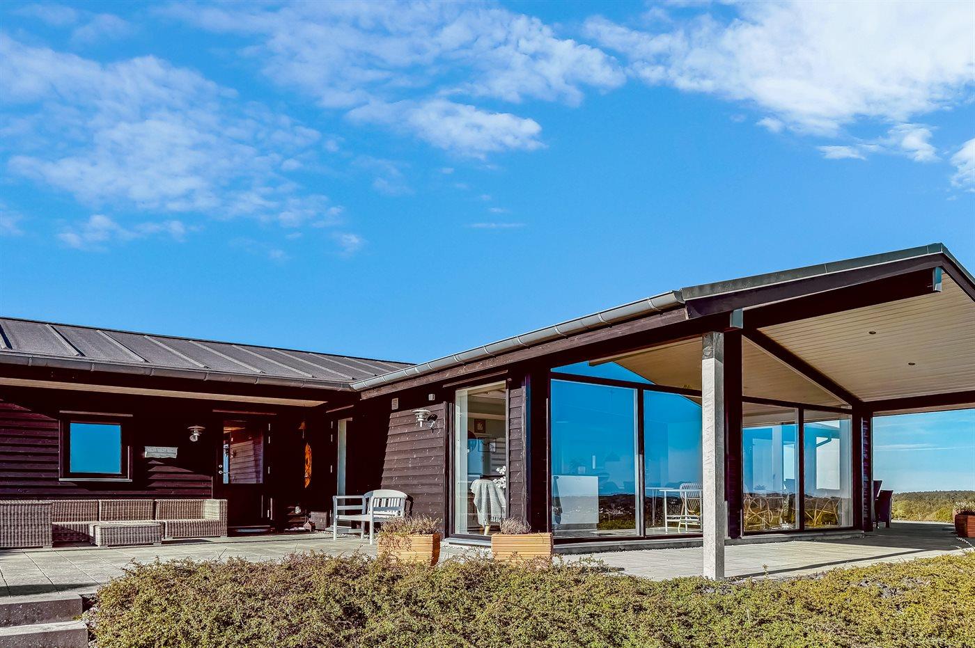Ferieboligen er beliggende på en 1200 m² stor naturgrund. Der er 700 m til havet. Nærmeste forretning er beliggende i en afstand af 2500 m. Til ferieboligen hører 100 m² terrasseareal. Desuden er der 40 m² overdækket terrasse. Grill til rådighed. Der er installeret stik til opladning af elbil. Type 2 stik. Med 11 kW ladeeffekt. Parkering ved ferieboligen.
