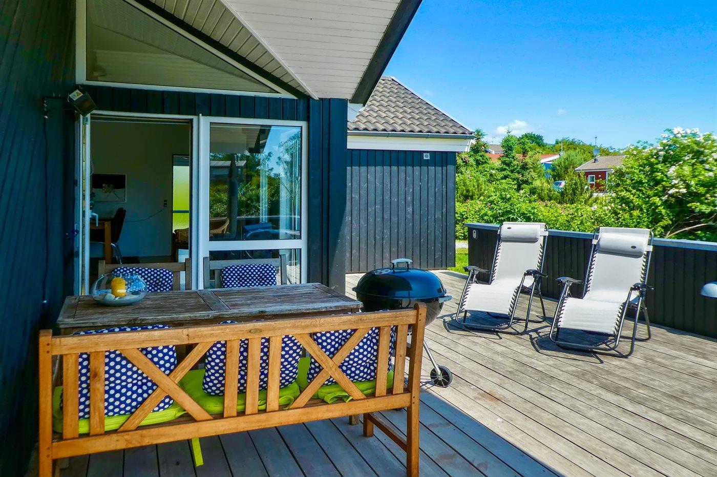 Omkring huset er der 2 store afskærmede terrasser (47 m2 og 30 m2), samt en 20 m2 overdækket terrasse med terrassevarmere. Der er gode havemøbler, solsenge og grill.