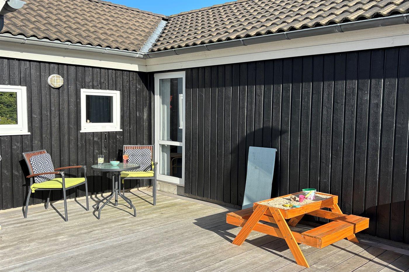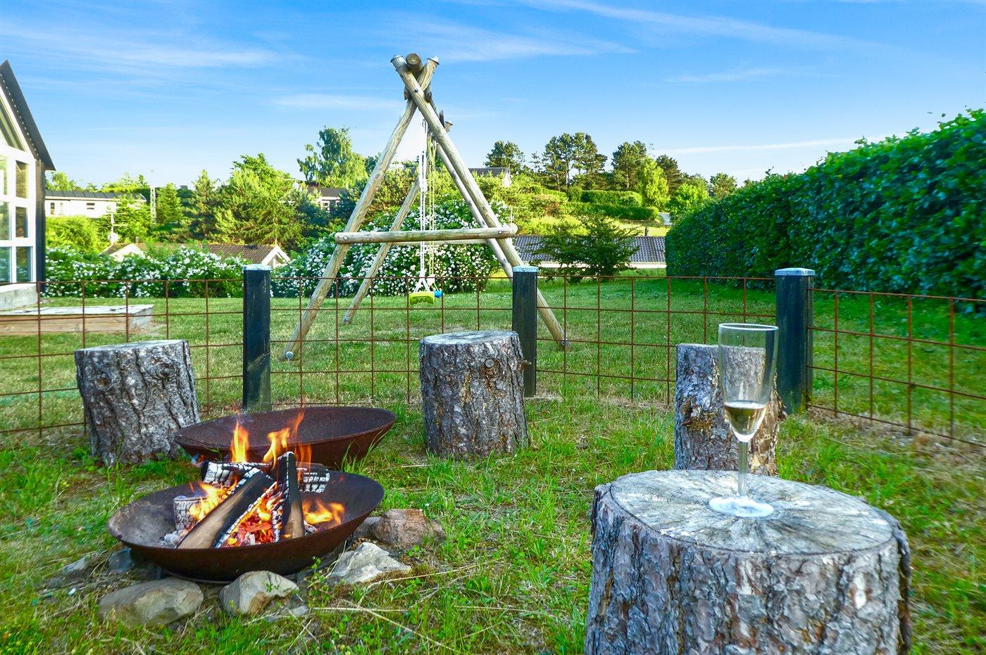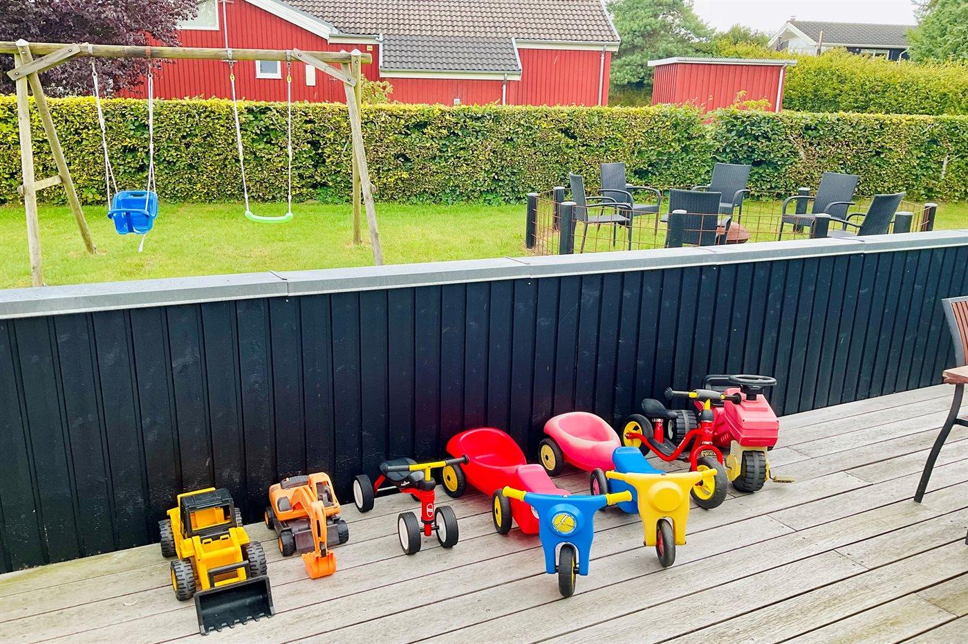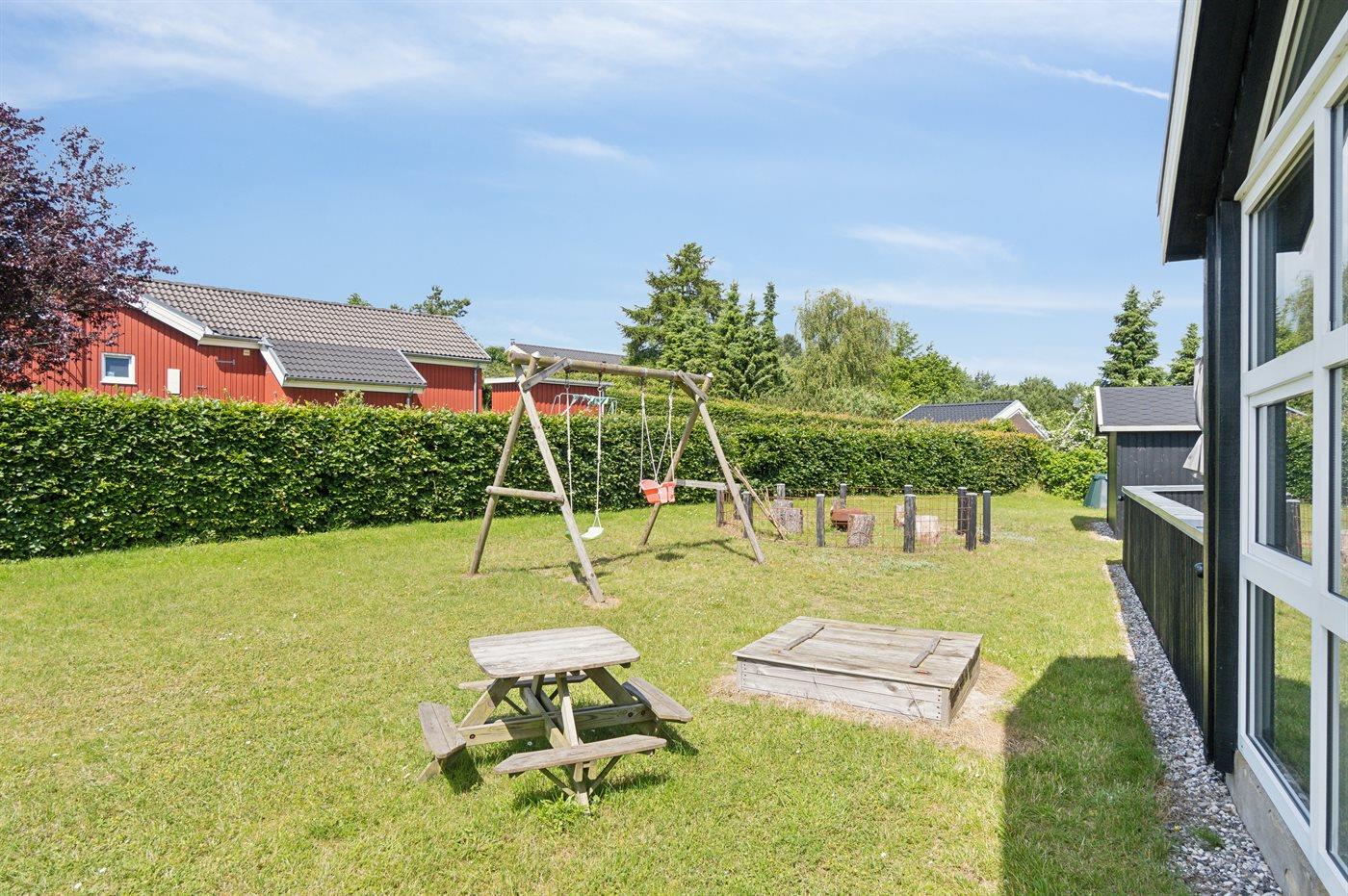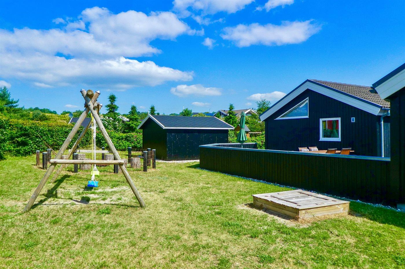 I haven er der gynger, kasse med spil til såvel små som store, flere køretøjer til de små, lukket sandkasse med masser af legetøj, samt god bålplads. Masser af plads til leg, spil eller blot hygge og afslapning.
