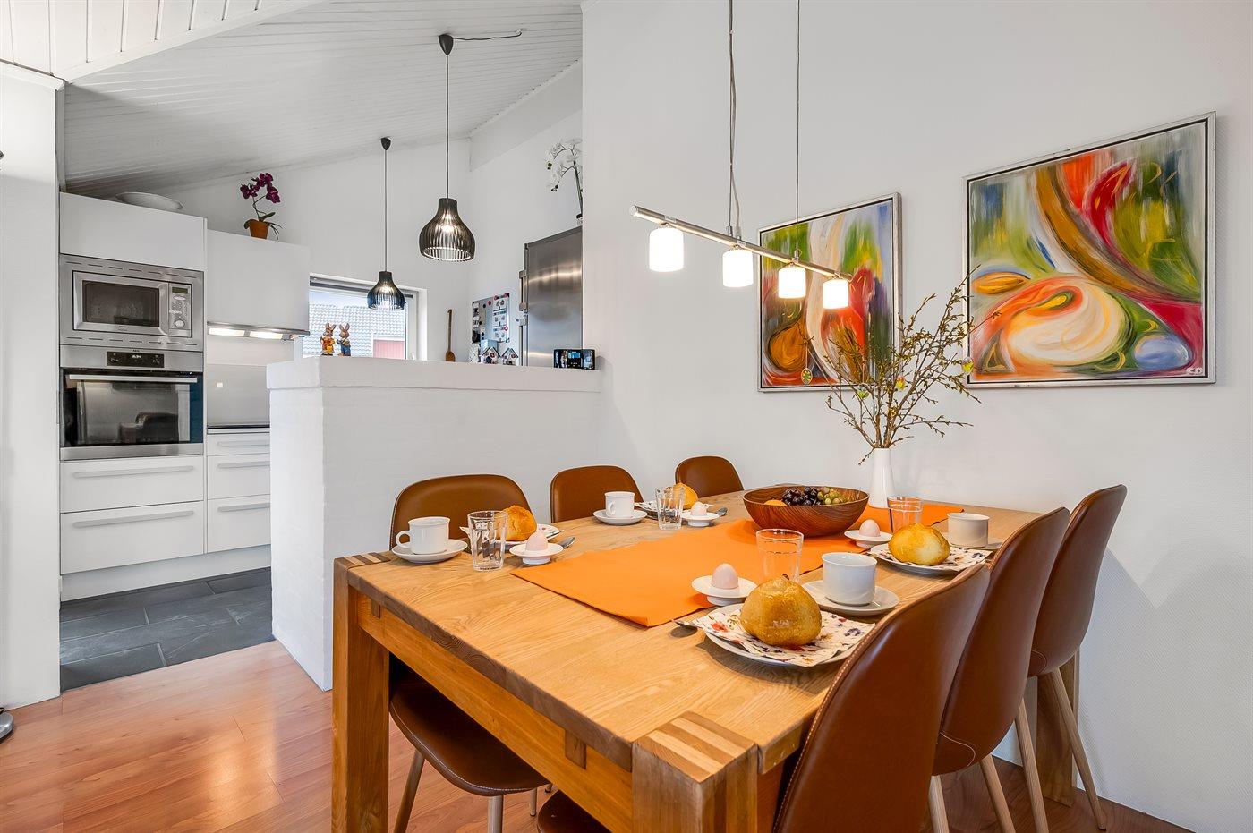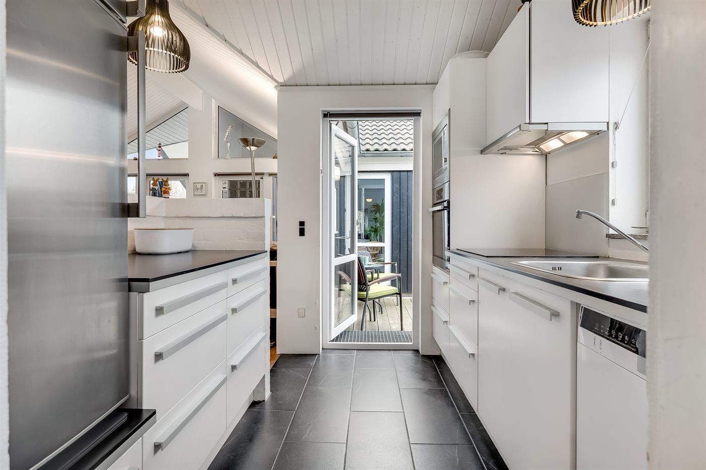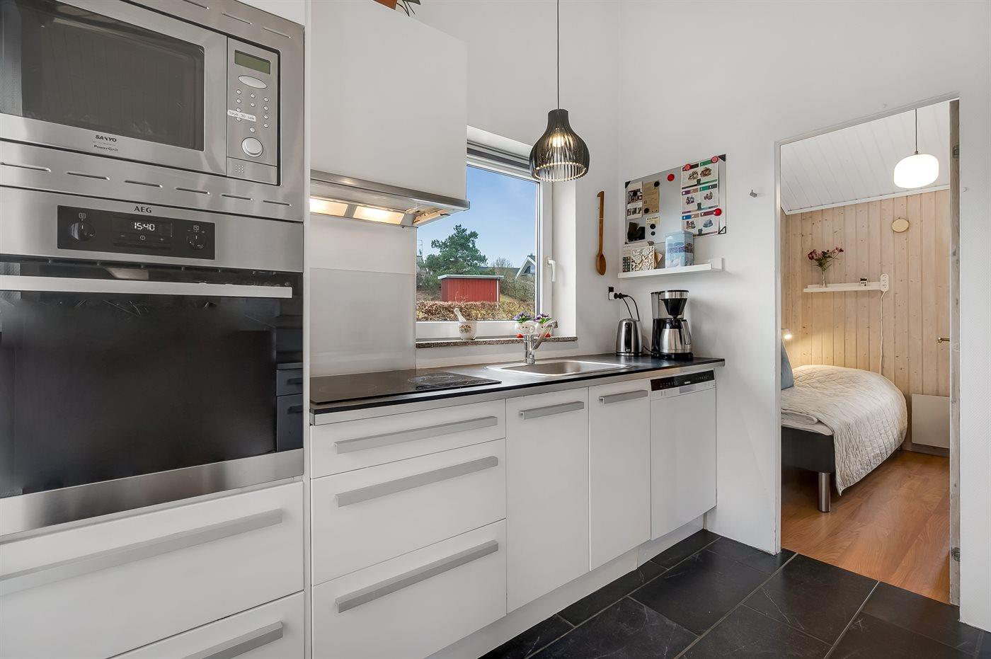 I tilknytning til stuen findes køkkenet, der er veludstyret og har ny opvaskemaskine, komfur med keramiske kogeplader, køle/fryseskab, varmluftovn og mikroovn.