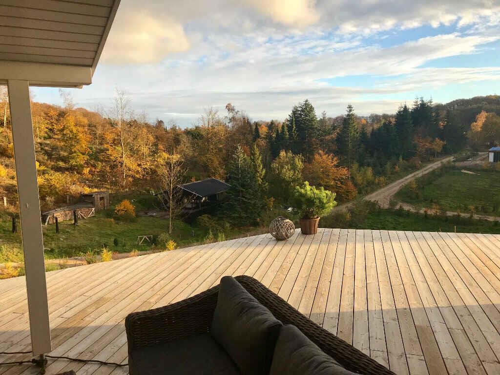 Femmøller feriehus ved Ebeltoft med unik udsigt, spa, aktivitetsrum og to terrasser.