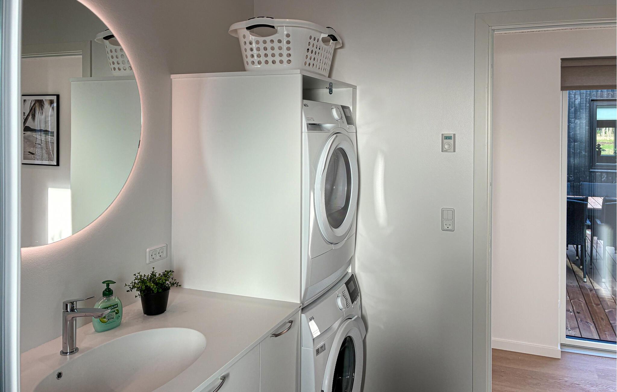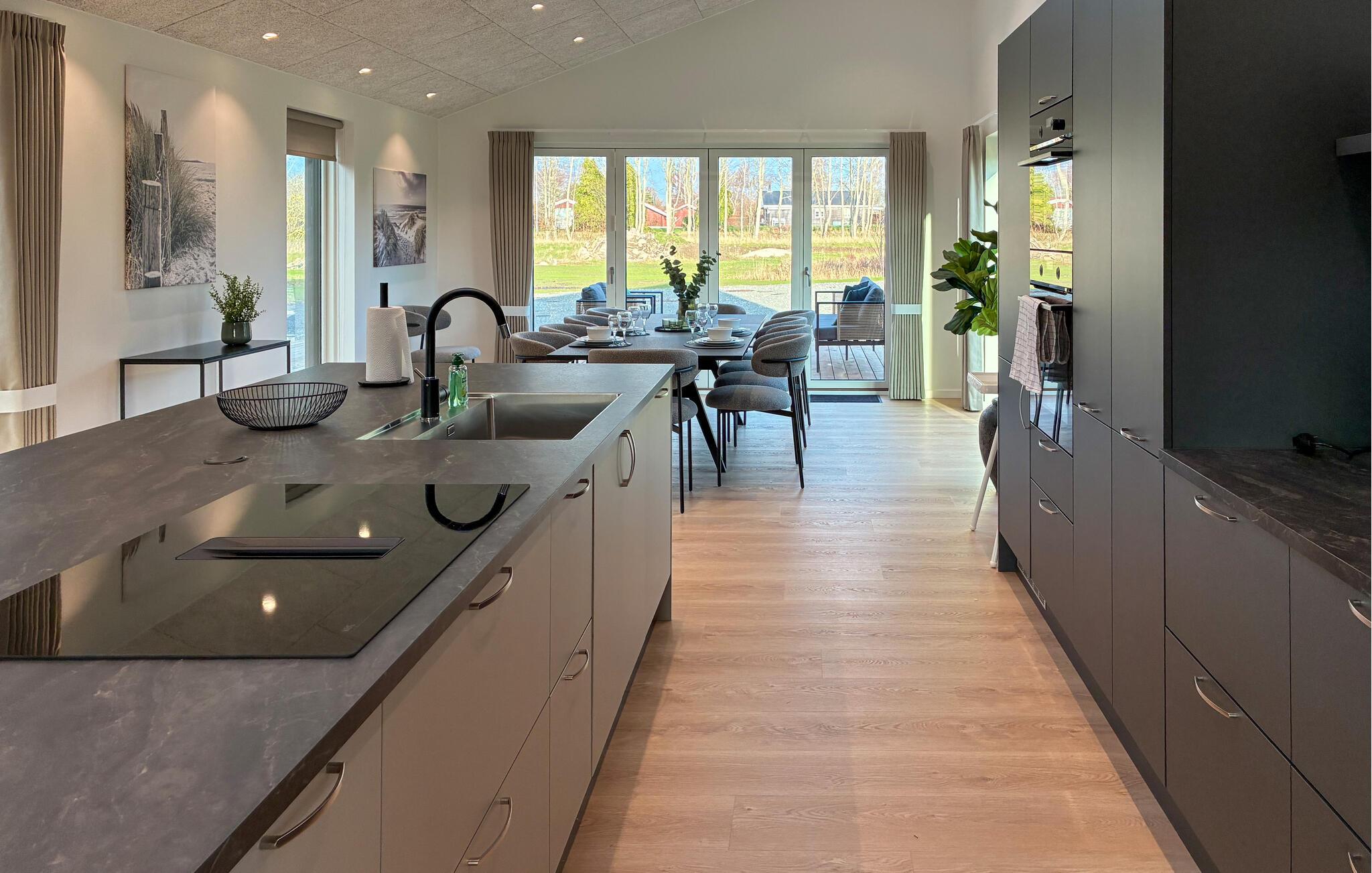 Nyd den behagelige stemning i det åbent indrettede hus. Tag plads i de komfortable sofaer, og nyd udsigten til det grønne. Høje lofter, afdæmpede farver og nøje udvalgte materialer skaber en rolig og elegant atmosfære. Brug det lange spisebord til fælles måltider eller lange aftener i hyggeligt samvær. Tilbered jeres måltider i det eksklusive køkken med kogeø og moderne faciliteter.