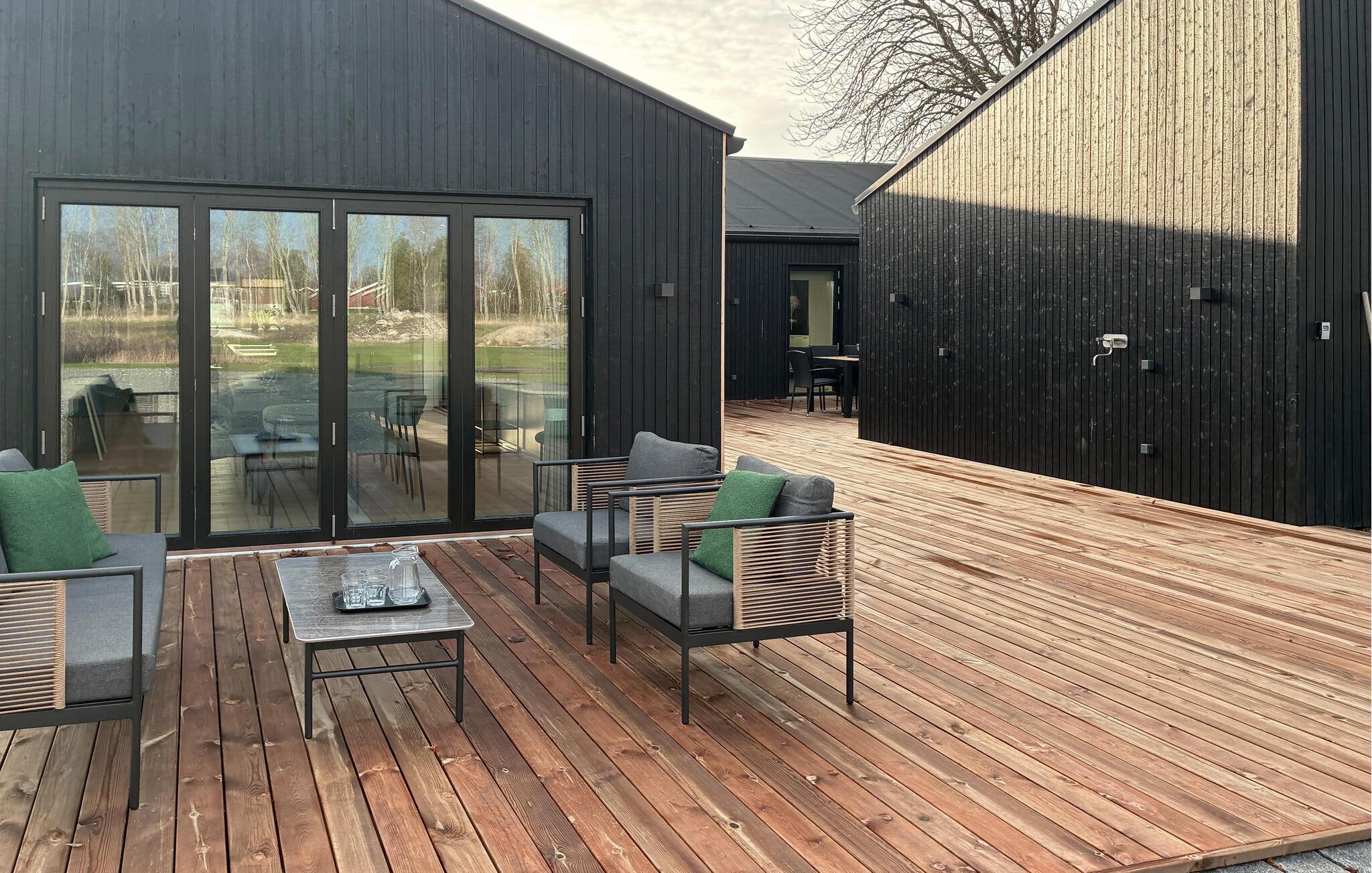 Træd ud i den beskyttede, træbeklædte gårdhave og find jeres yndlingsplads udenfor. Tilbring afslappede timer på loungemøblerne, og nyd den frie udsigt over den lille sø og det omkringliggende landskab. Udnyt den dejlige beliggenhed til afslappede aftener og rolige stunder under åben himmel.