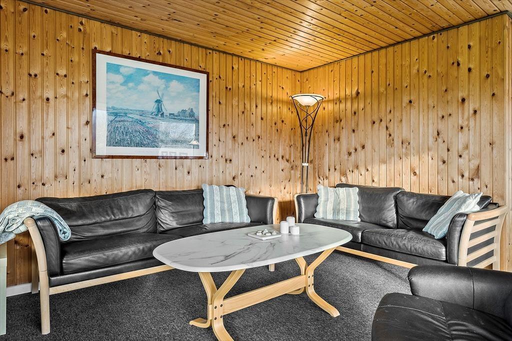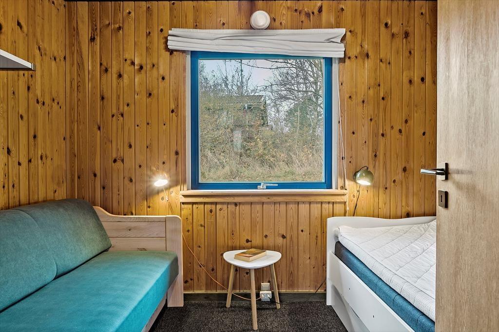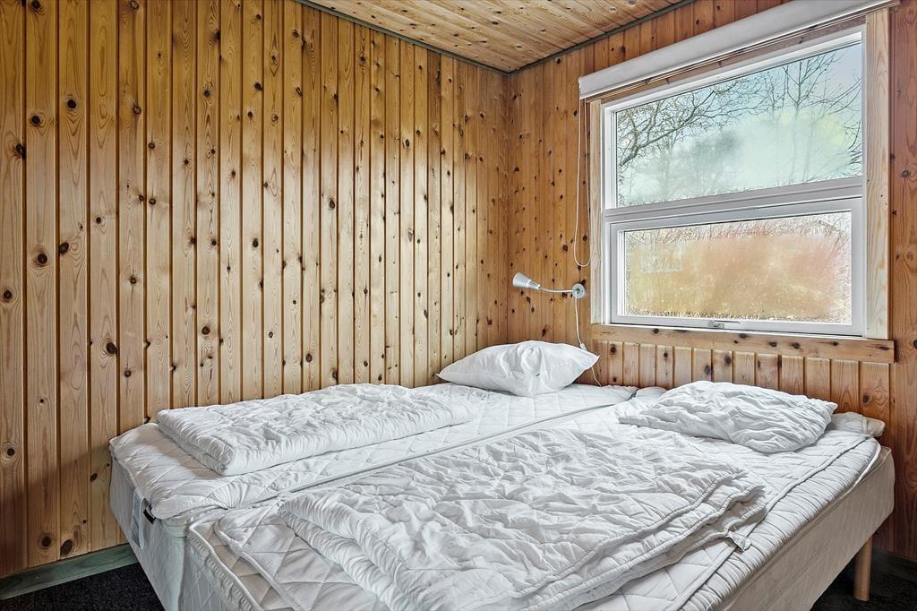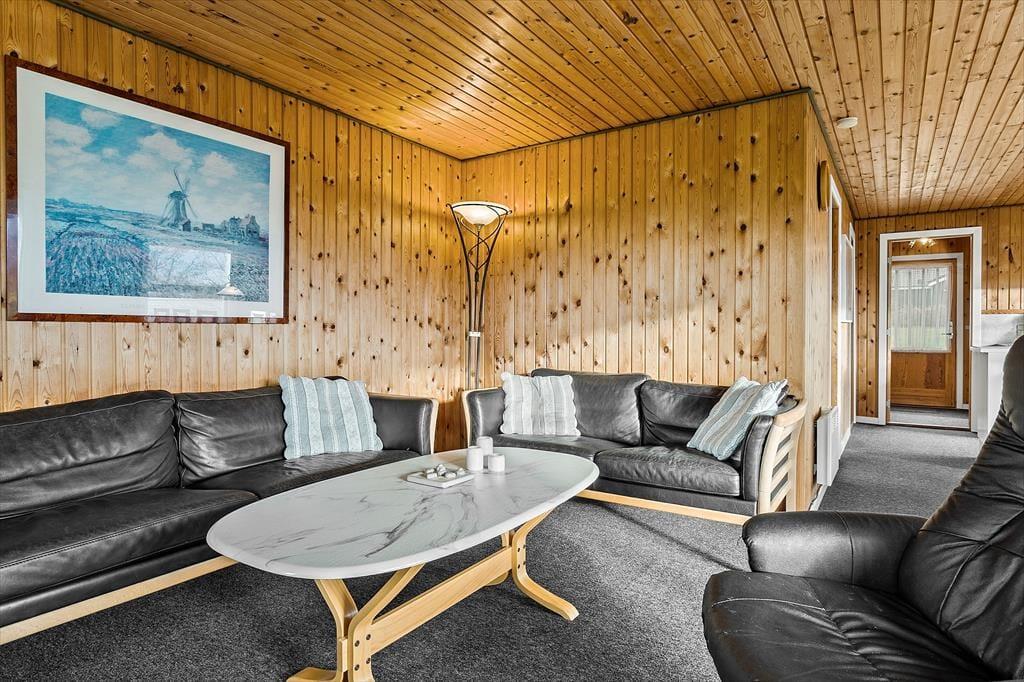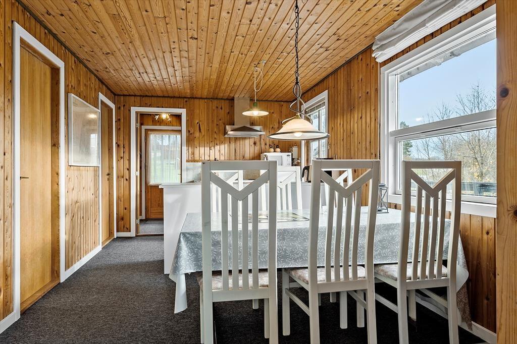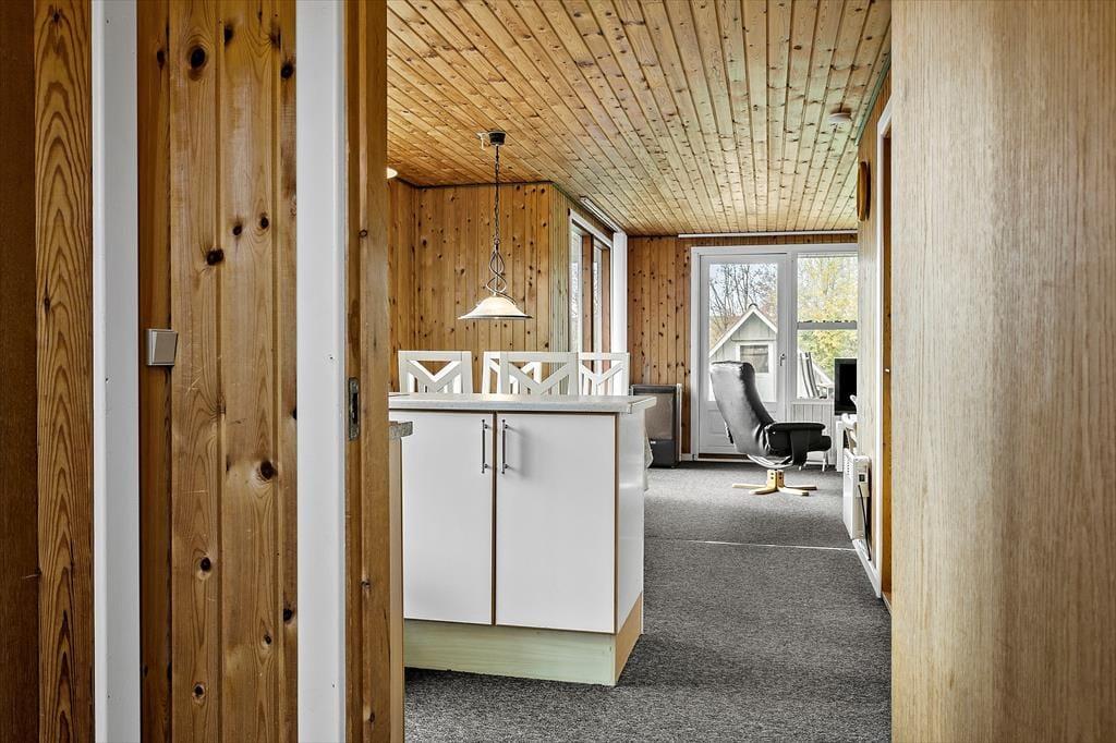 Sommerhuset har en lys og hyggelig indretning, der skaber en varm og indbydende atmosfære. Den åbne planløsning mellem stue og køkken giver et dejligt fællesskab, hvor I kan samles til hyggelige stunder. De store vinduer bringer masser af naturligt lys ind i rummet, og de varme farvetoner samt den enkle, men funktionelle møblering understøtter den afslappede stemning. Det er nemt at forestille sig afslappende aftener foran brændeovnen, mens I nyder et godt måltid sammen. Husets rummelighed gør det ideelt til en ferie med både familie og venner, og den komfortable indretning sikrer, at I kan føle jer hjemme.