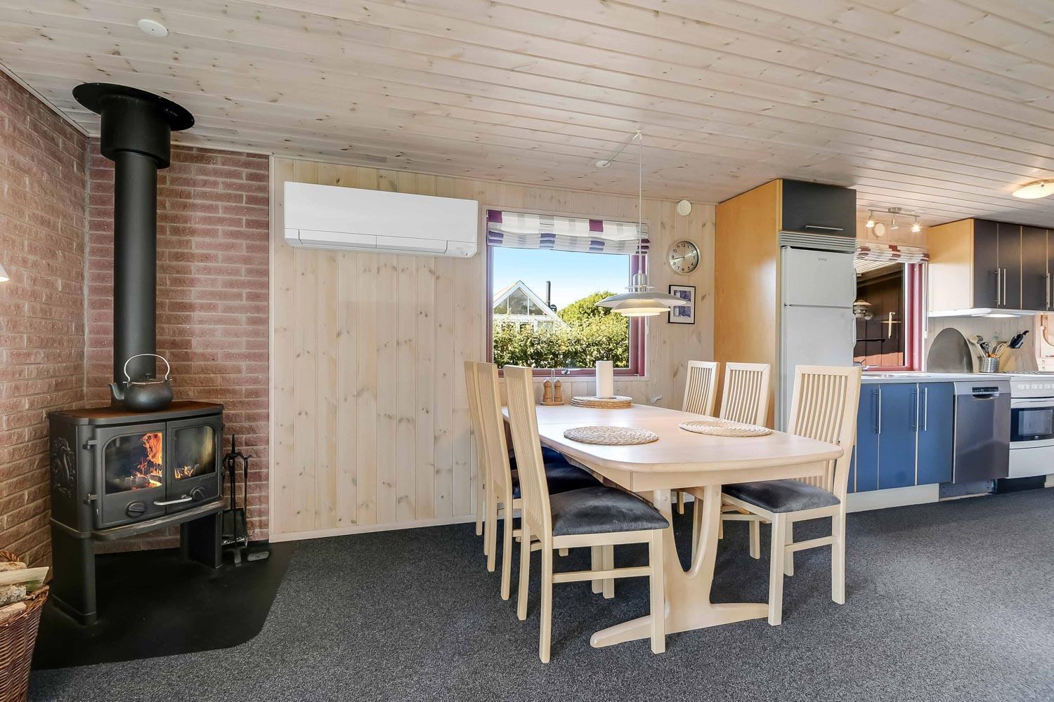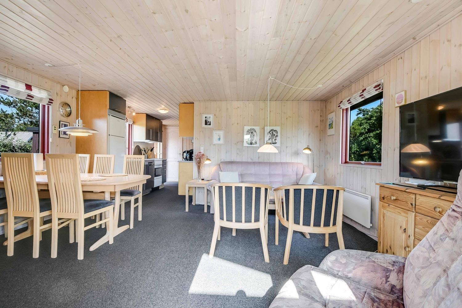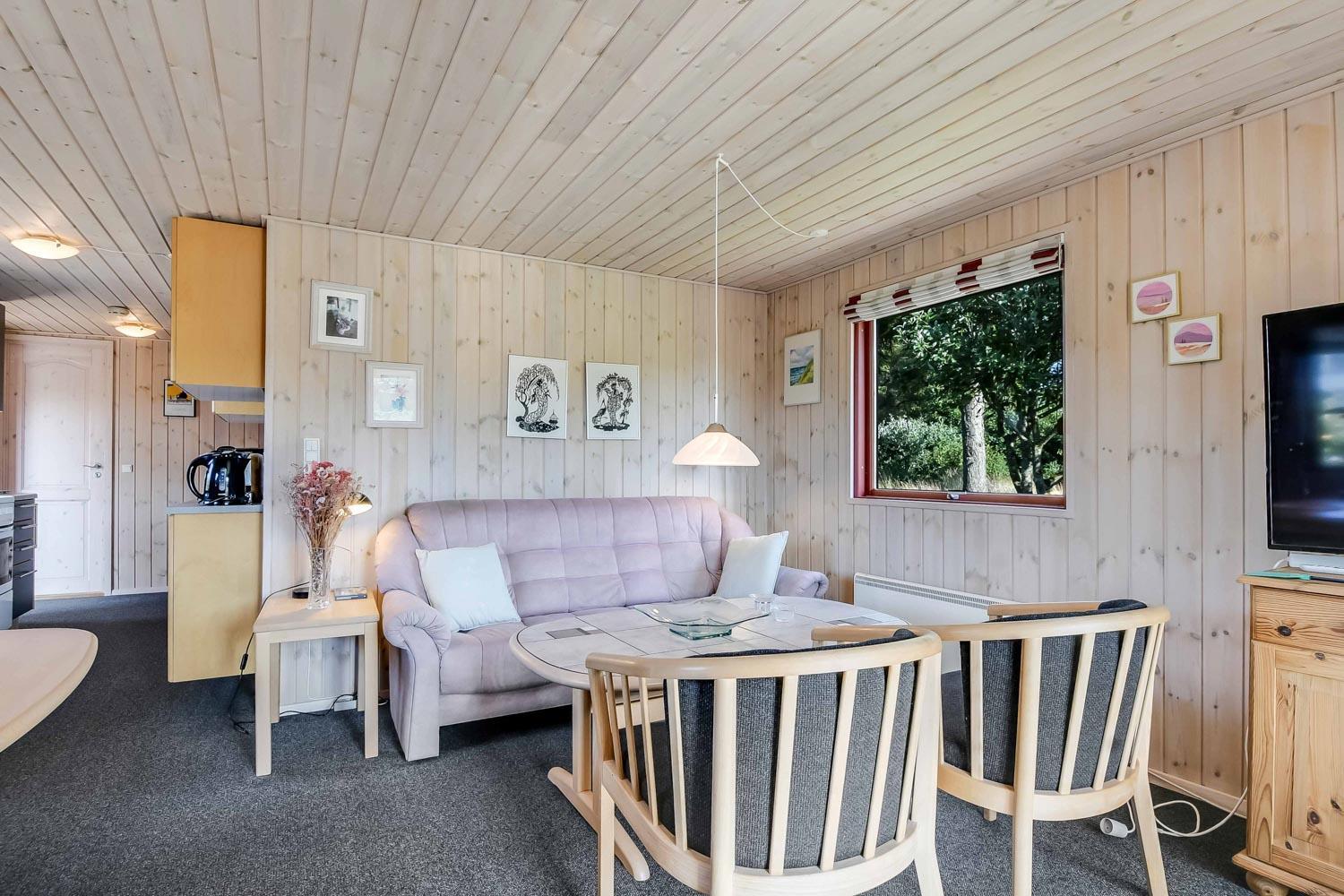 Køkken og stue er integreret i samme rum og det er er rigtig hyggelig og pænt indrettet. Her er polstermøbler med sofabord, fjernsyn og stereoanlæg med CD-afspiller. På TV'et kan man se både tyske og danske DR-kanaler. Slap af foran den knitrende brændeovn som sammen med varmepumpen hjælper med at reducere udgiften til varmeregningen. Herudover står spisebordet også i stuen. Fra stuen er der udgang til en dejlig havestue med et lille bord og et par stole herfra er der adgang til et af soverummene.