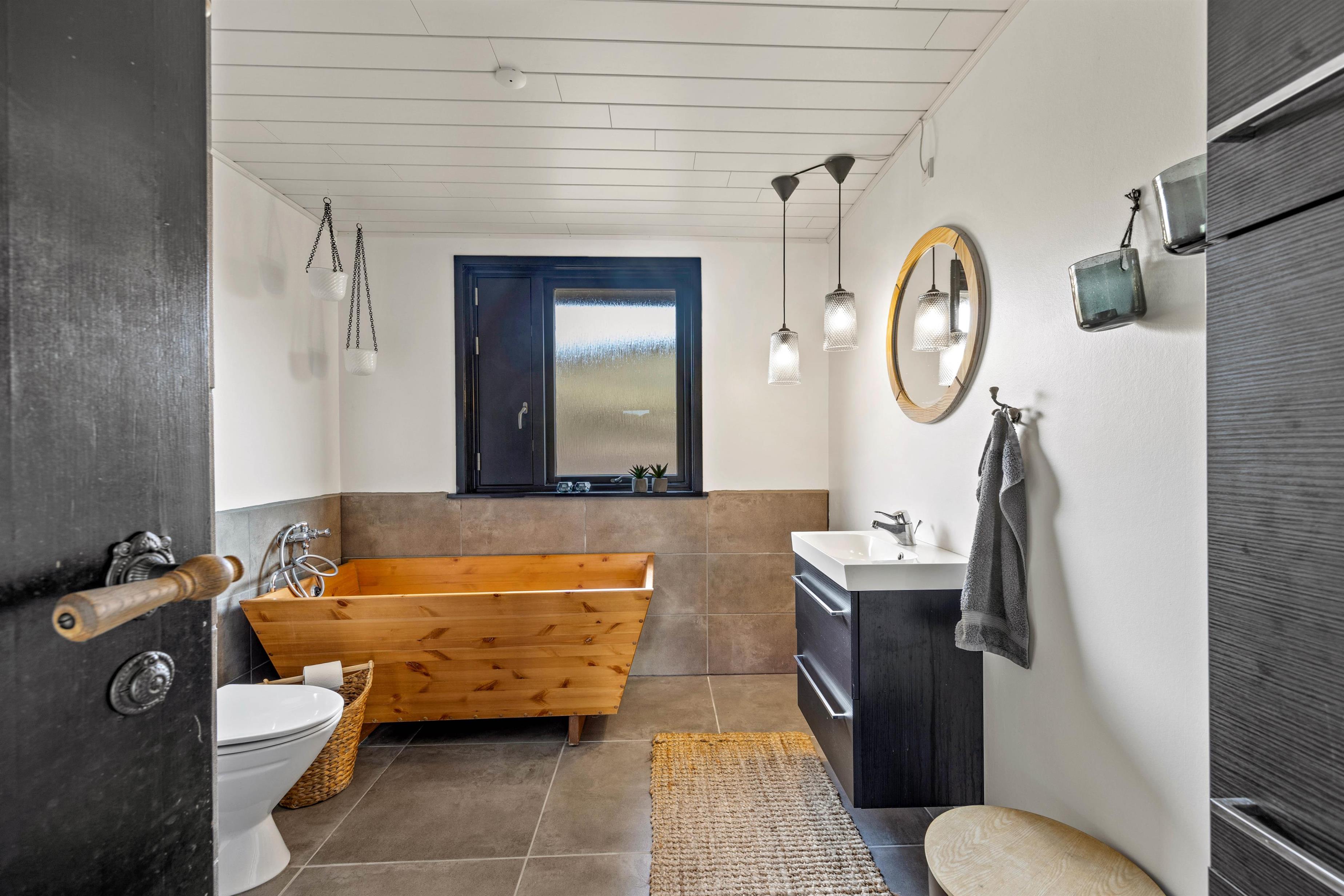 I det rummelige badeværelse med gulvvarme er der wellness-stemning med et rustikt træbadekar. I soveværelserne er der 4 gode sengepladser, hvor I kan få hvilet rigtig godt ud i den friske vesterhavsluft.