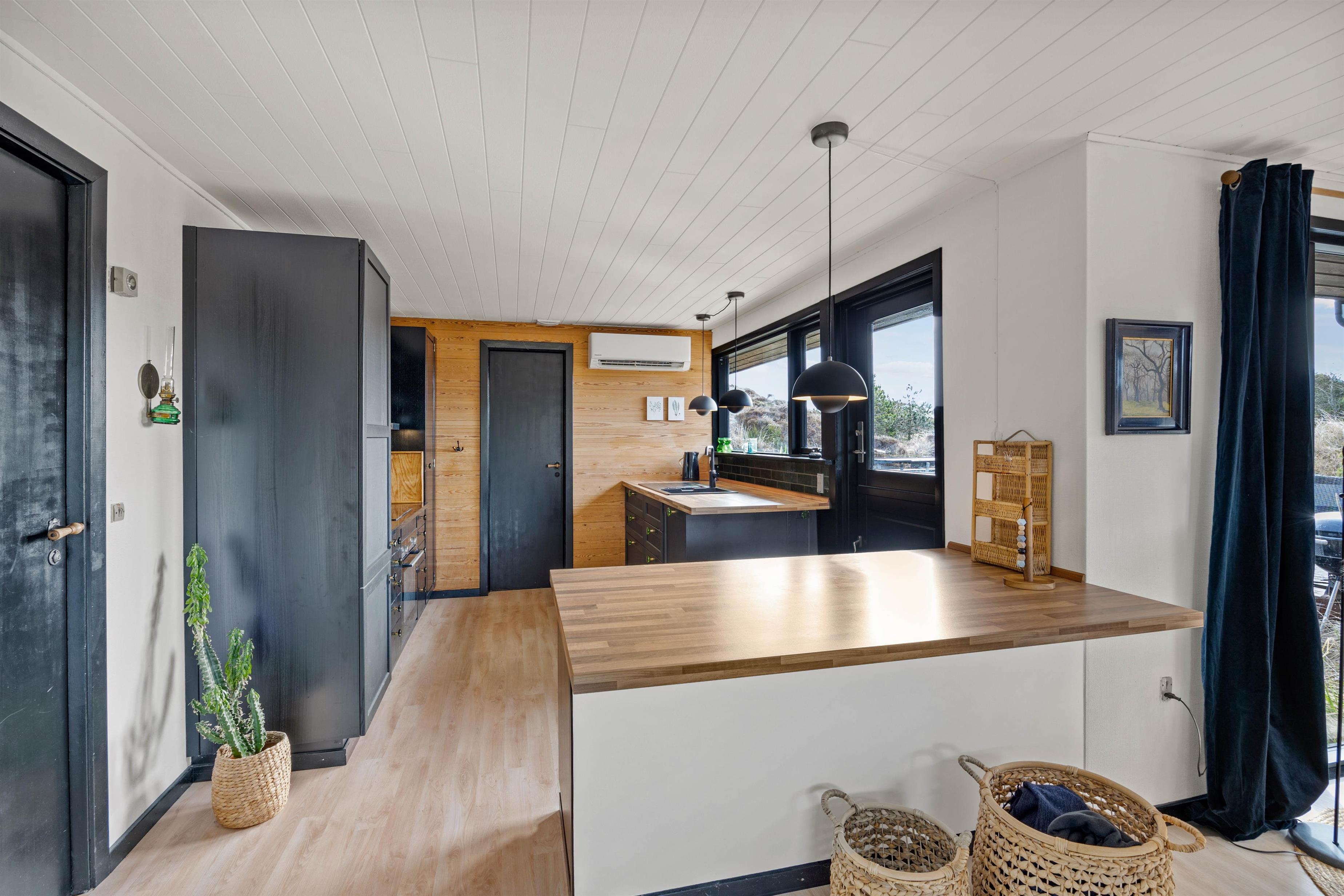Straks ved ankomsten bydes I velkommen af feriehusets helt specielle, rustikke stemning. Her er kræset for detaljerne med materiale- og farvevalg af høj kvalitet. Det åbne køkken i forbindelse med stuen bliver jeres naturlige samlingssted. De brede vinduespartier mod både syd, øst og vest giver dagen lang et rigtig fint lysindfald. Fra siddepladserne ved det ovale spisebord kan I både følge med i, hvad der sker i køkkenet og i den hyggelige sofagruppe ved brændeovnen.